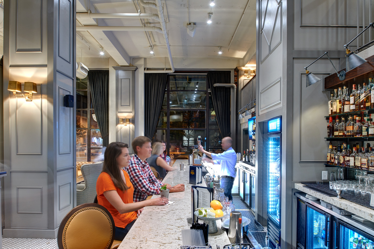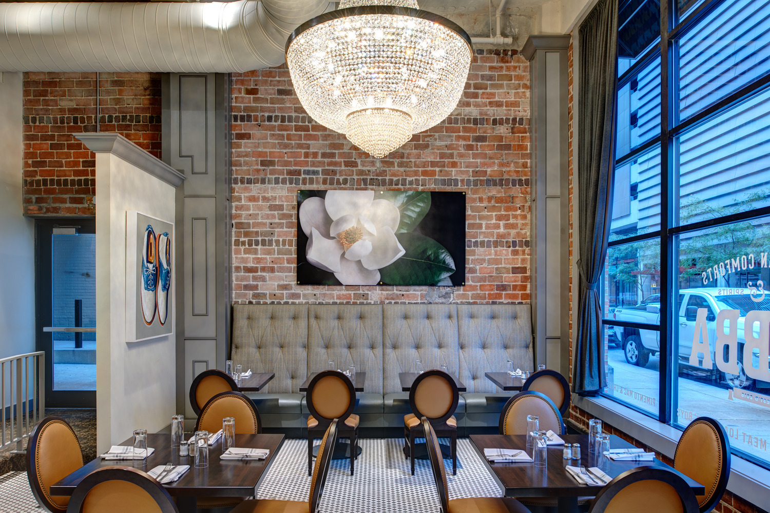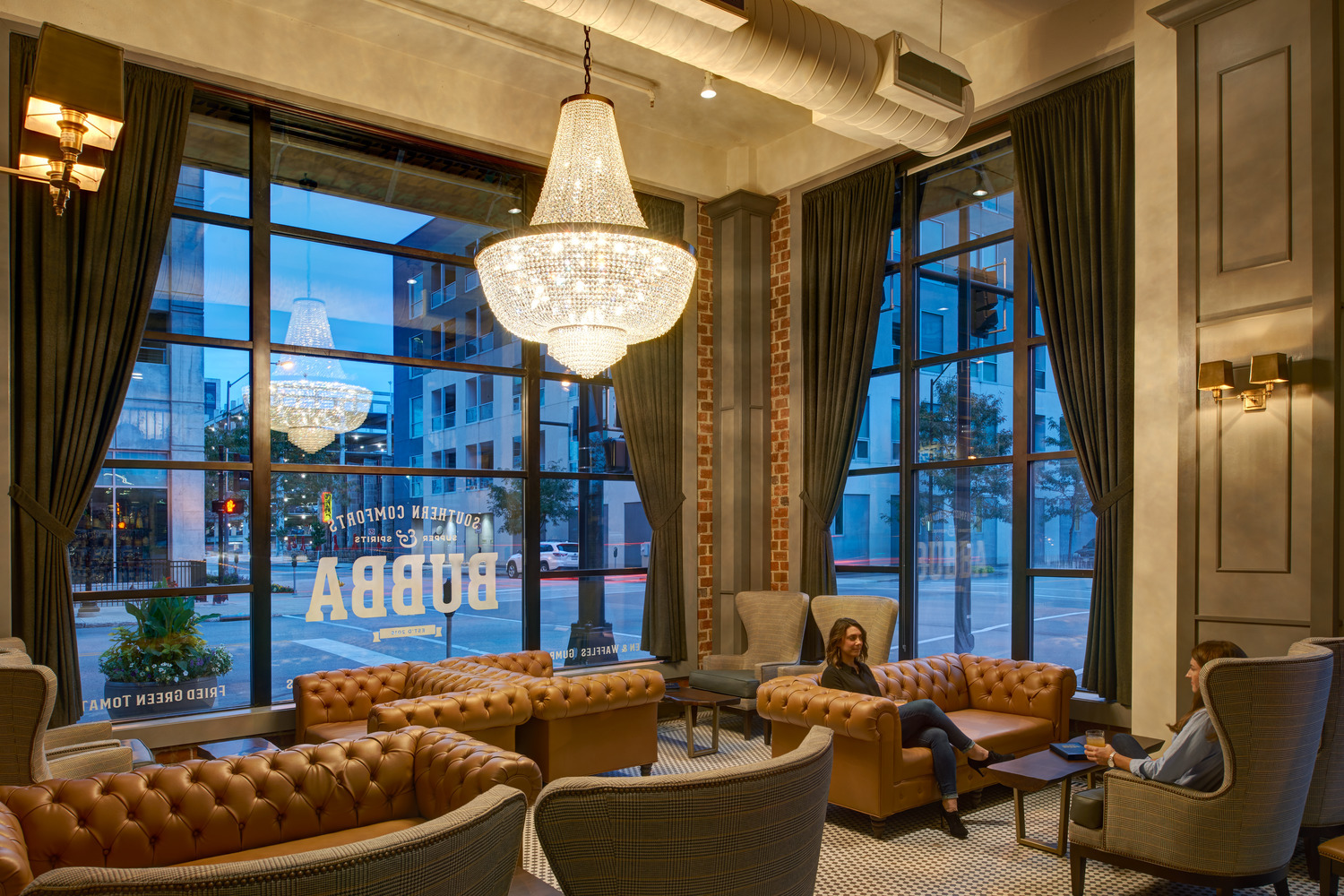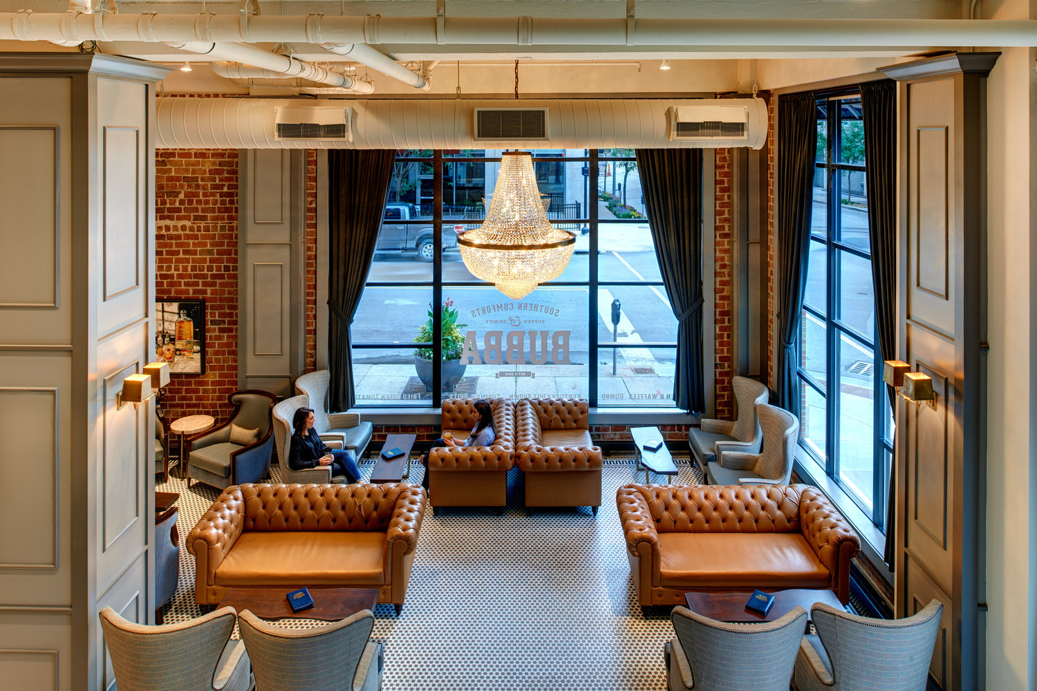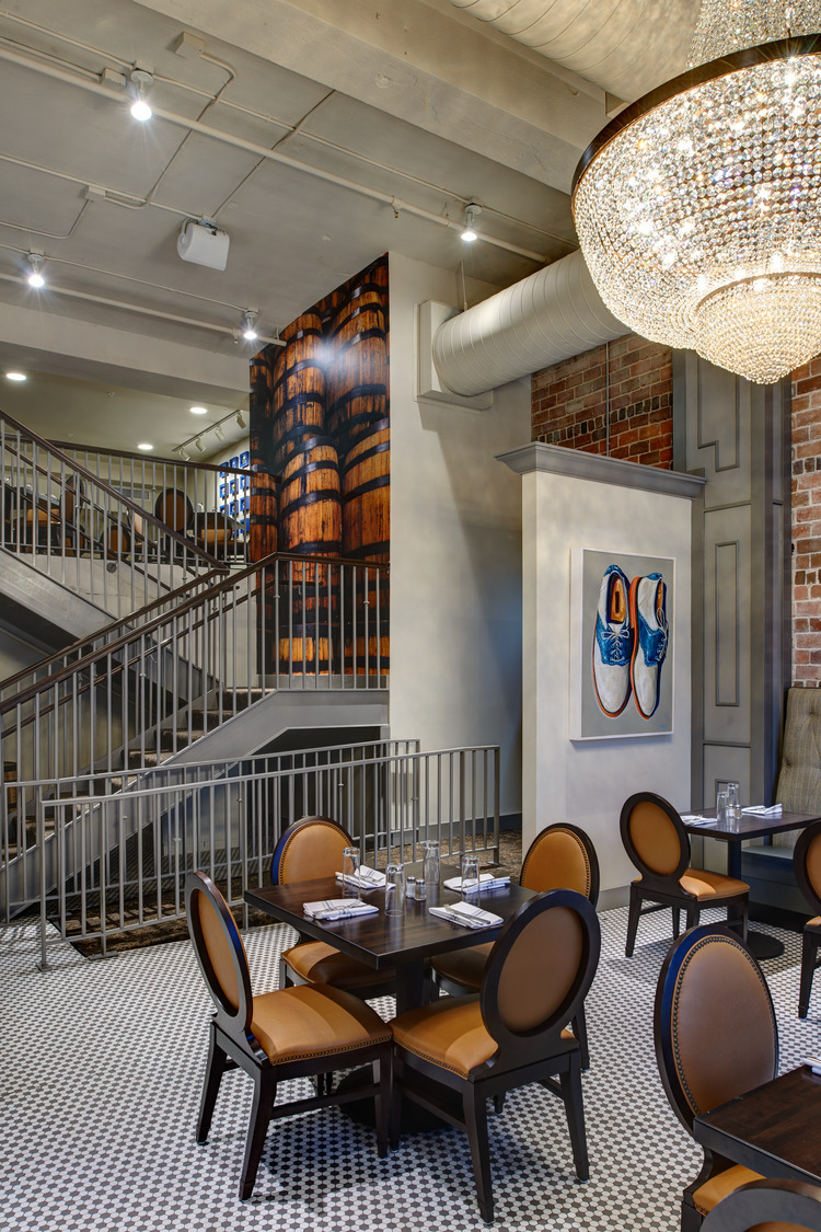 The restaurant owner had in mind a specific, distinctive atmosphere for the new restaurant and bar. To achieve his vision, the design team used two oversized custom chandeliers as focal points for guests and as beacons for pedestrians on the heavily-utilized 10th Street pedestrian walkway. Original hexagon tile and exposed exterior brick walls proudly display the rich historic fabric of this building, which is maintained on the National Register of Historic Places. Chesterfield-style sofas, high wing-back chairs, and custom plaid banquettes created an intimate dining space as unique as the menu.