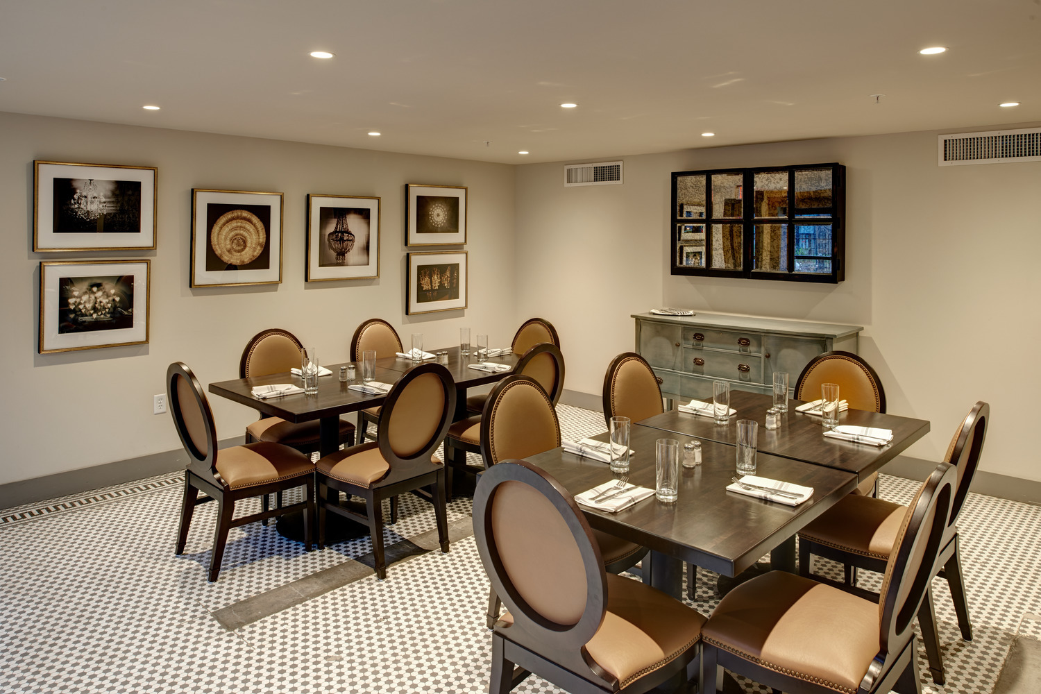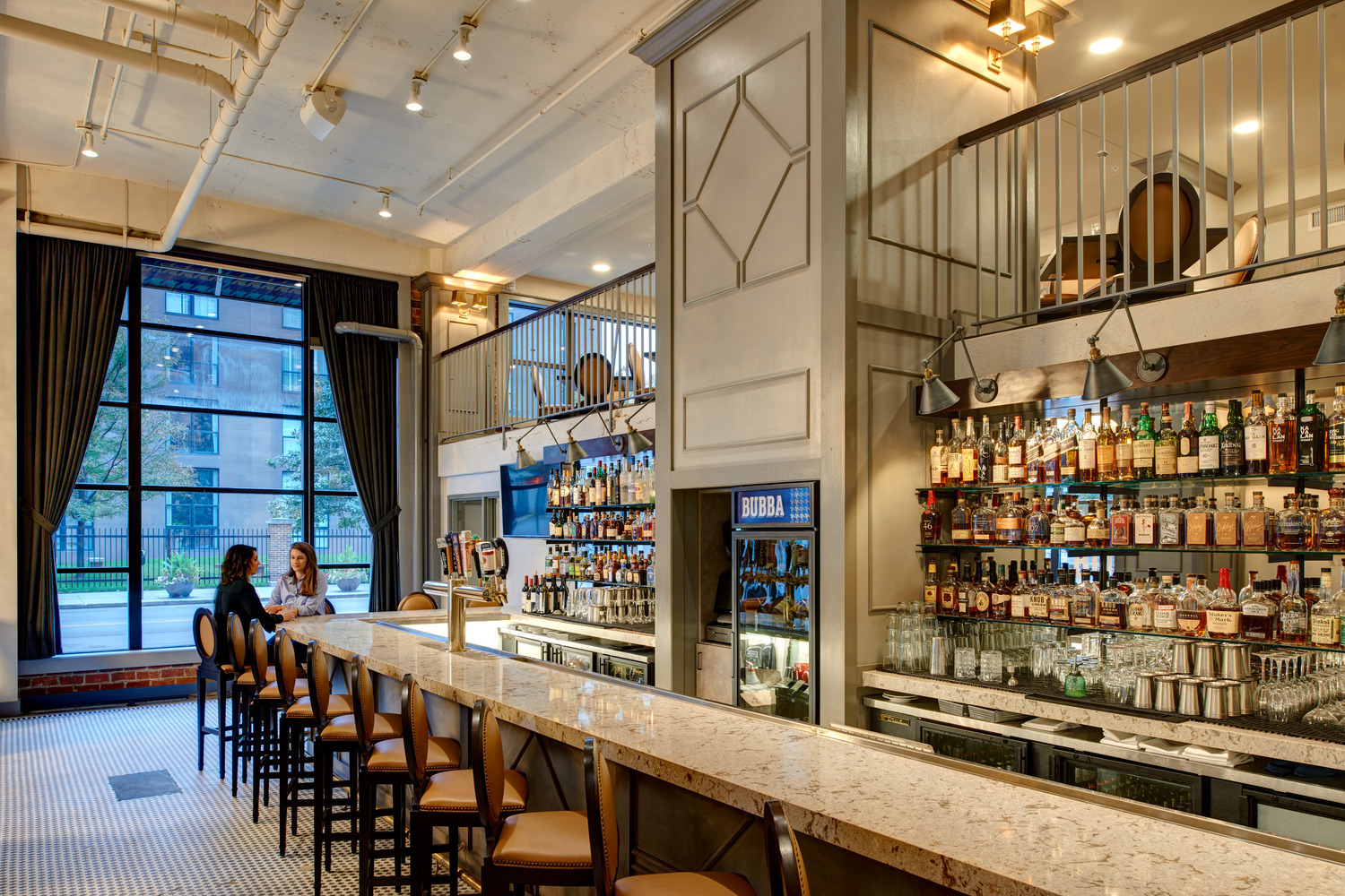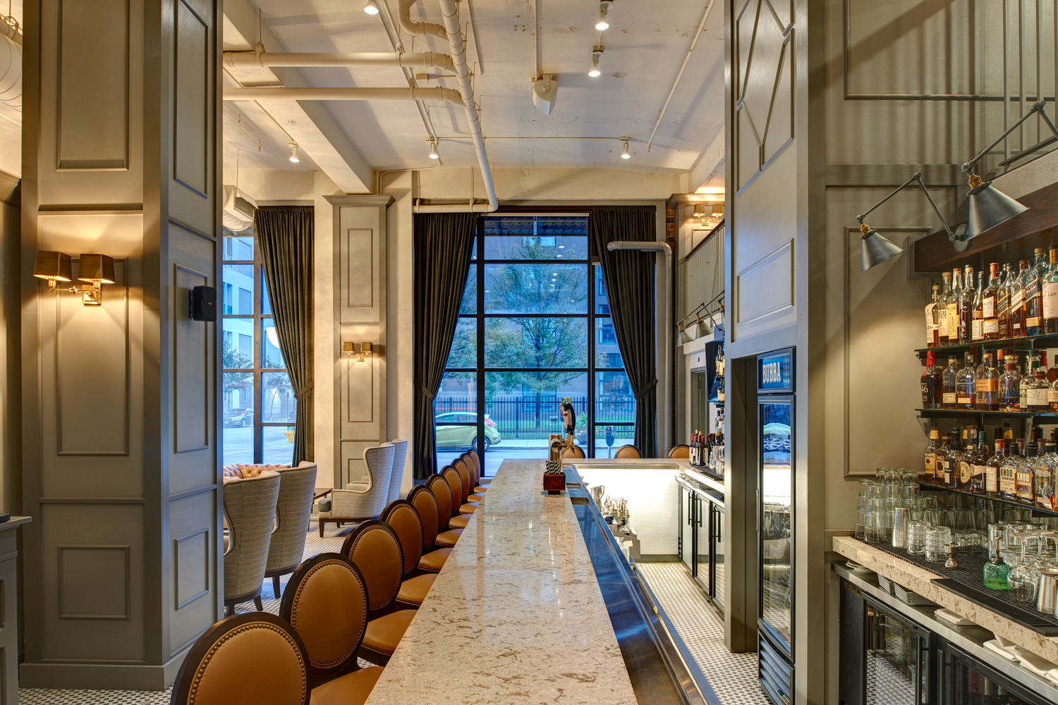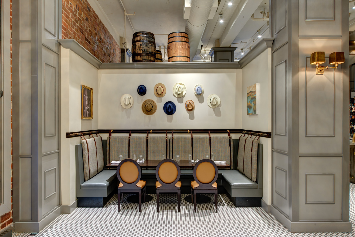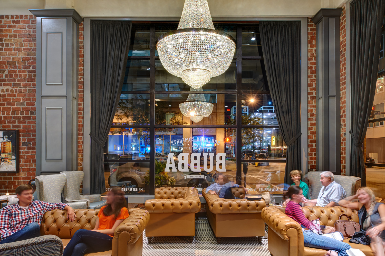 The restaurant owner had in mind a specific, distinctive atmosphere for the new restaurant and bar. To achieve his vision, the design team used two oversized custom chandeliers as focal points for guests and as beacons for pedestrians on the heavily-utilized 10th Street pedestrian walkway. Original hexagon tile and exposed exterior brick walls proudly display the rich historic fabric of this building, which is maintained on the National Register of Historic Places. Chesterfield-style sofas, high wing-back chairs, and custom plaid banquettes created an intimate dining space as unique as the menu.