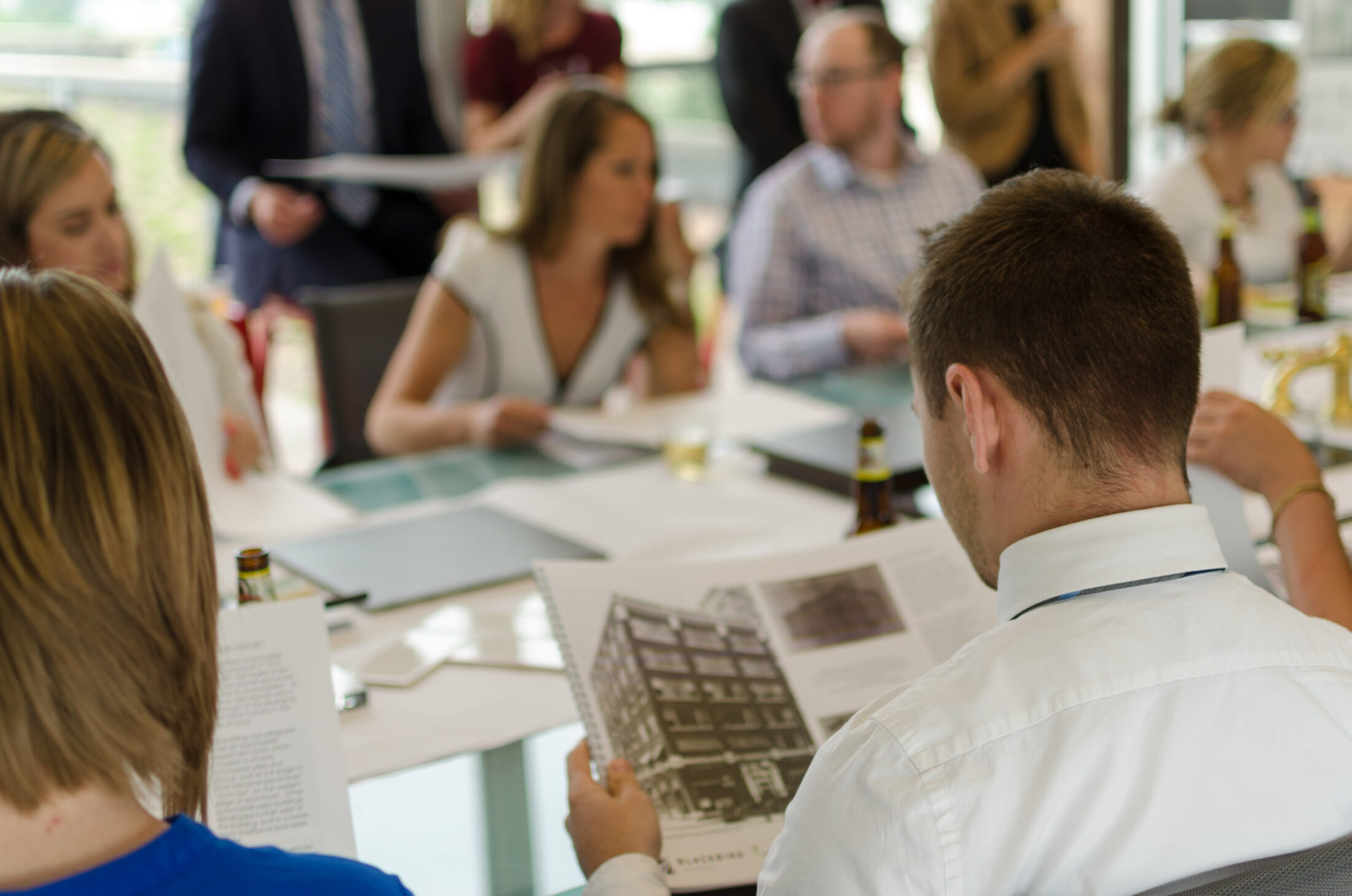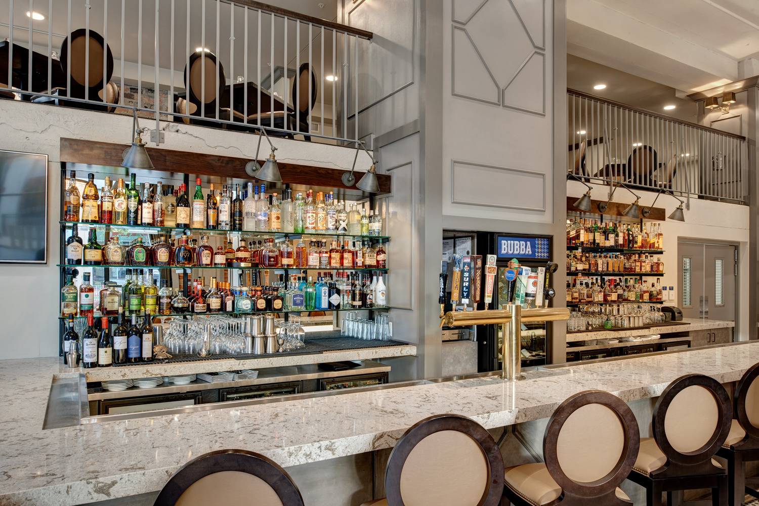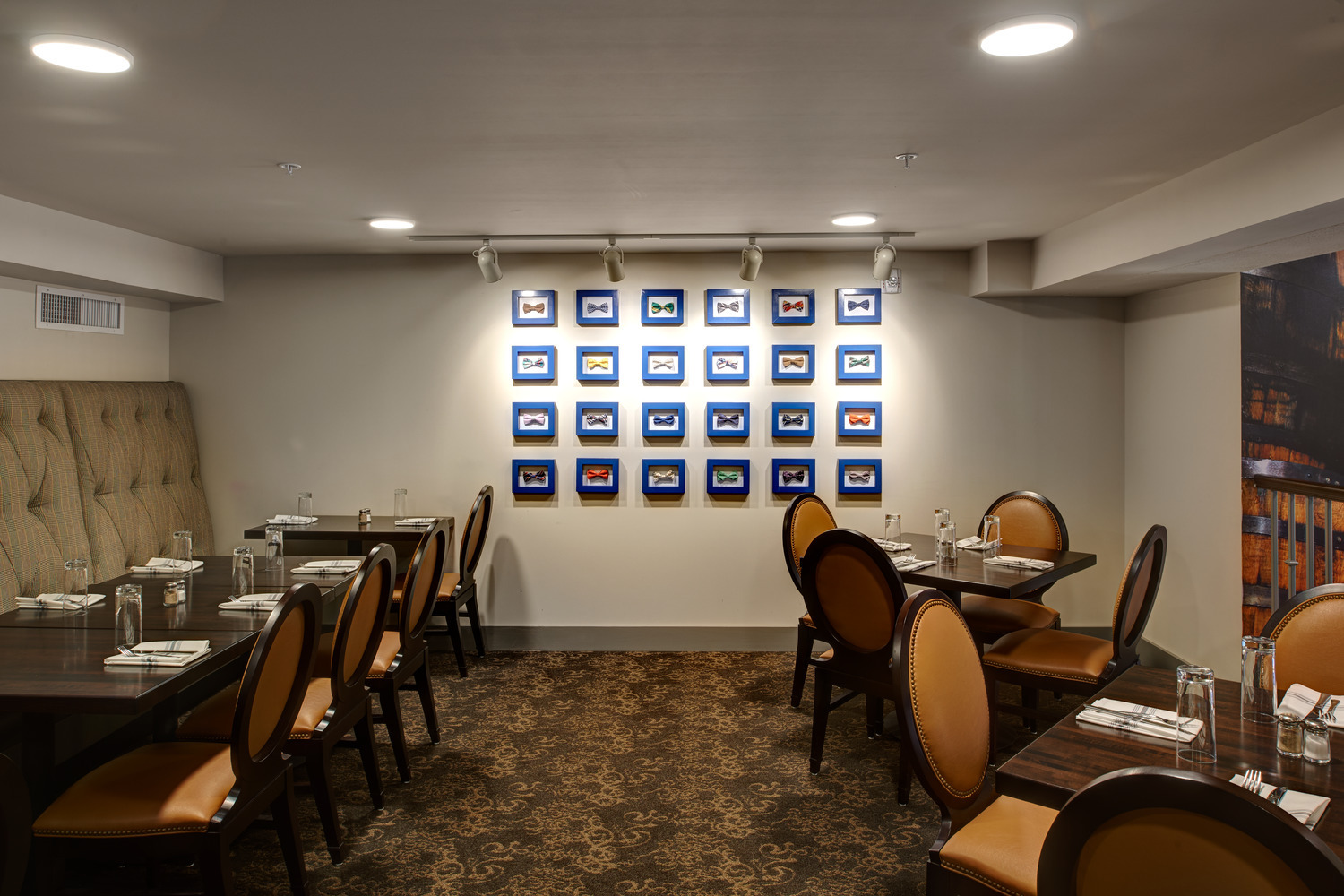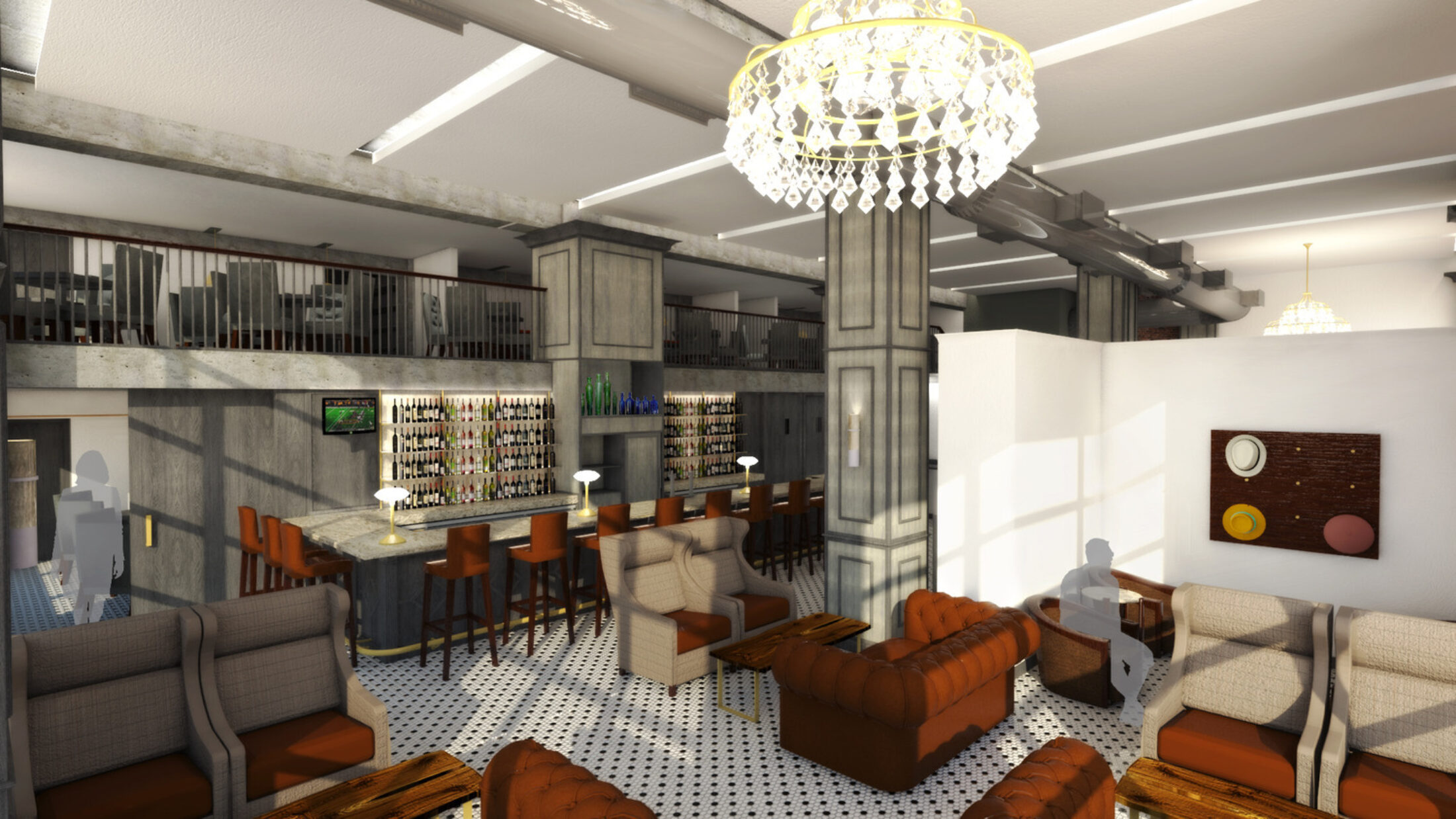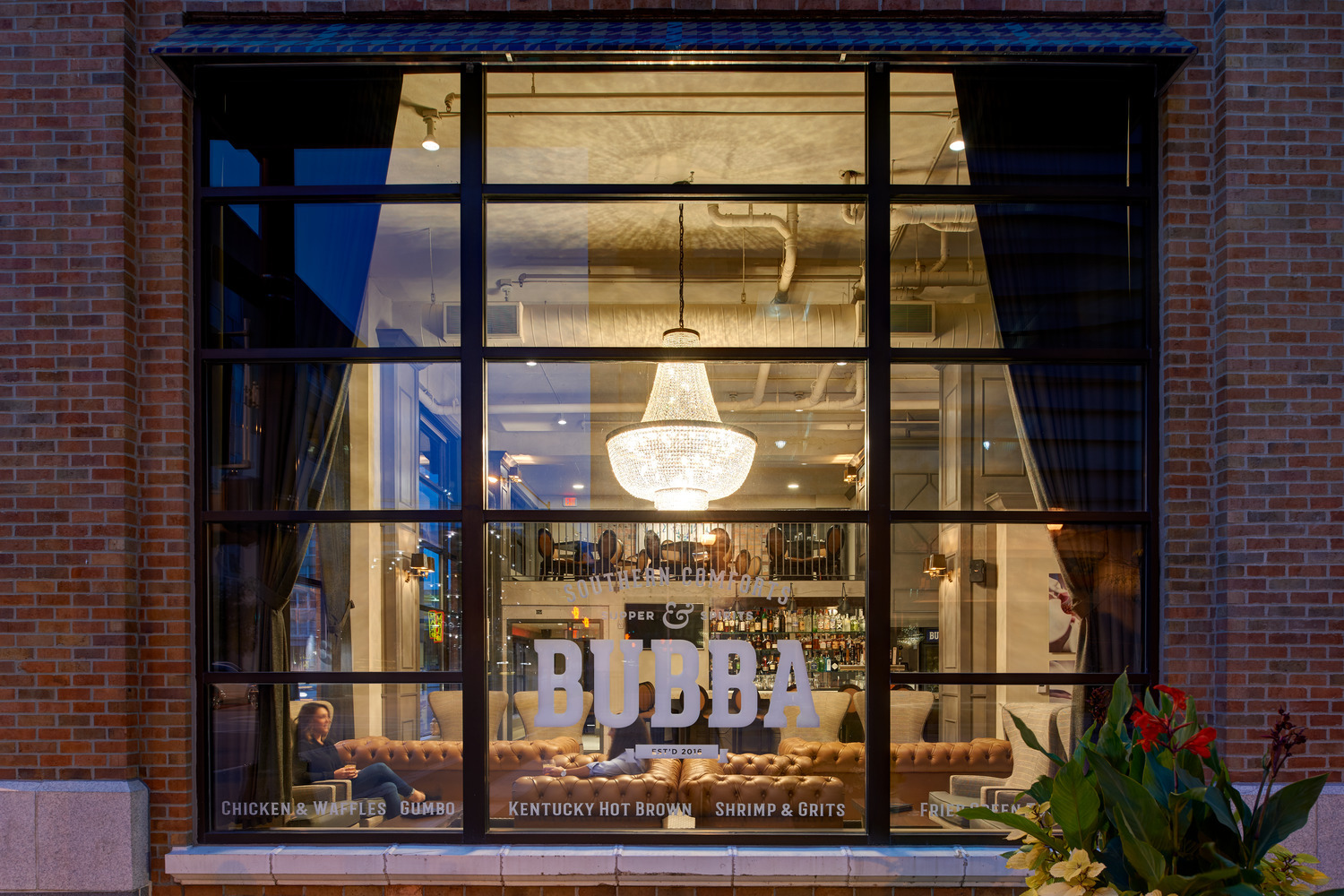 The restaurant owner had in mind a specific, distinctive atmosphere for the new restaurant and bar. To achieve his vision, the design team used two oversized custom chandeliers as focal points for guests and as beacons for pedestrians on the heavily-utilized 10th Street pedestrian walkway. Original hexagon tile and exposed exterior brick walls proudly display the rich historic fabric of this building, which is maintained on the National Register of Historic Places. Chesterfield-style sofas, high wing-back chairs, and custom plaid banquettes created an intimate dining space as unique as the menu.