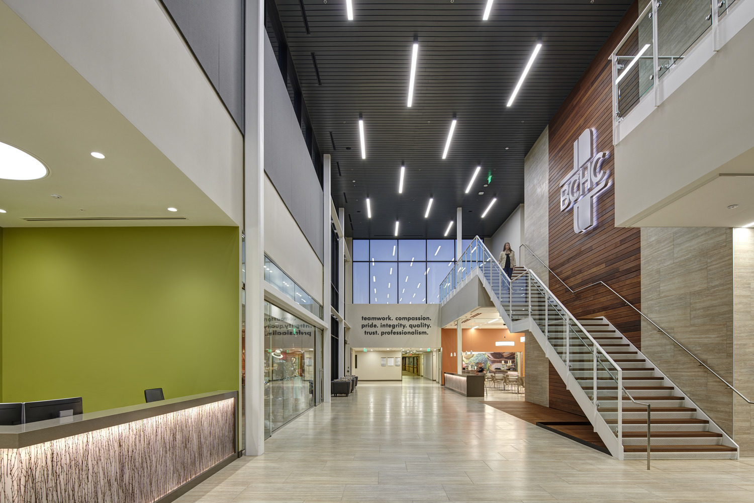 To achieve BCHC’s goal of creating a campus setting with a strong identity, the design created a new main entry and public concourse, from which all patient services are accessed. The addition is oriented to maximize views and also utilizes natural daylighting strategies. The renovation work included two new surgical procedure rooms and support areas and a complete reconfiguration of the pre- and post-op areas, which made the department more flexible. Also, renovation and expansion to the existing dining room now allows for service to the entire community. In both the addition and renovation, the focus was always on improving the patient experience, serving the local community, and emphasizing wellness in every aspect of the design.