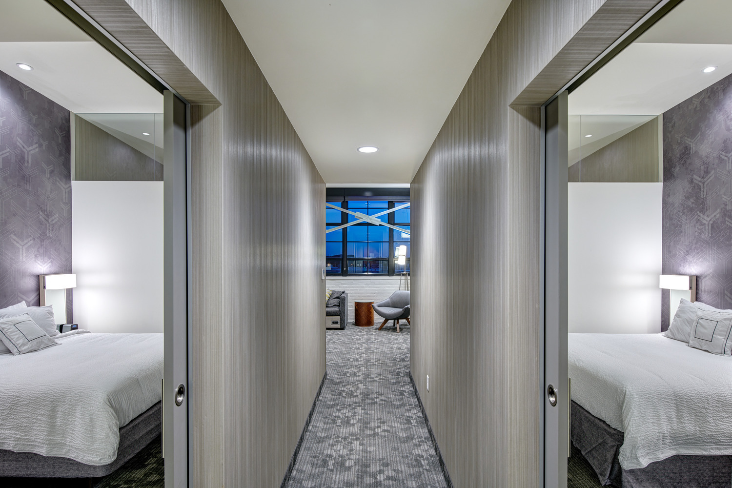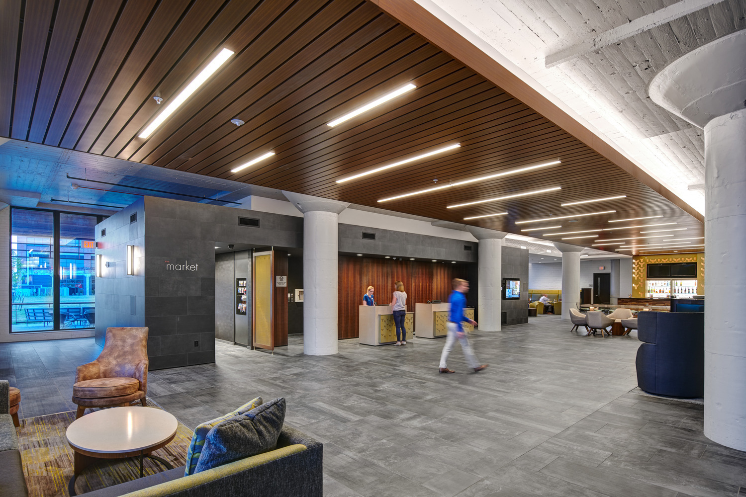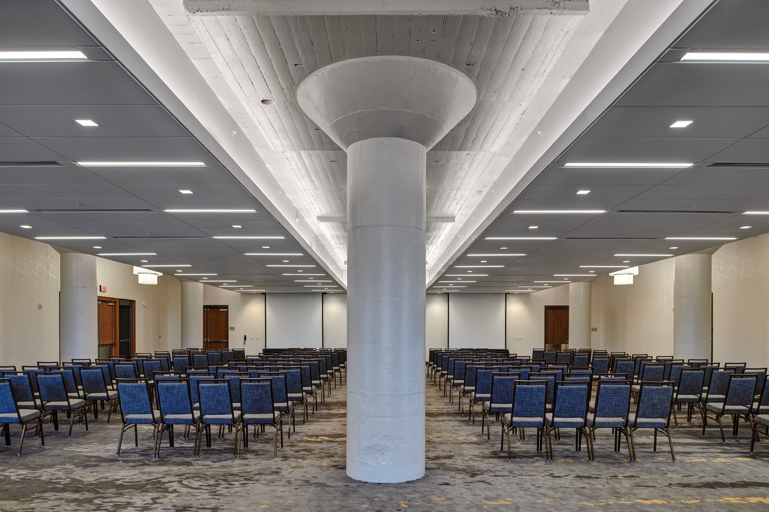 With historic tax credit assistance and other state funding, the team restored the building shell and carefully blended its industrial historic features with the new hotel’s luxurious interior design. The project team’s creative raised-floor solution solved two challenges on the project. First, using the space for mechanical infrastructure allowed the unique columns and building structure to remain uncluttered and visually exposed overhead. Additionally, the raised floors allow for panoramic views of the river and downtown by reducing the existing window sill height (of over five and a half feet) without altering the historic windows.