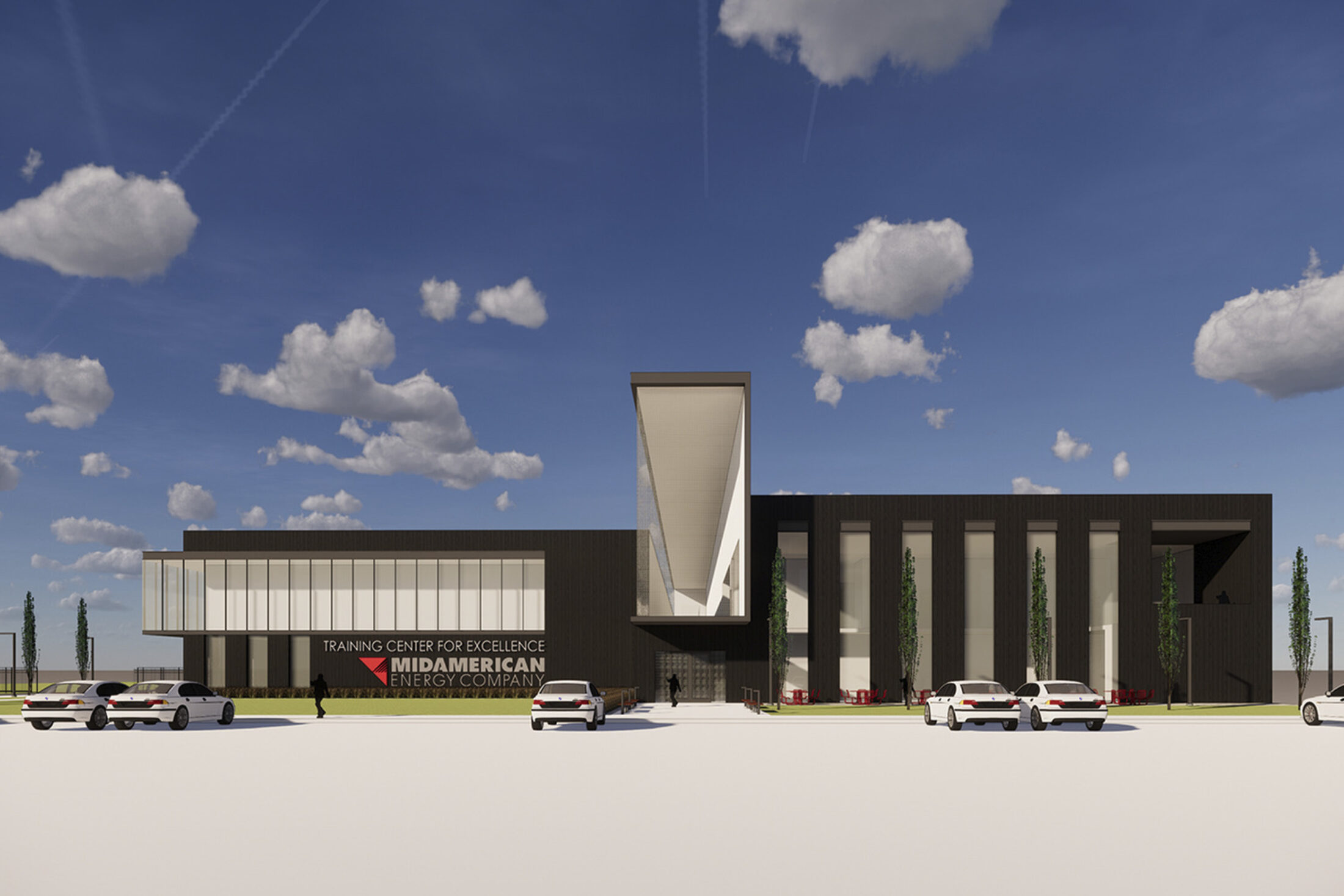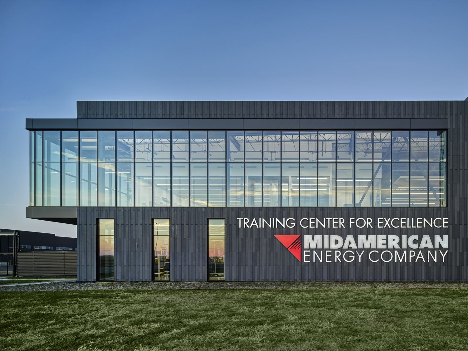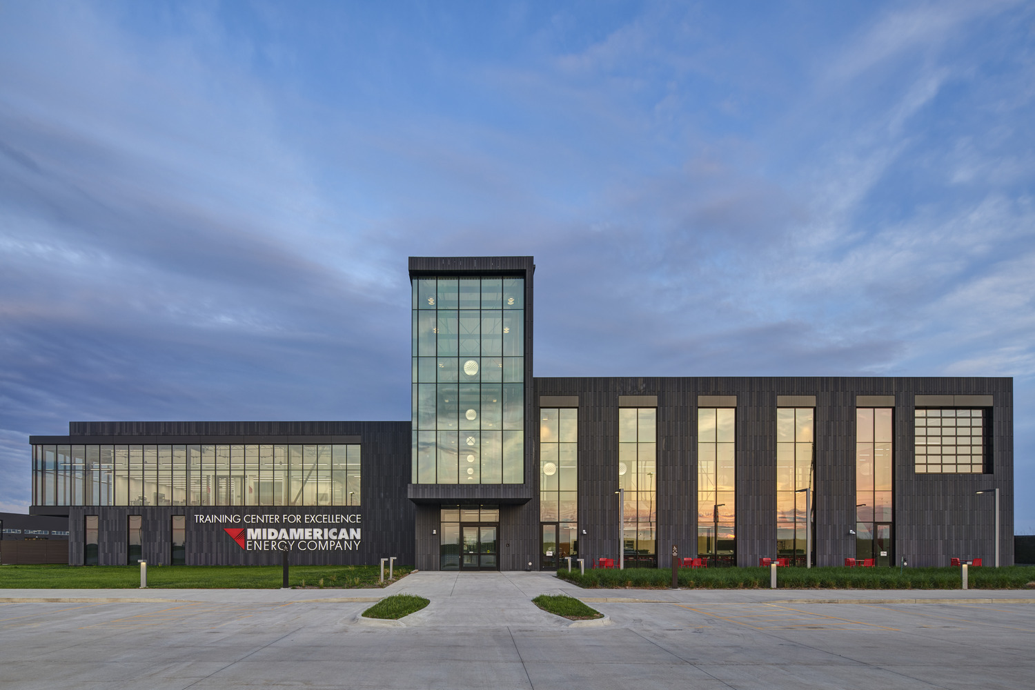 INVISION was commissioned by MidAmerican Energy Company to design a new 143,000sf facility for company-wide training, to accommodate a wide range of electrical and gas delivery programs. Located in rural Iowa, the facility needed to make a bold statement for the client, but also settle into the surrounding agricultural context.