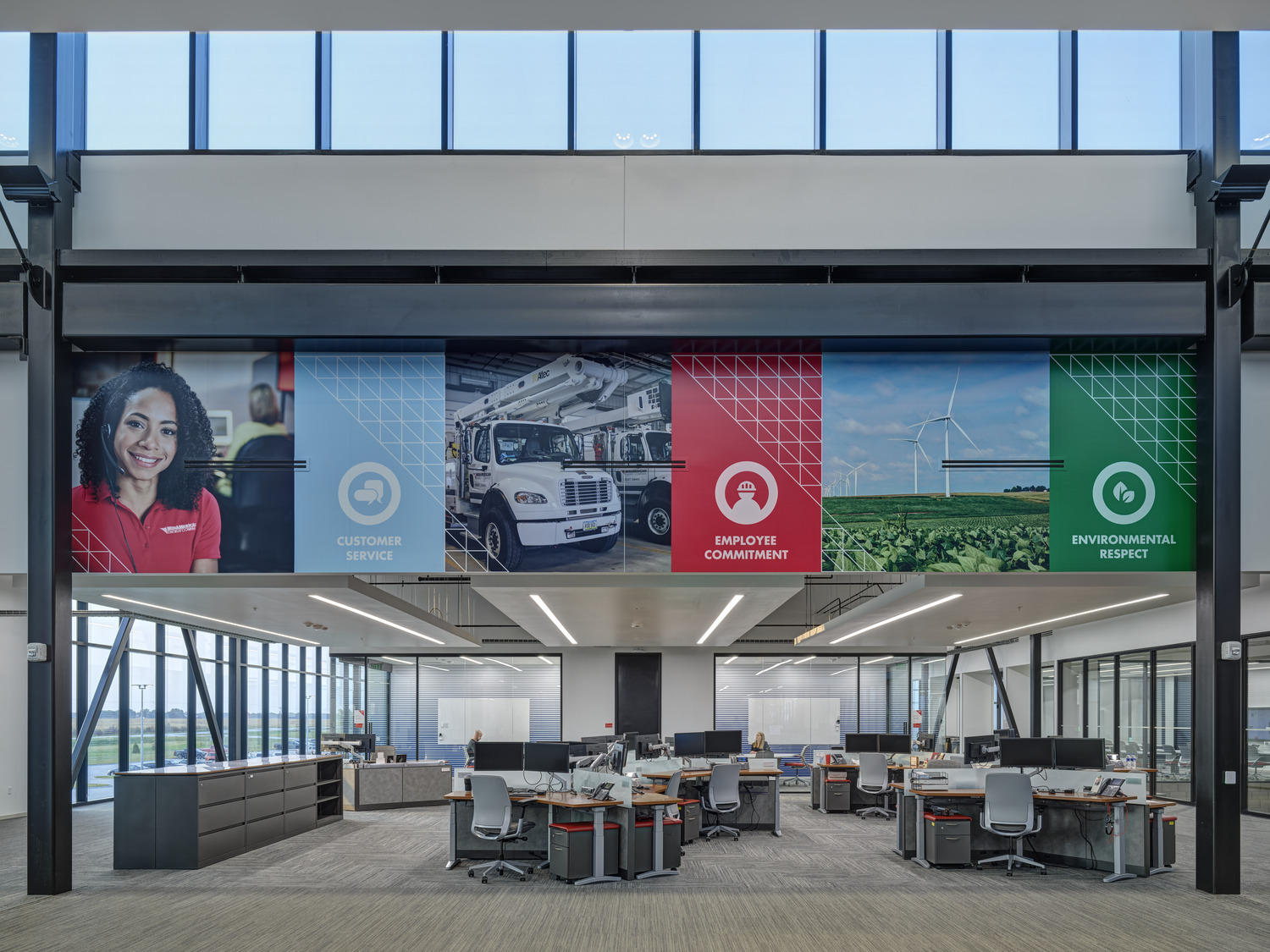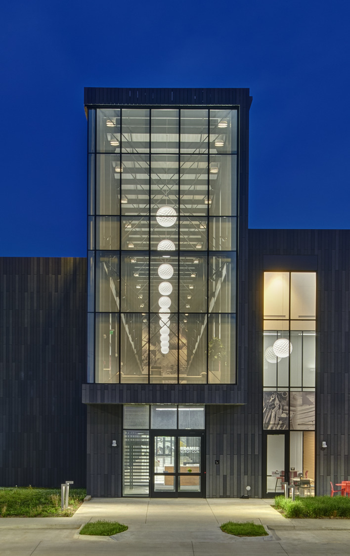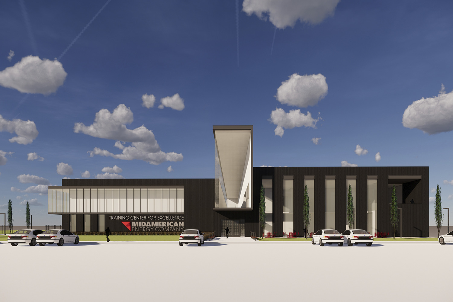 INVISION was commissioned by MidAmerican Energy Company to design a new 143,000sf facility for company-wide training, to accommodate a wide range of electrical and gas delivery programs. Located in rural Iowa, the facility needed to make a bold statement for the client, but also settle into the surrounding agricultural context.
