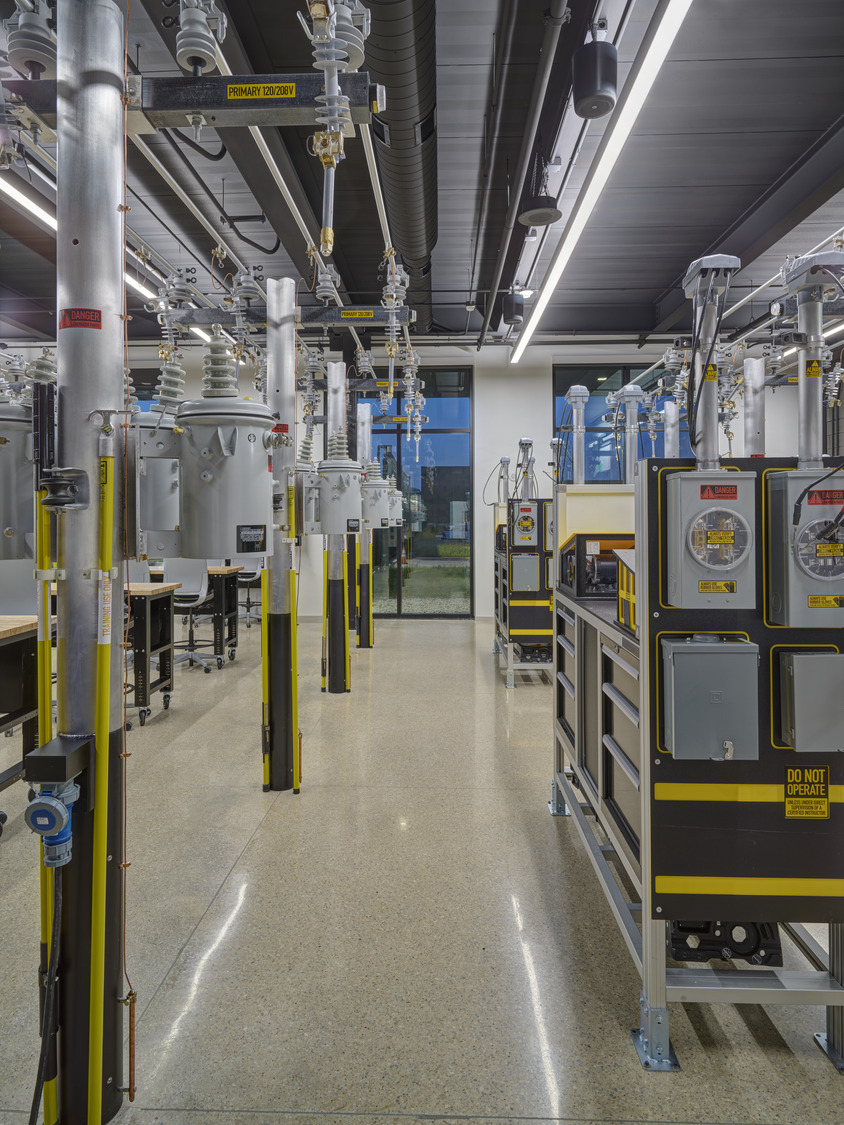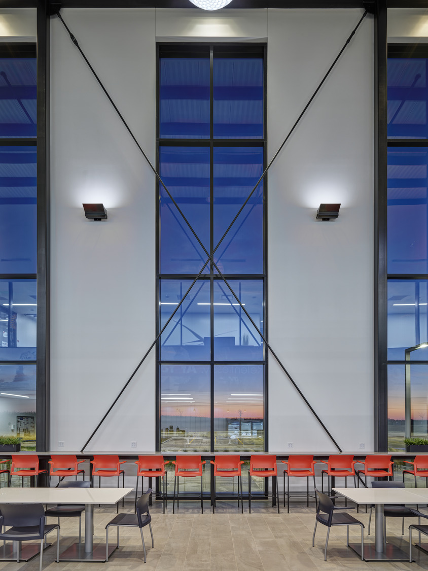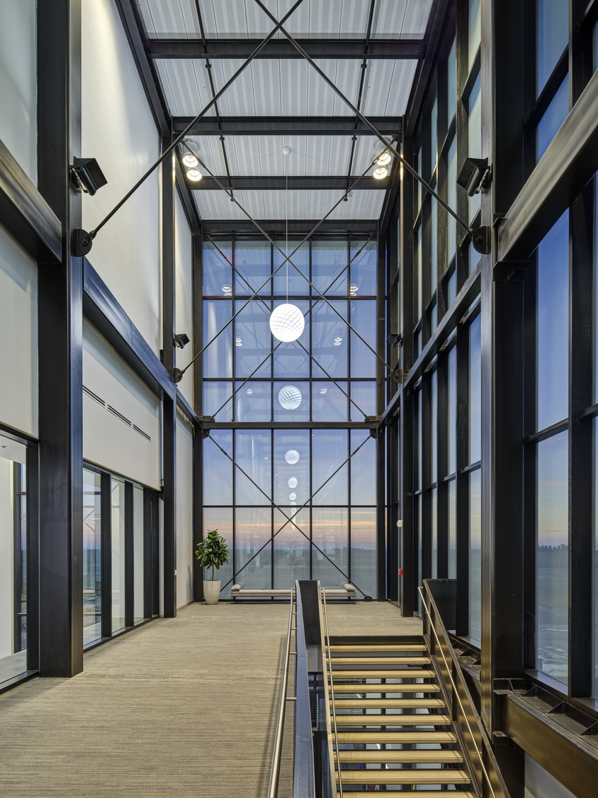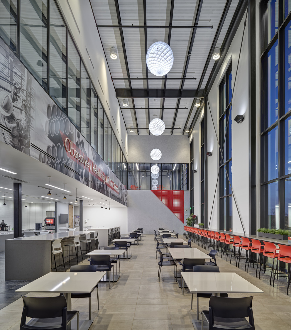 The client had specific guidelines for spaces, including a 50-foot clearance in the Pole Training Arena. The design incorporated viewing portals into every lab and training arena on the main level. These portals were trimmed in corporate red powder-coated steel plates to provide wayfinding queues, accent the space, and act as a subtle nod to the brand. A common feature of the interior design included corporate branding throughout the space to remind employees of the company’s Core Principles. A large break room placed near the front entry offers access to an enclosed patio for employees to step away and connect with nature via a glass overhead door.