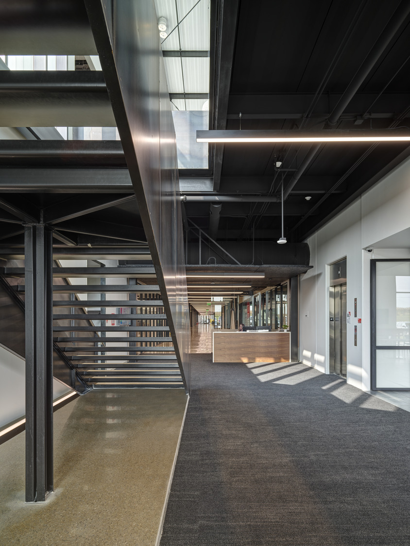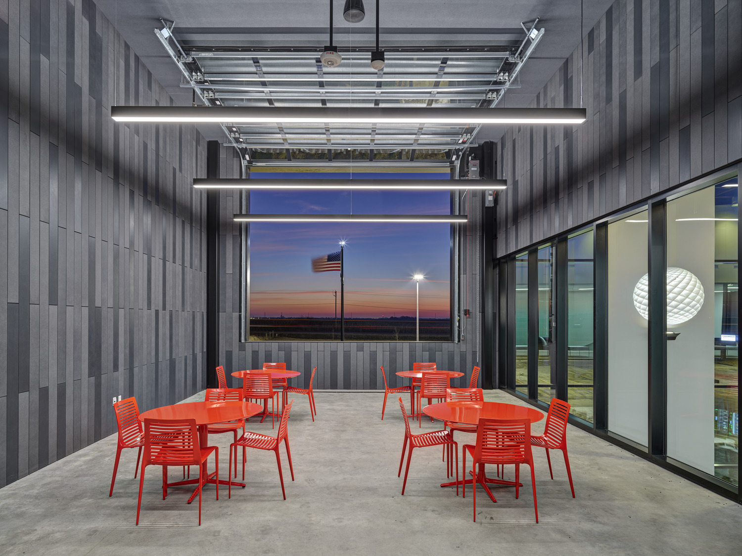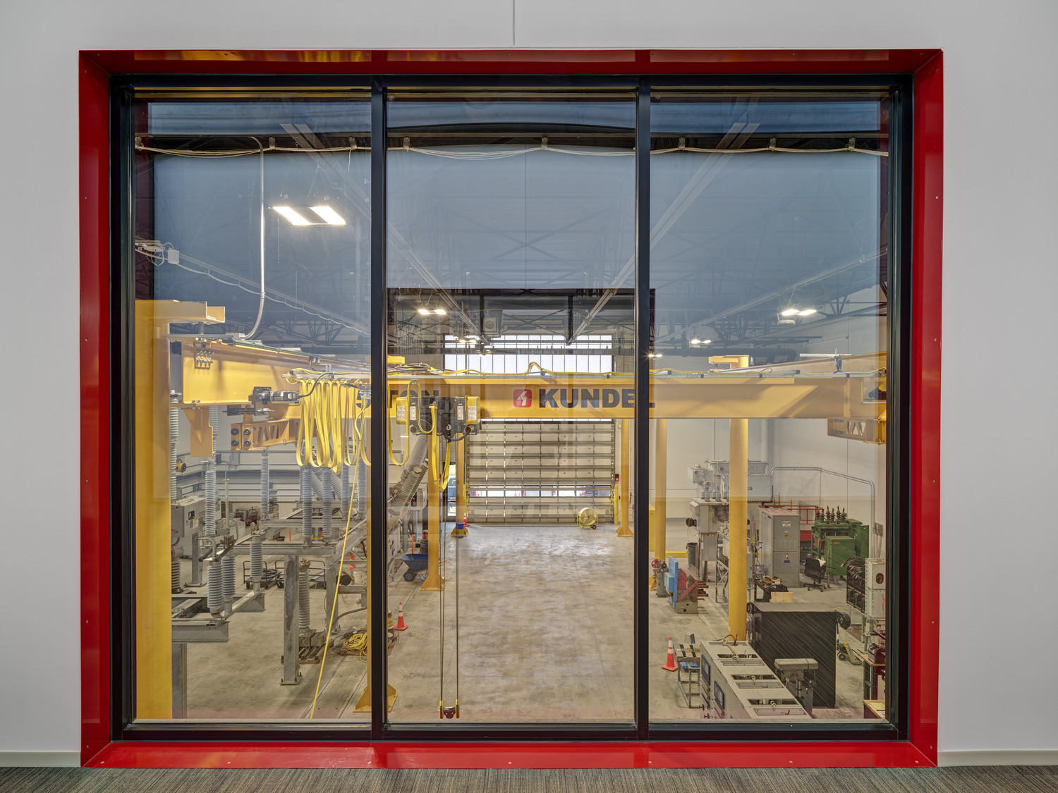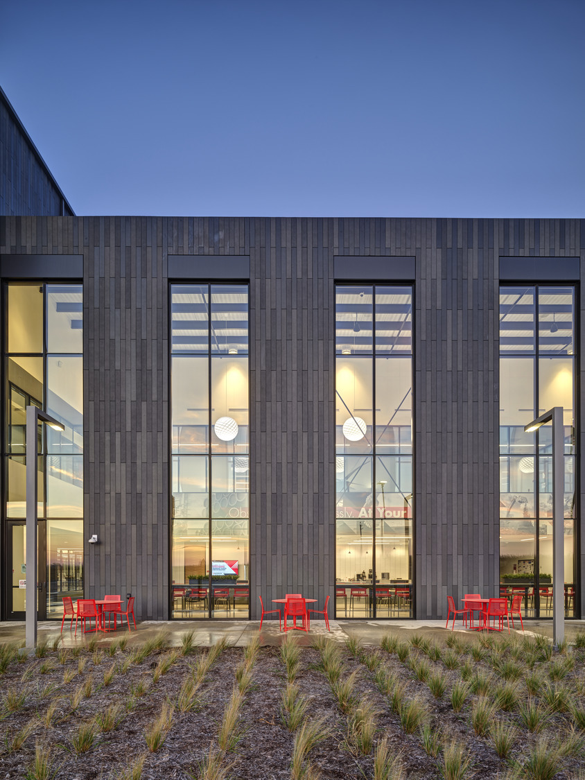 The client had specific guidelines for spaces, including a 50-foot clearance in the Pole Training Arena. The design incorporated viewing portals into every lab and training arena on the main level. These portals were trimmed in corporate red powder-coated steel plates to provide wayfinding queues, accent the space, and act as a subtle nod to the brand. A common feature of the interior design included corporate branding throughout the space to remind employees of the company’s Core Principles. A large break room placed near the front entry offers access to an enclosed patio for employees to step away and connect with nature via a glass overhead door.
