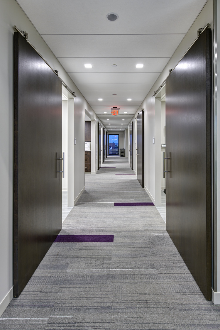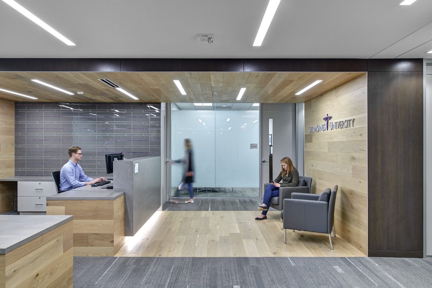 INVISION worked closely with DMU’s executive leadership team to shift from traditional office design to a more open, collaborative space with plenty of natural daylight. The renovated spaces in the clinic tower were designed to provide welcoming, safe, motivating, and accessible spaces while focusing on inclusivity features like gender-neutral restrooms.