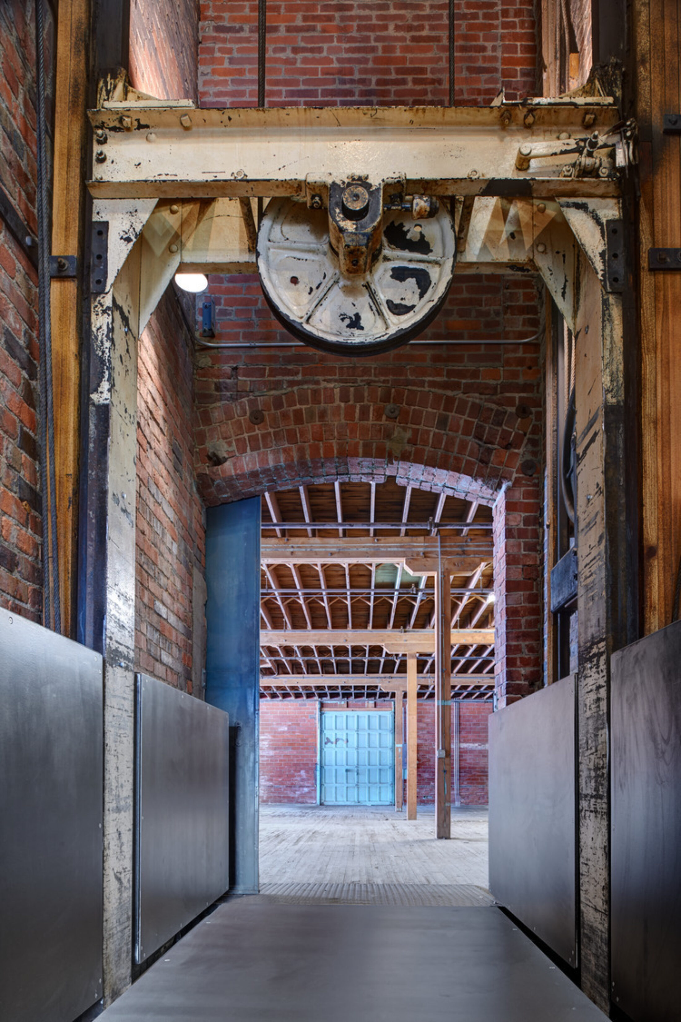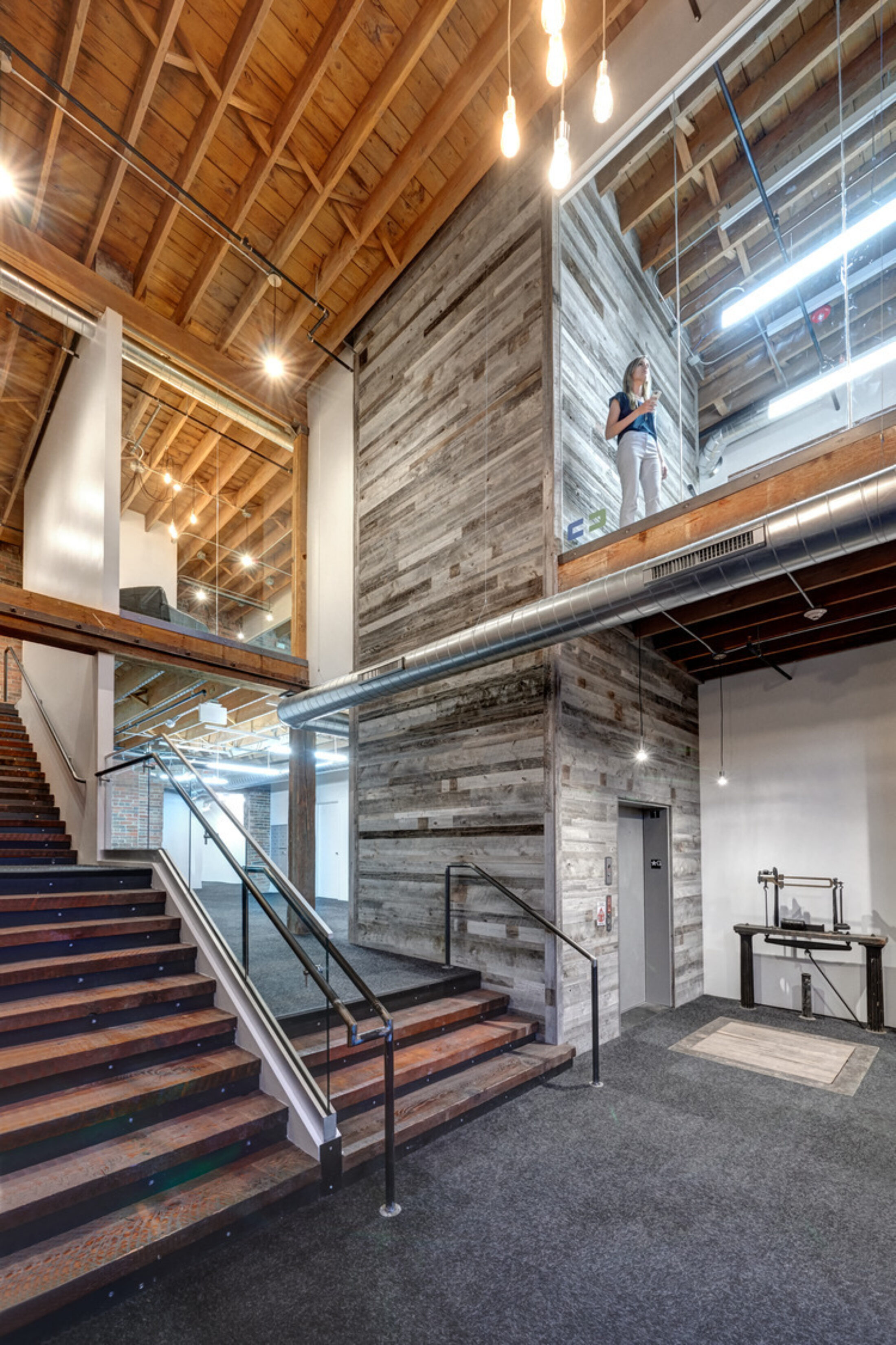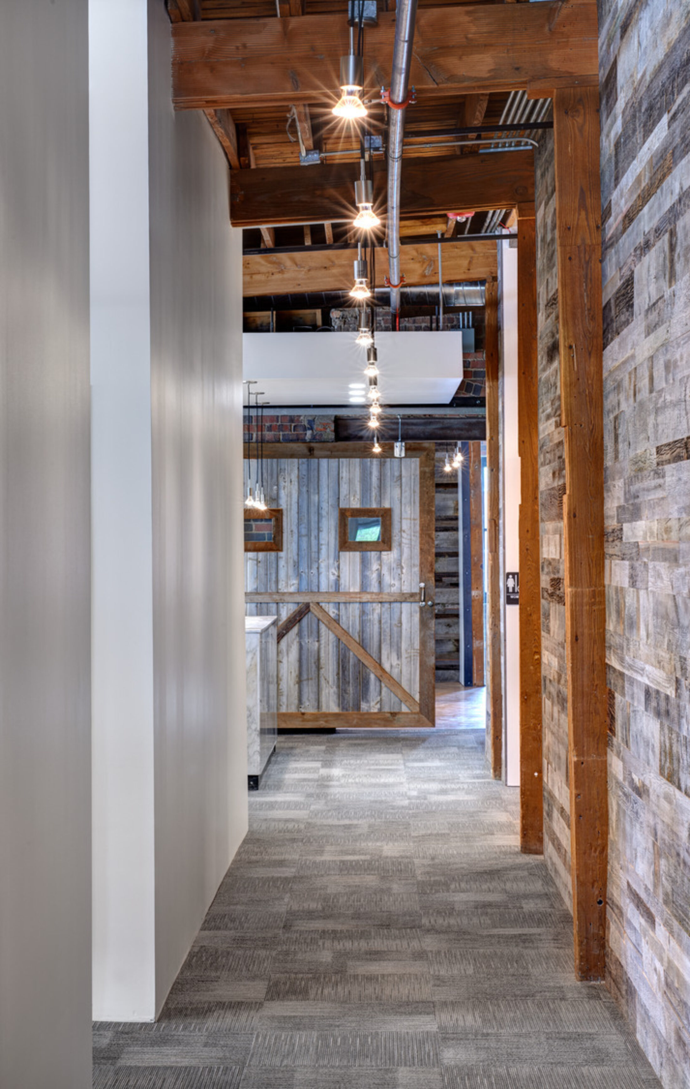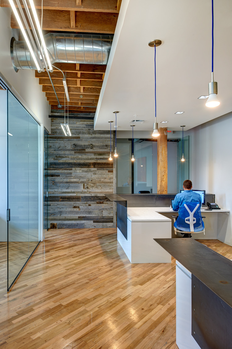 The renovation included 35,500sf over two stories and accommodated commercial office fit-outs for two companies, as well as a restaurant and retail on street level. The team was committed to using natural materials with simple execution to fit the project’s concept and timeline. Steel panels from the original manufacturing floor, heavy timbers, barn boards, marble wainscot, sliding metal doors, and even the remains of an existing elevator shaft were repurposed and reused. Glass and a modern finish palette were utilized for the new insertions in the space.