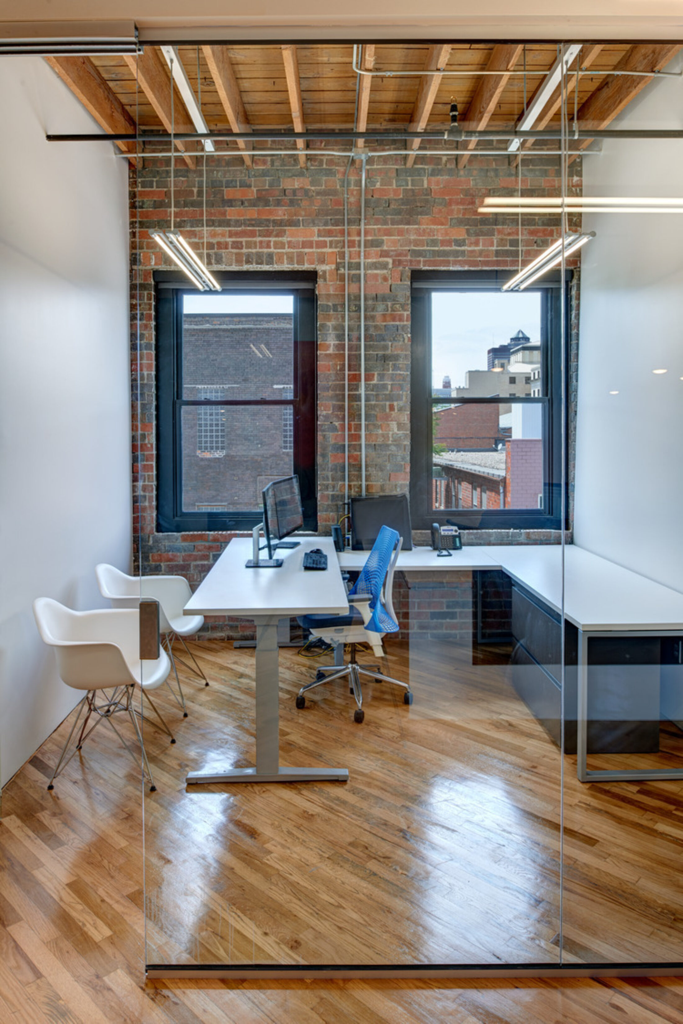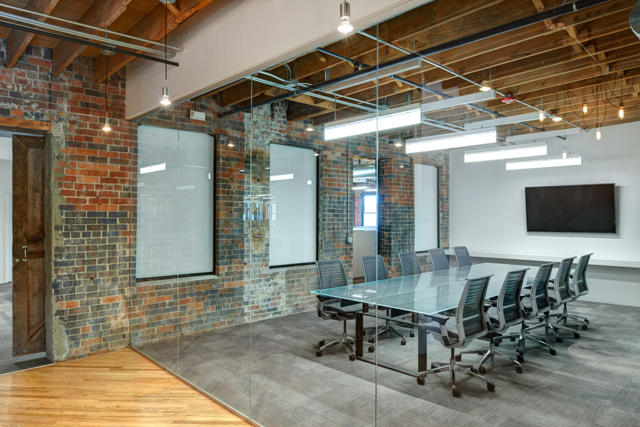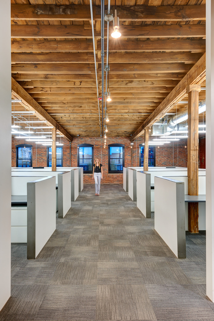 The elements that INVISION added to the building to support collaboration and productive workspaces created a great blend of modern office practices. The design perfectly balanced the contrast of existing material and clean modern updates to celebrate the architectural components of this 80-year-old timber and brick structure.