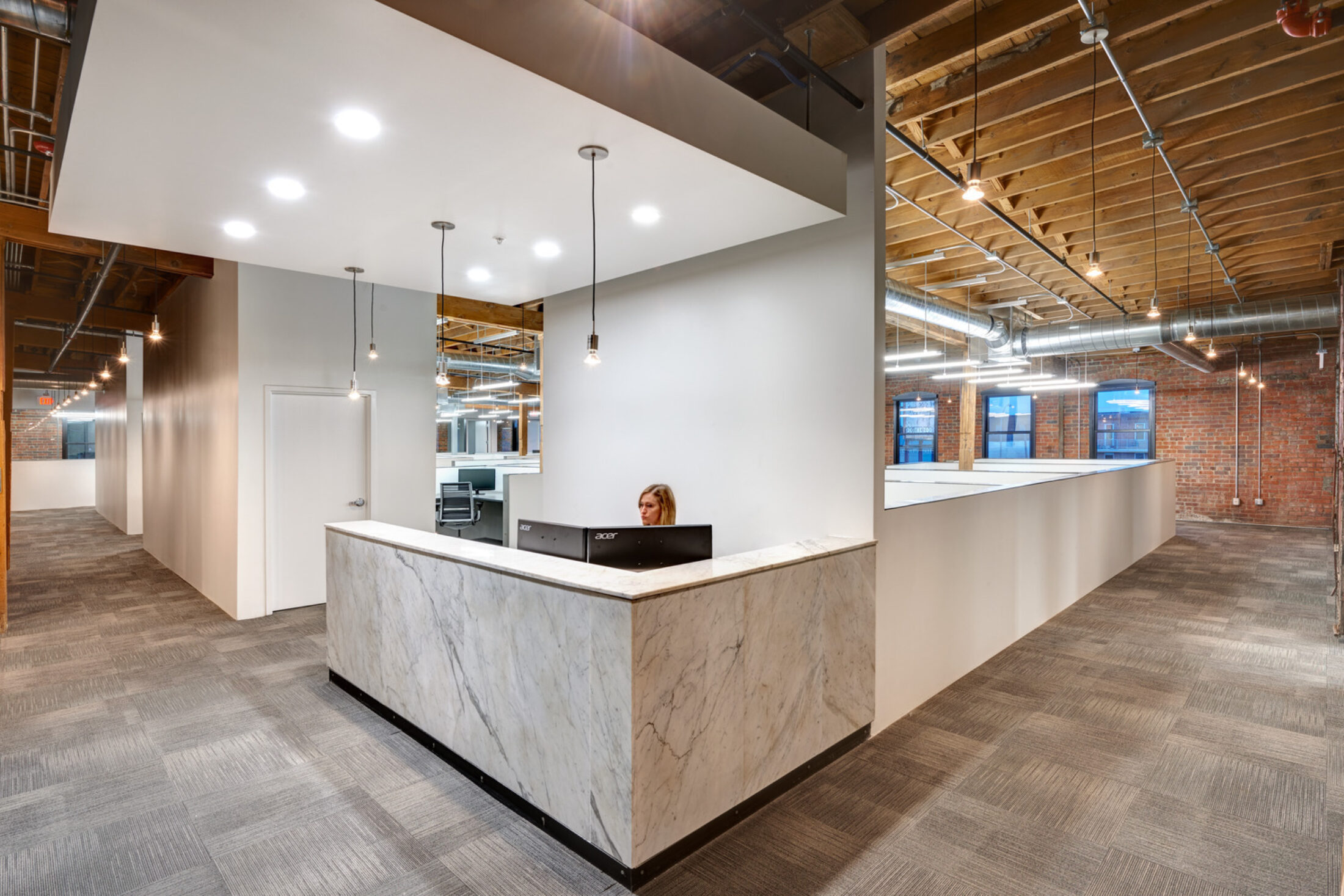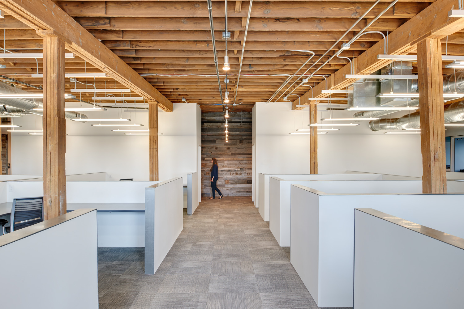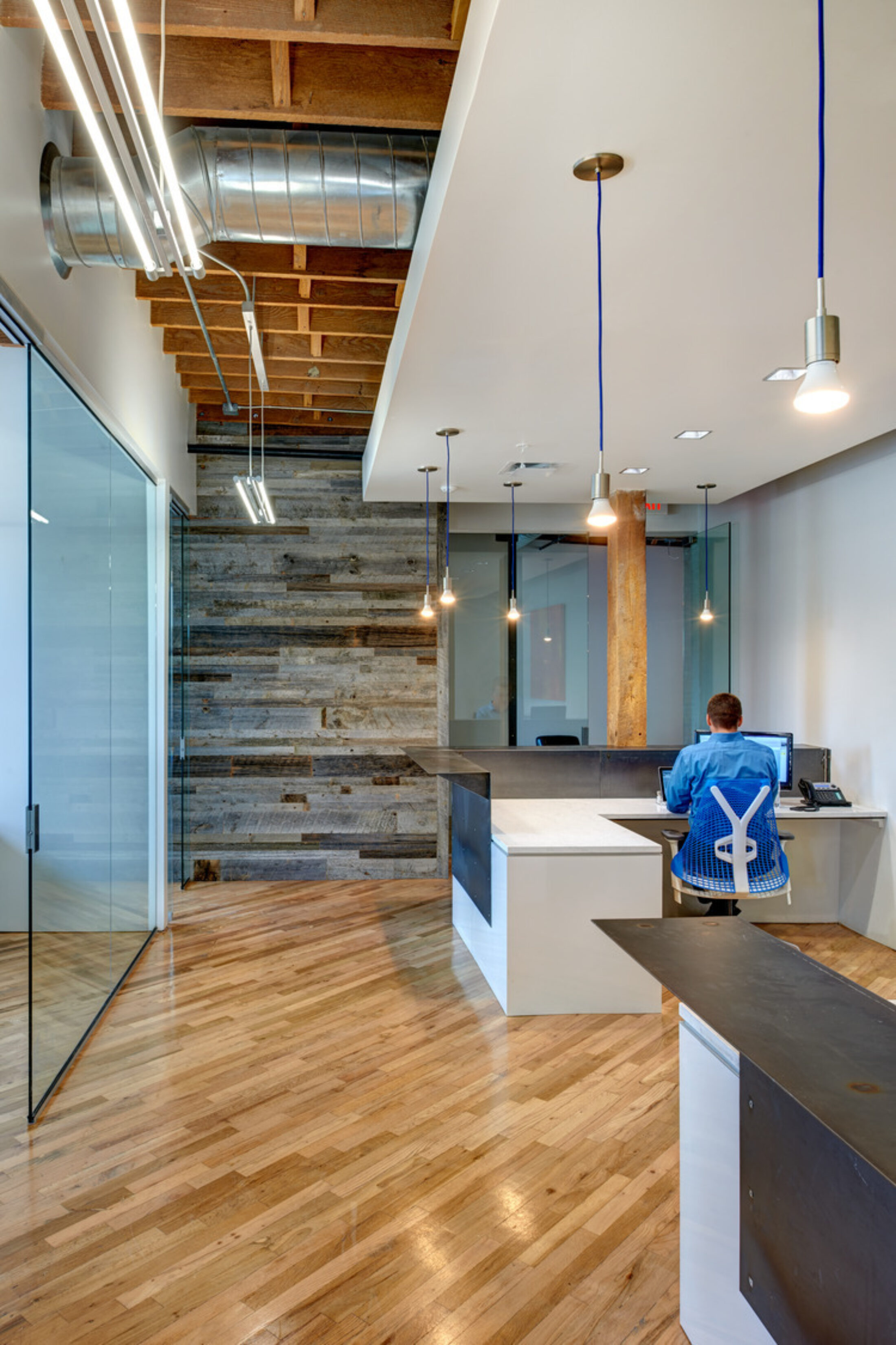 The elements that INVISION added to the building to support collaboration and productive workspaces created a great blend of modern office practices. The design perfectly balanced the contrast of existing material and clean modern updates to celebrate the architectural components of this 80-year-old timber and brick structure.