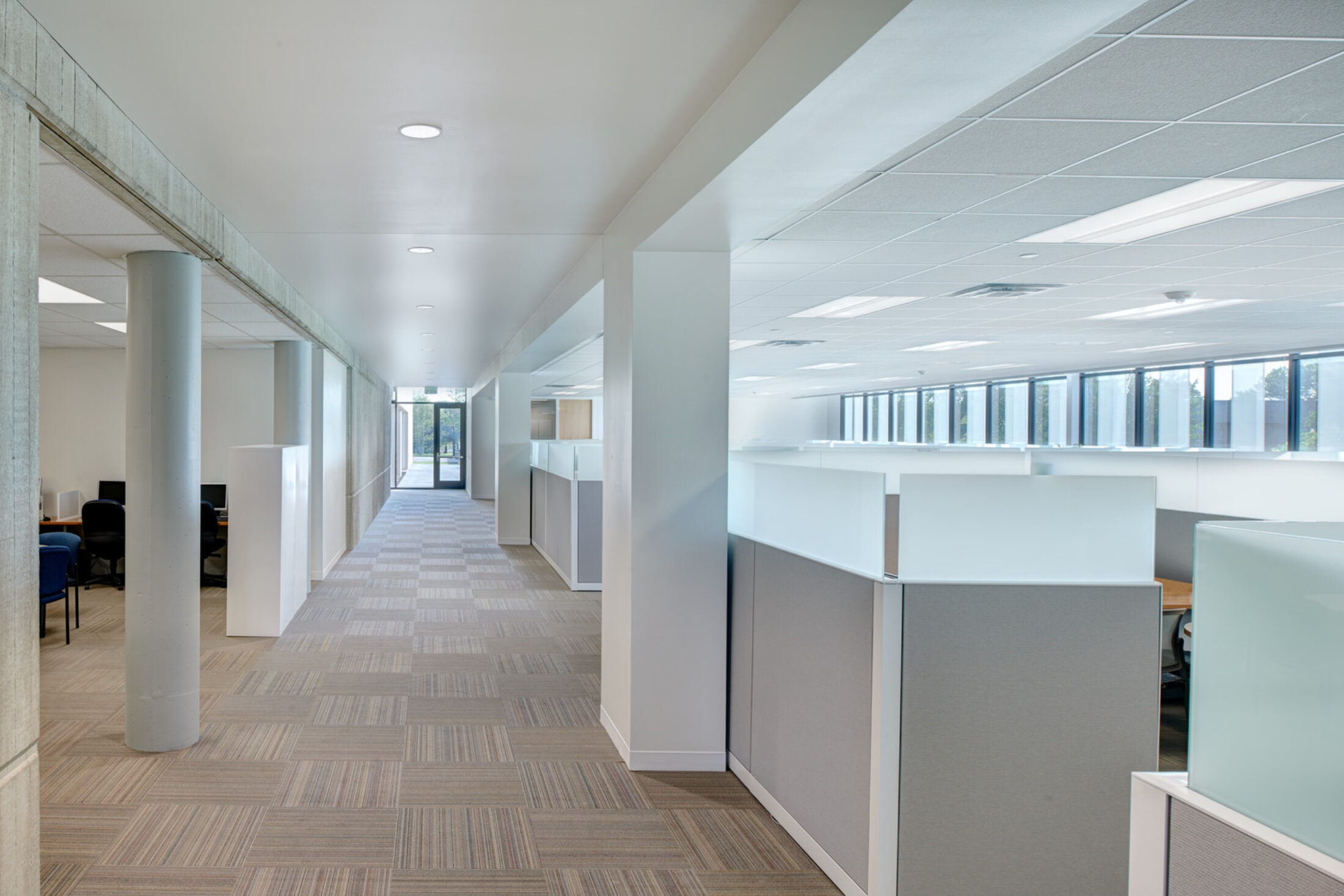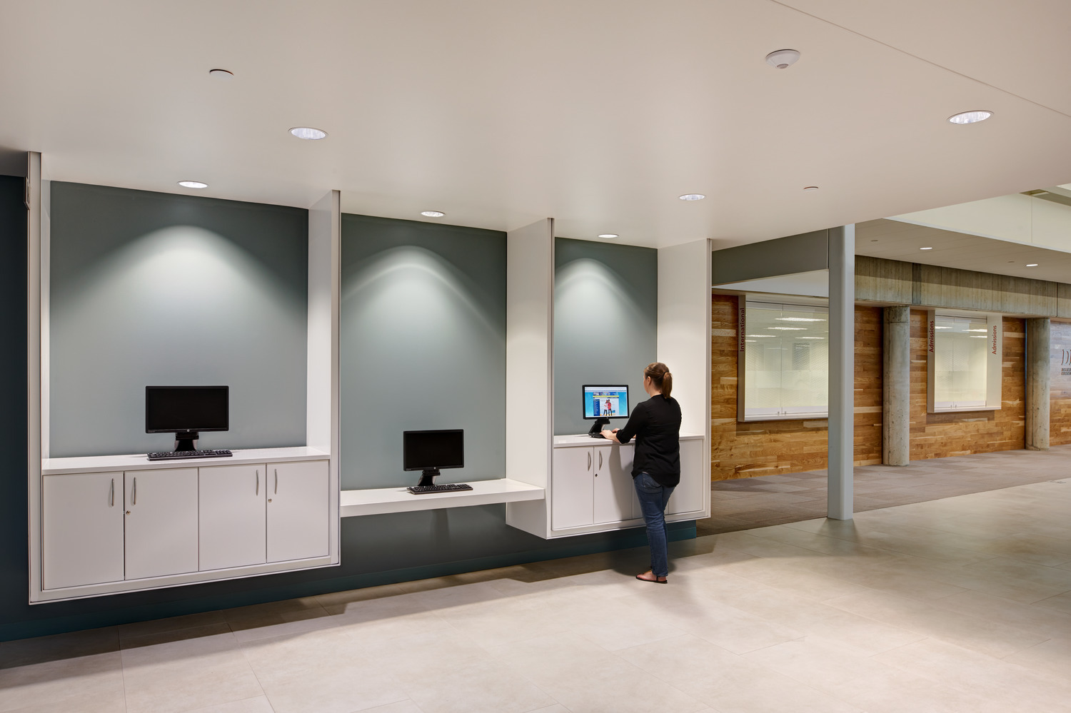 The existing open office was reorganized, and the design developed private offices, shared conference space, and work rooms. INVISION created a public lobby with a revitalized front door to the space, satisfying the space needs during registration while serving as a common area during the rest of the year. Wayfinding was also developed throughout to give the students and staff a better experience with recruiting and registration.