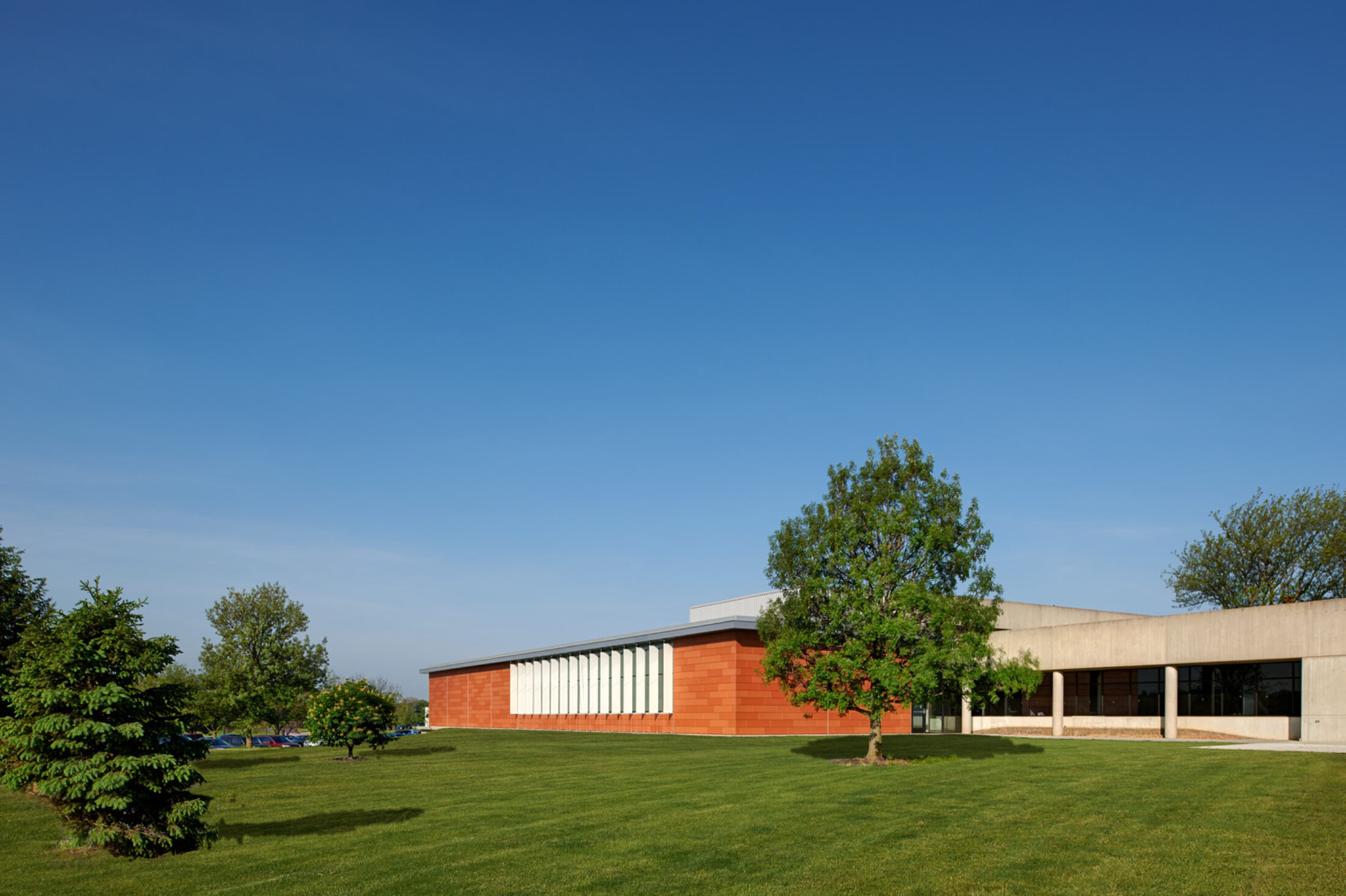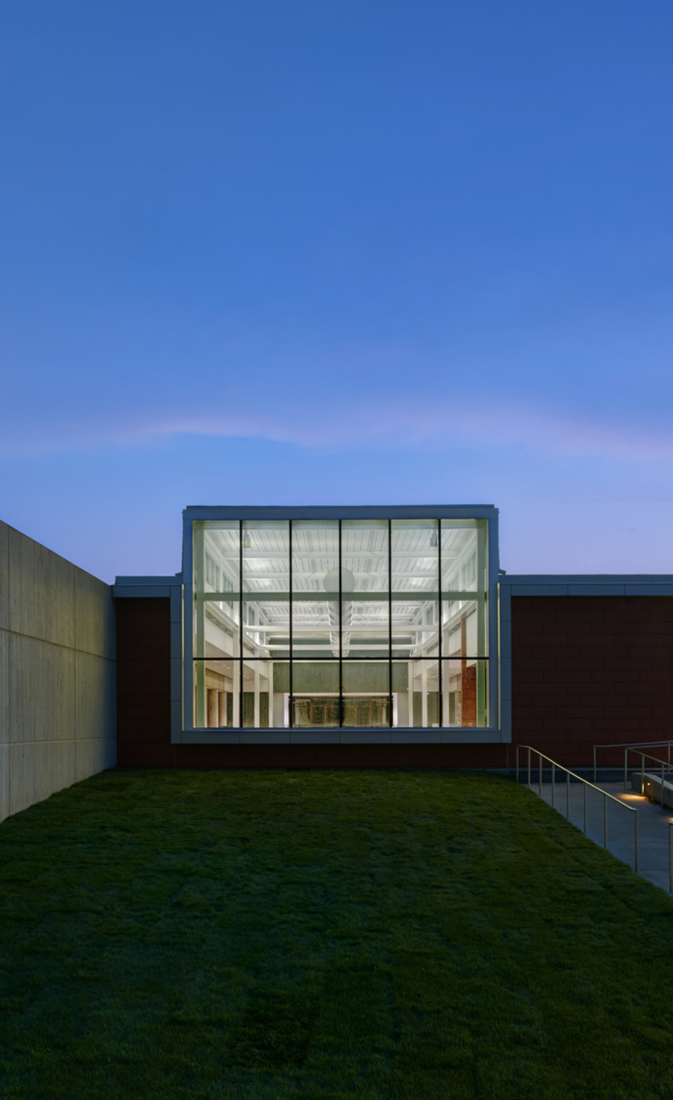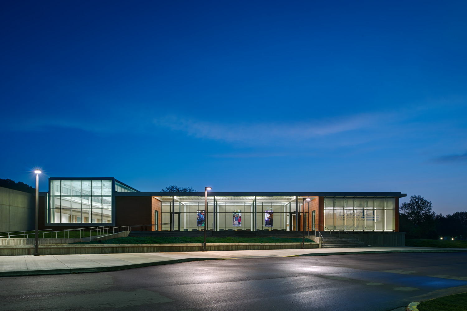 Materials were selected to relay a modern aesthetic and also complement the existing facility and adjacent campus buildings. One unique design feature was a custom pattern developed by the design team that was digitally printed onto the glazing. The pattern reduces glare during the day while permitting enough transparency to serve as a welcoming lantern for the campus at night.