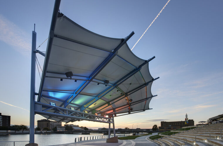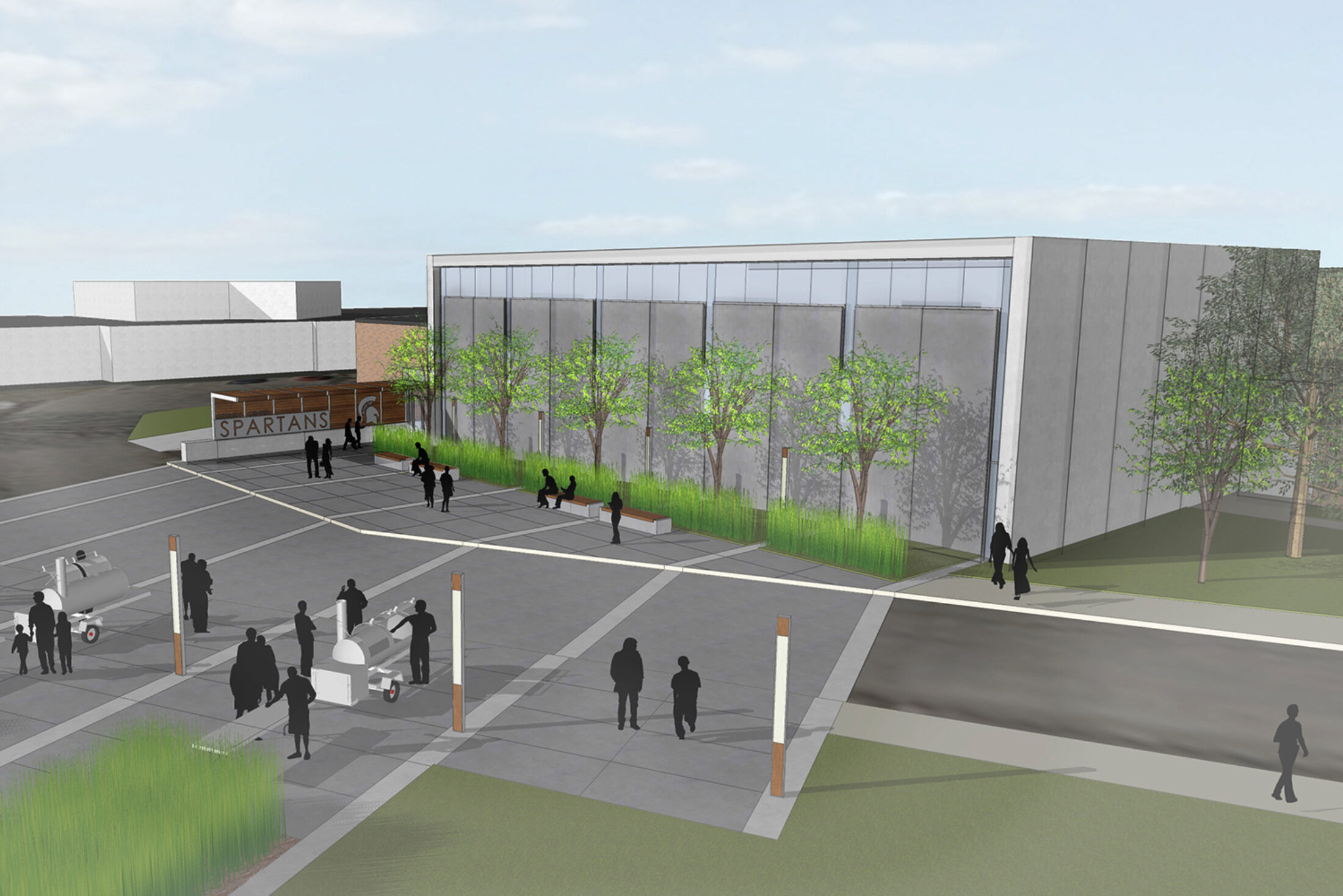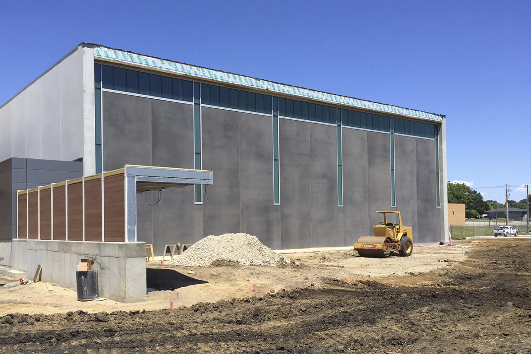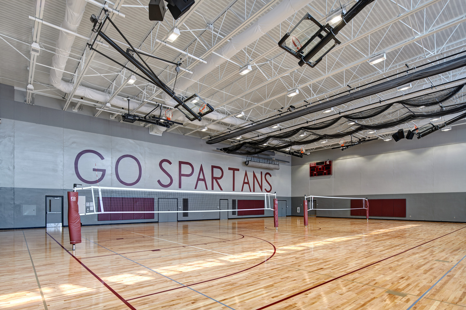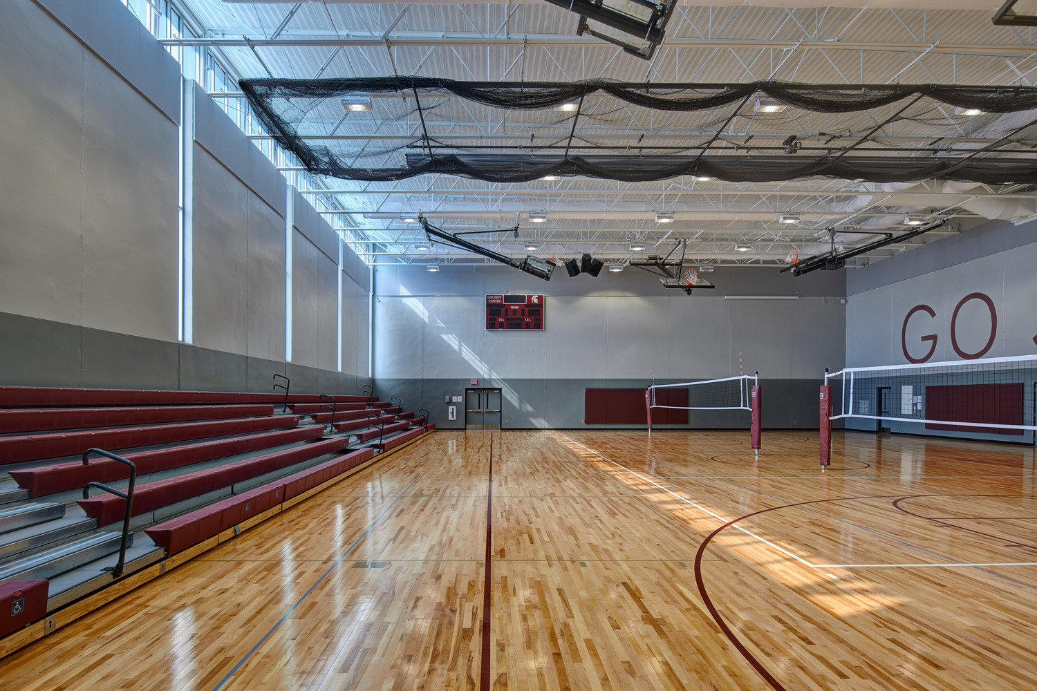The new gymnasium was located near the existing school’s locker rooms and gymnasiums, acting as a bridge to the track and football field and creating a hub for the school’s recreation. The facility adds a competition volleyball and basketball court, two practice courts, a multi-sport net (baseball, softball, golf), as well as retractable seating for 343 spectators. A new open plaza area outdoors accommodates sporting event tailgates.