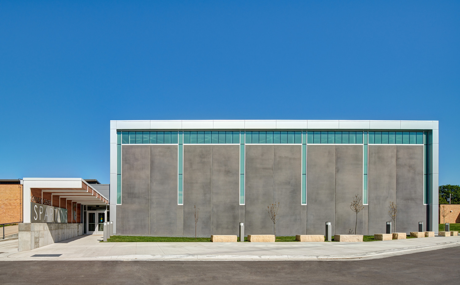 Precast insulated panels were utilized to fit within the budget and facilitate winter construction, a necessity for the district’s schedule. Translucent glazing allows natural light into the multi-functional space, while acoustic decking and wall panels enable better sound performance. INVISION considered the needs of the multiple coaches and staff and then blended them all into a design that serves the entire community.
