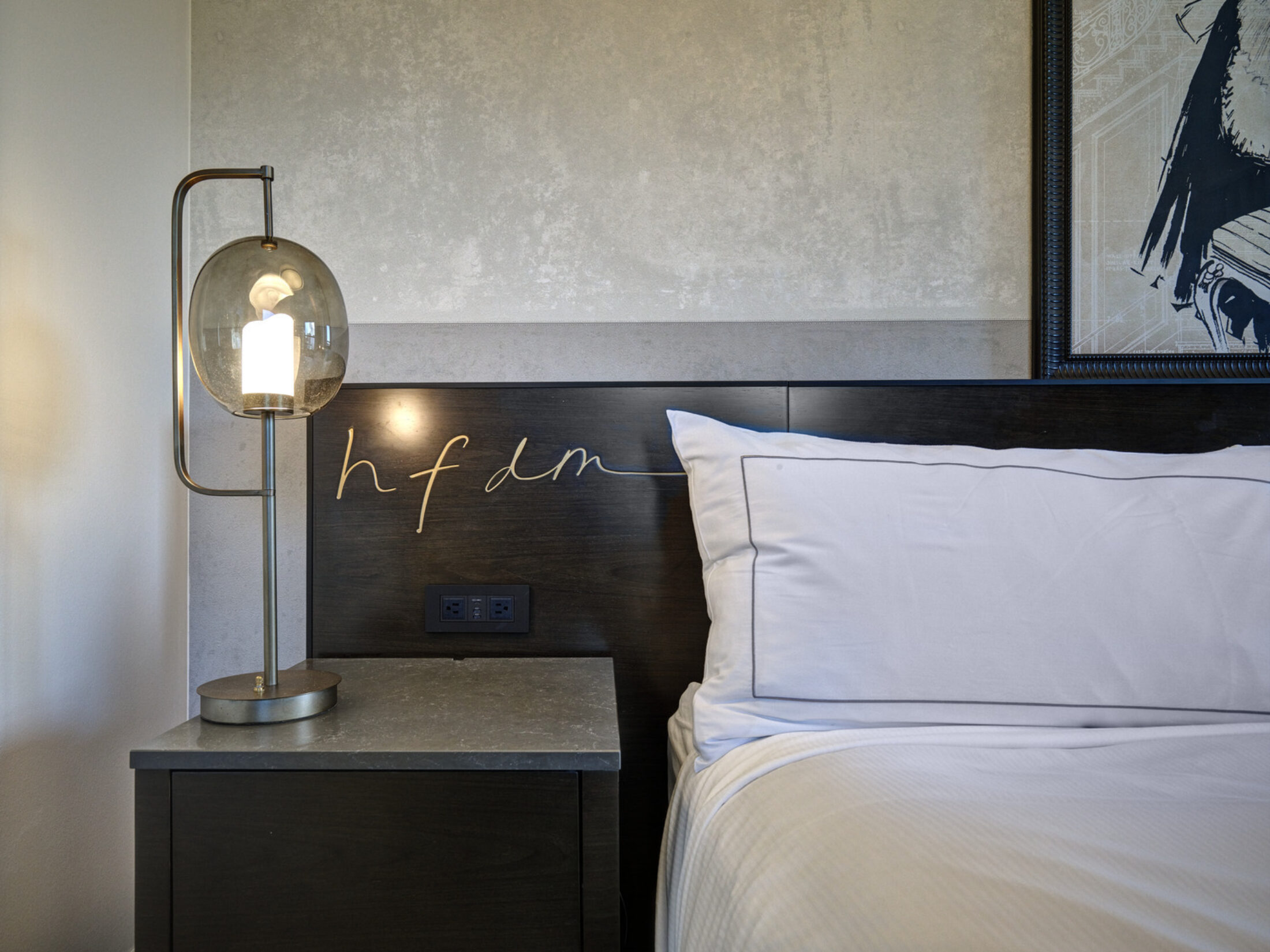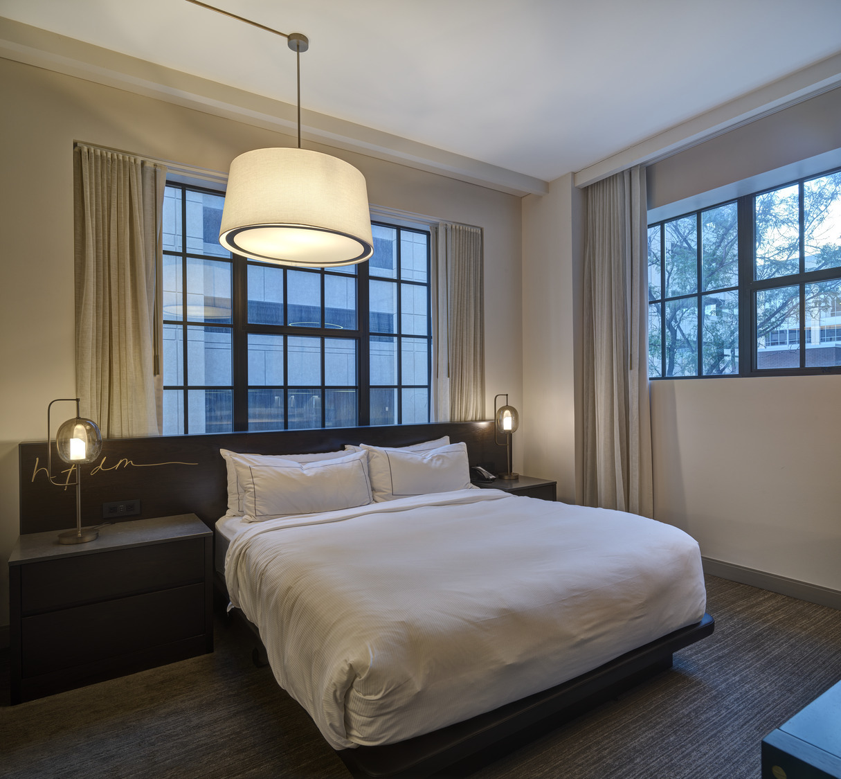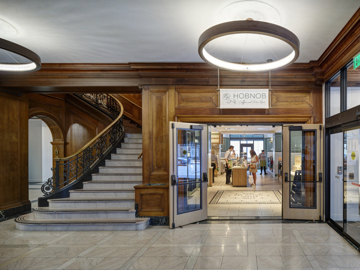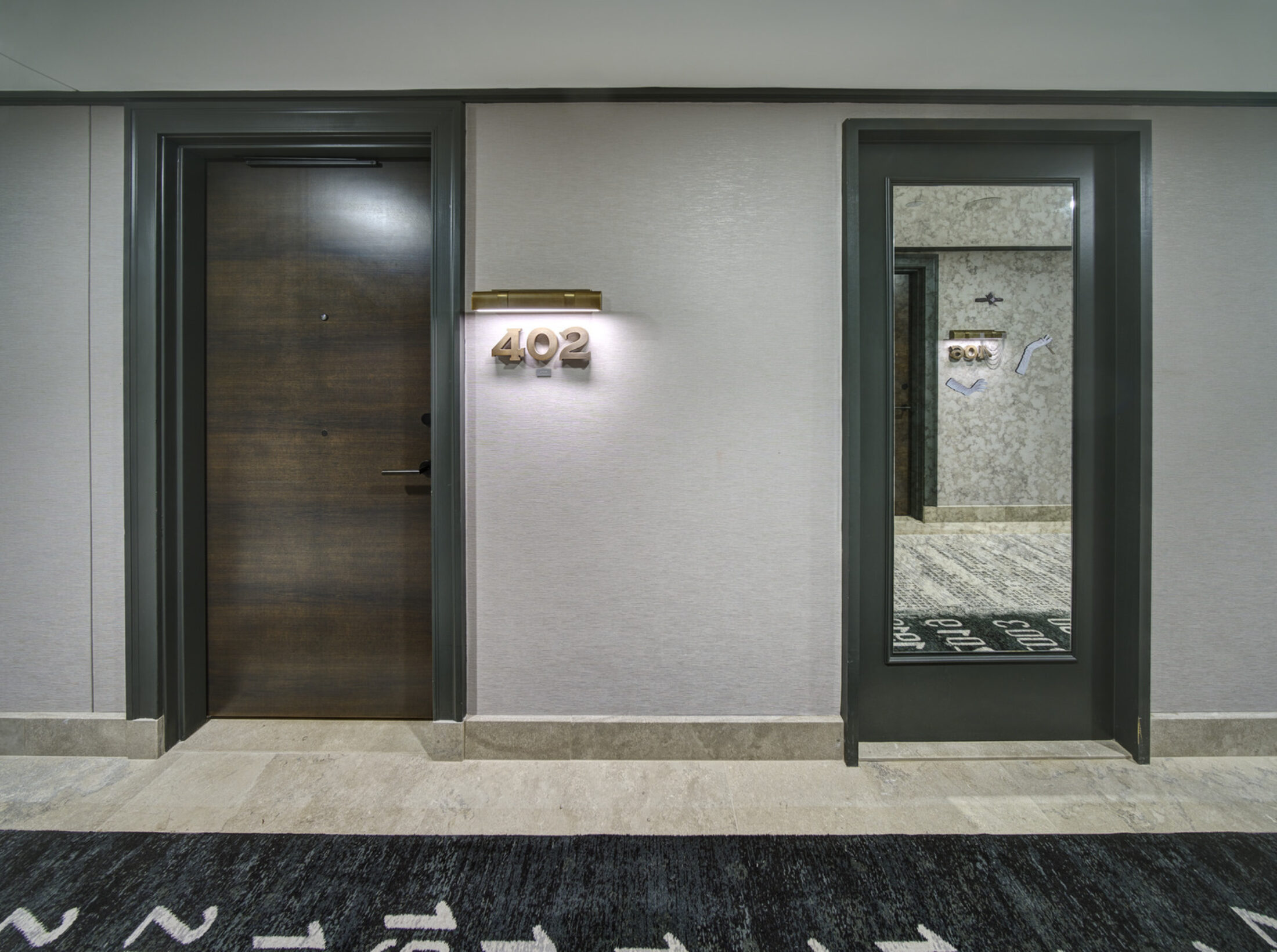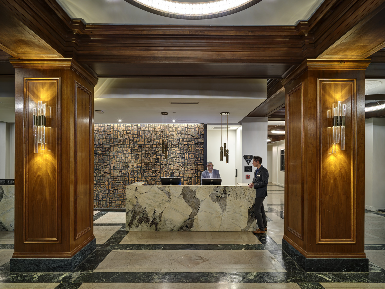 Both the Grand Ballroom and Wedgewood Ballroom were renovated, bringing back their original grandeur. The existing west courtyard was redesigned as a pocket-park” with a new exterior ceremonial staircase that connects to the grand ballroom. The basement includes a high-end fitness area in what was once the hotel’s barber shop. A basement speakeasy, accessible through the Hobnob Coffe and Wine Bar on the first floor, will also serve as a public venue. The interior of the hotel was carefully curated with details such as the selected material palette, custom historic timeline carpeting, restoration of historical elements and handwritten gold-inlay hotel logos on each hotel room headboard to pay homage to the hotel’s history and to accurately recreate an era of the past through a seamless combination of both new and repurposed material.