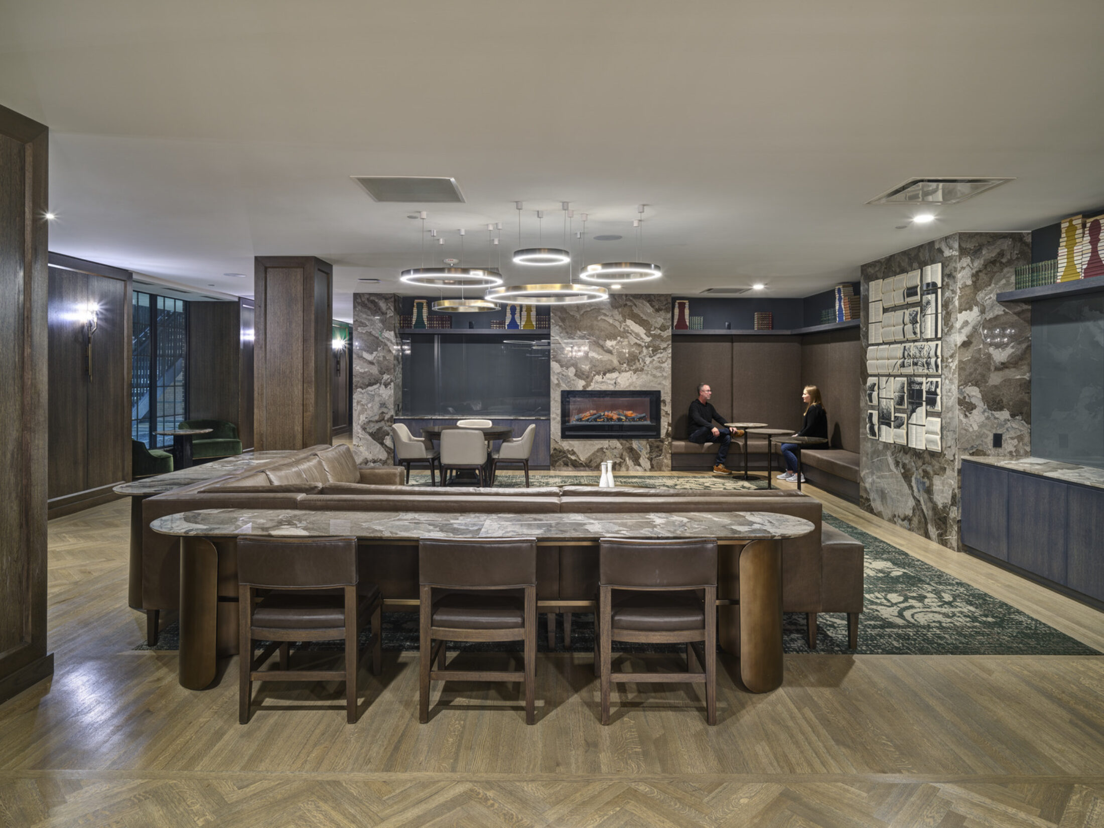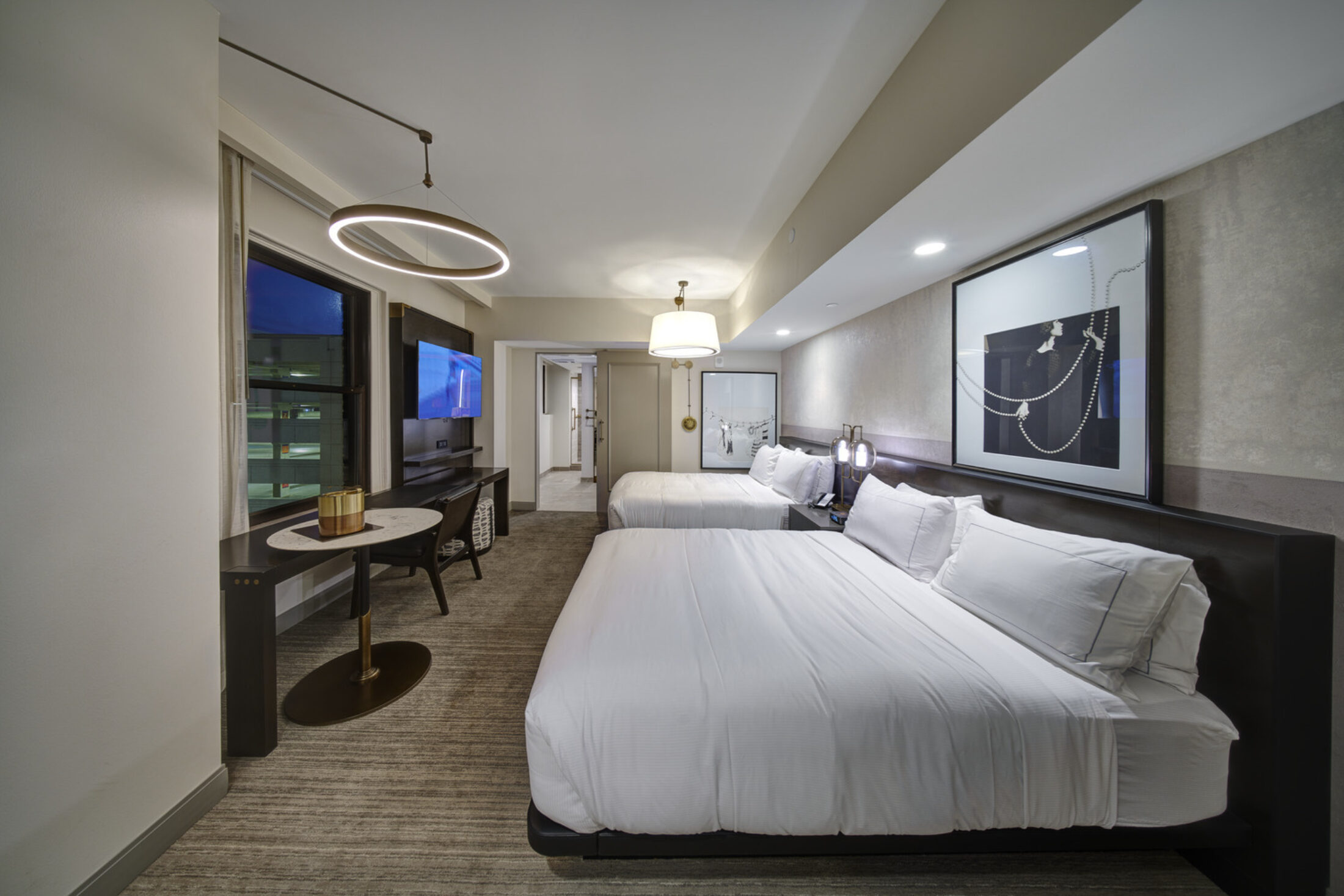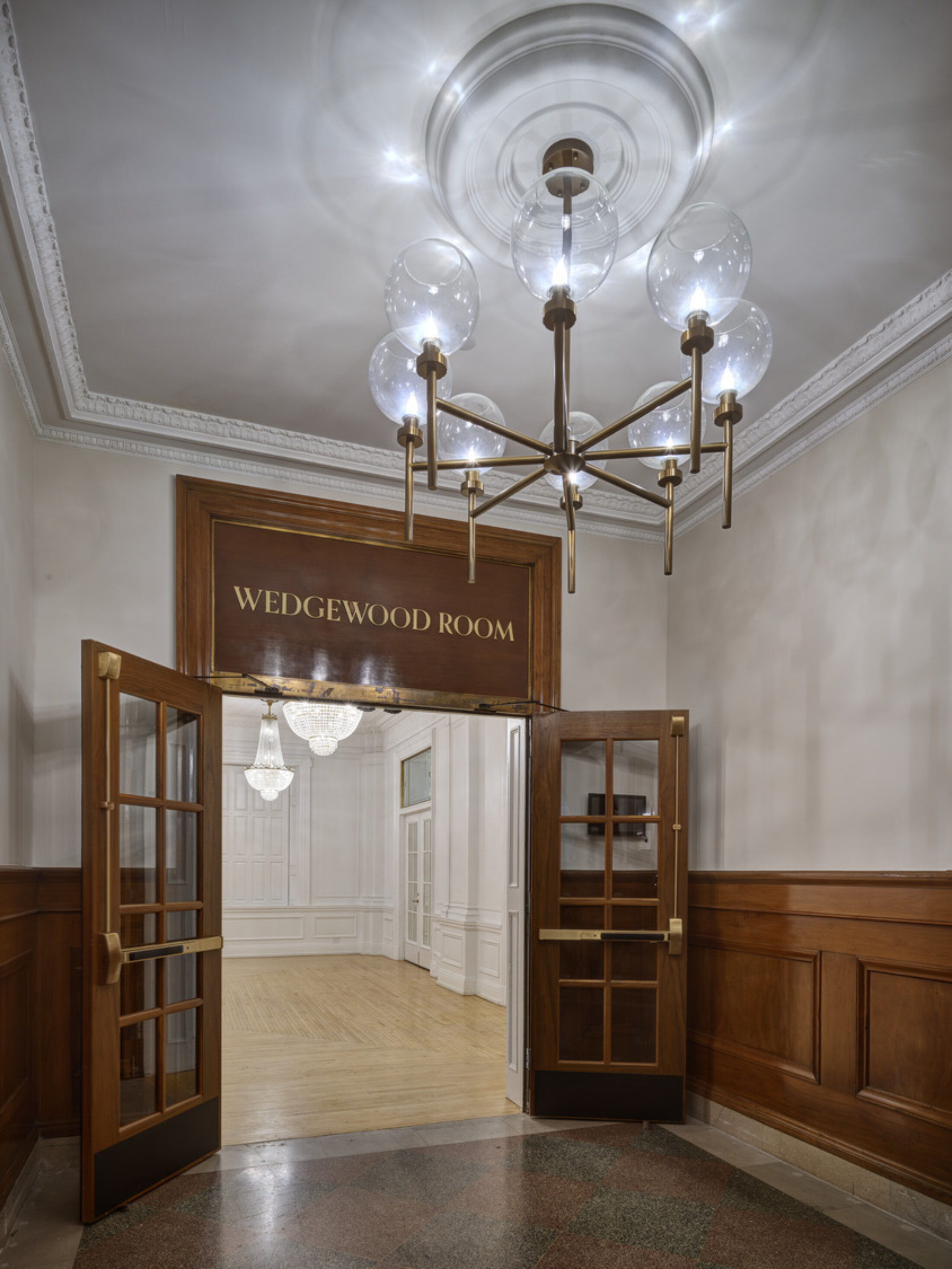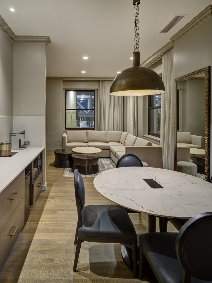 Both the Grand Ballroom and Wedgewood Ballroom were renovated, bringing back their original grandeur. The existing west courtyard was redesigned as a pocket-park” with a new exterior ceremonial staircase that connects to the grand ballroom. The basement includes a high-end fitness area in what was once the hotel’s barber shop. A basement speakeasy, accessible through the Hobnob Coffe and Wine Bar on the first floor, will also serve as a public venue. The interior of the hotel was carefully curated with details such as the selected material palette, custom historic timeline carpeting, restoration of historical elements and handwritten gold-inlay hotel logos on each hotel room headboard to pay homage to the hotel’s history and to accurately recreate an era of the past through a seamless combination of both new and repurposed material.