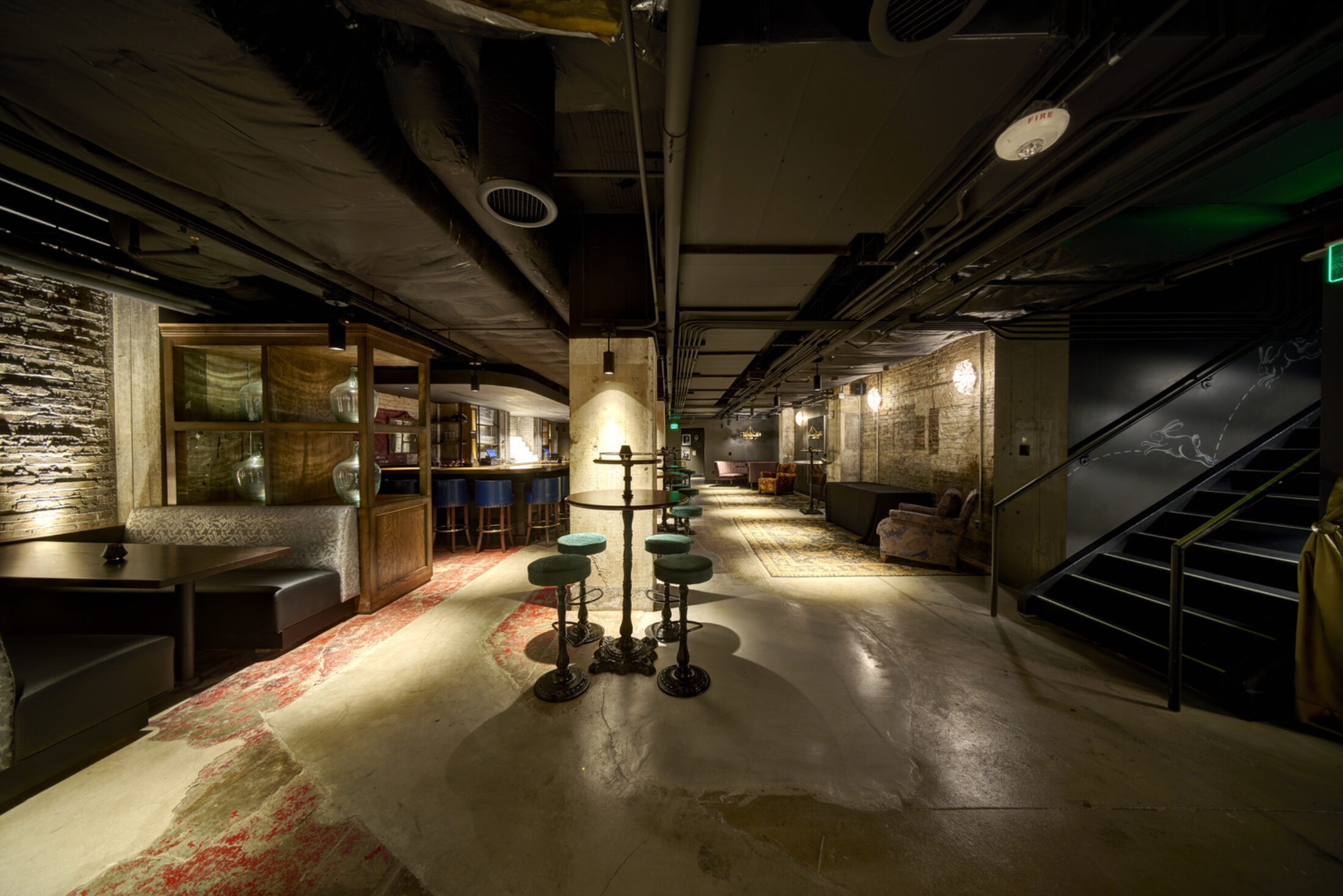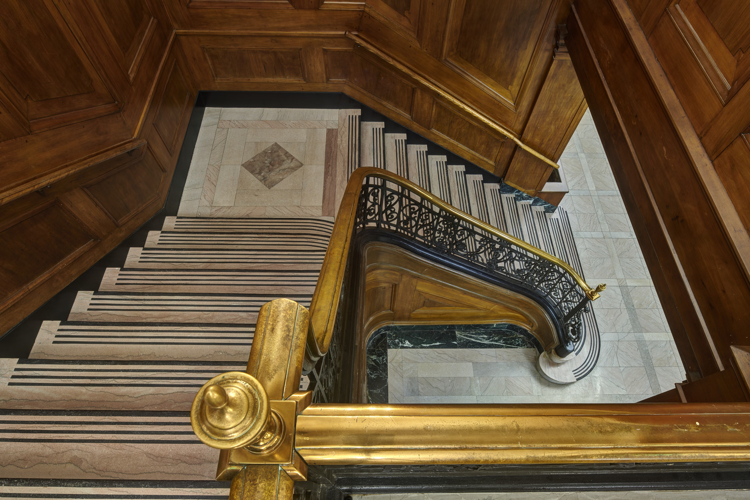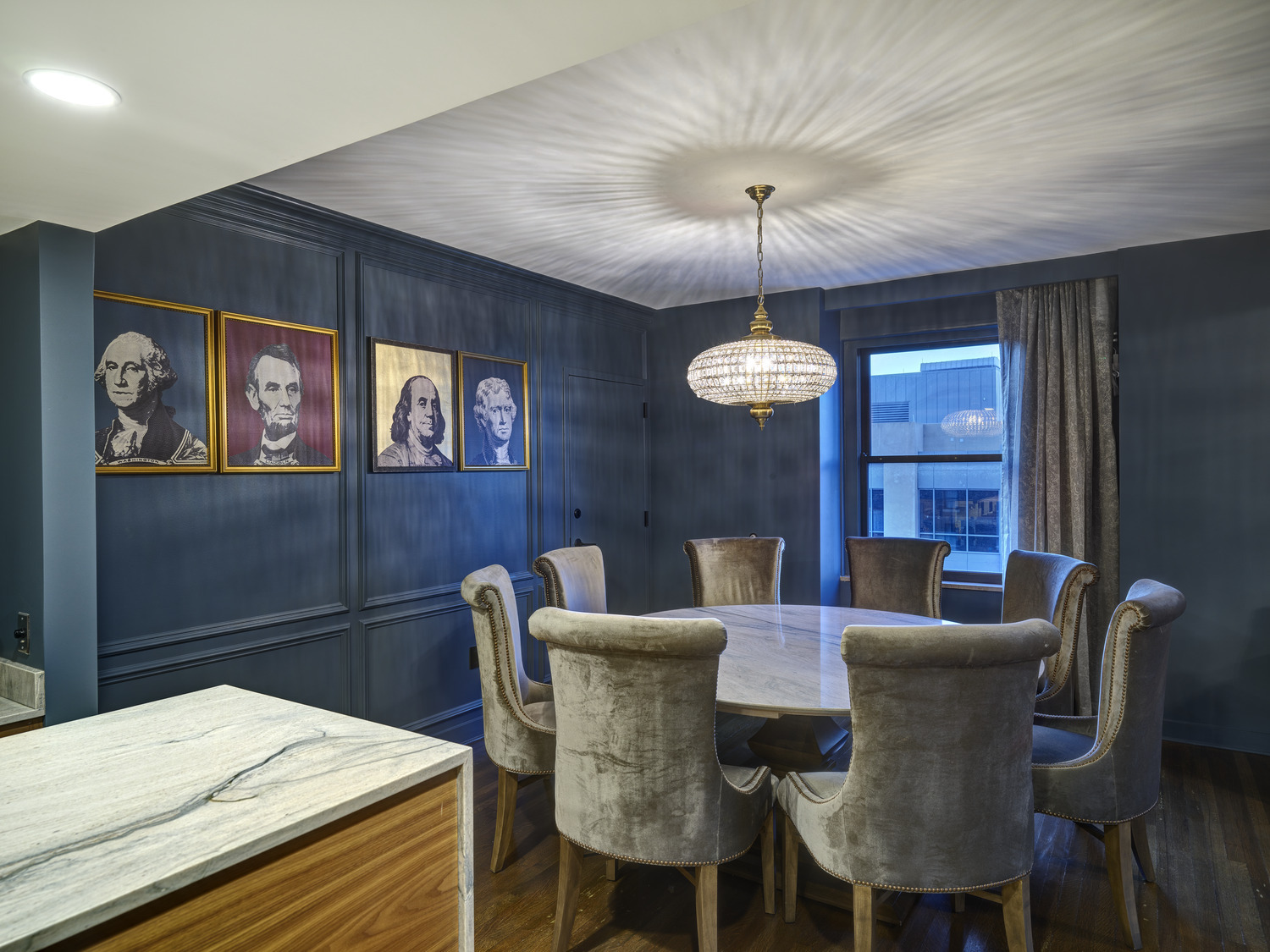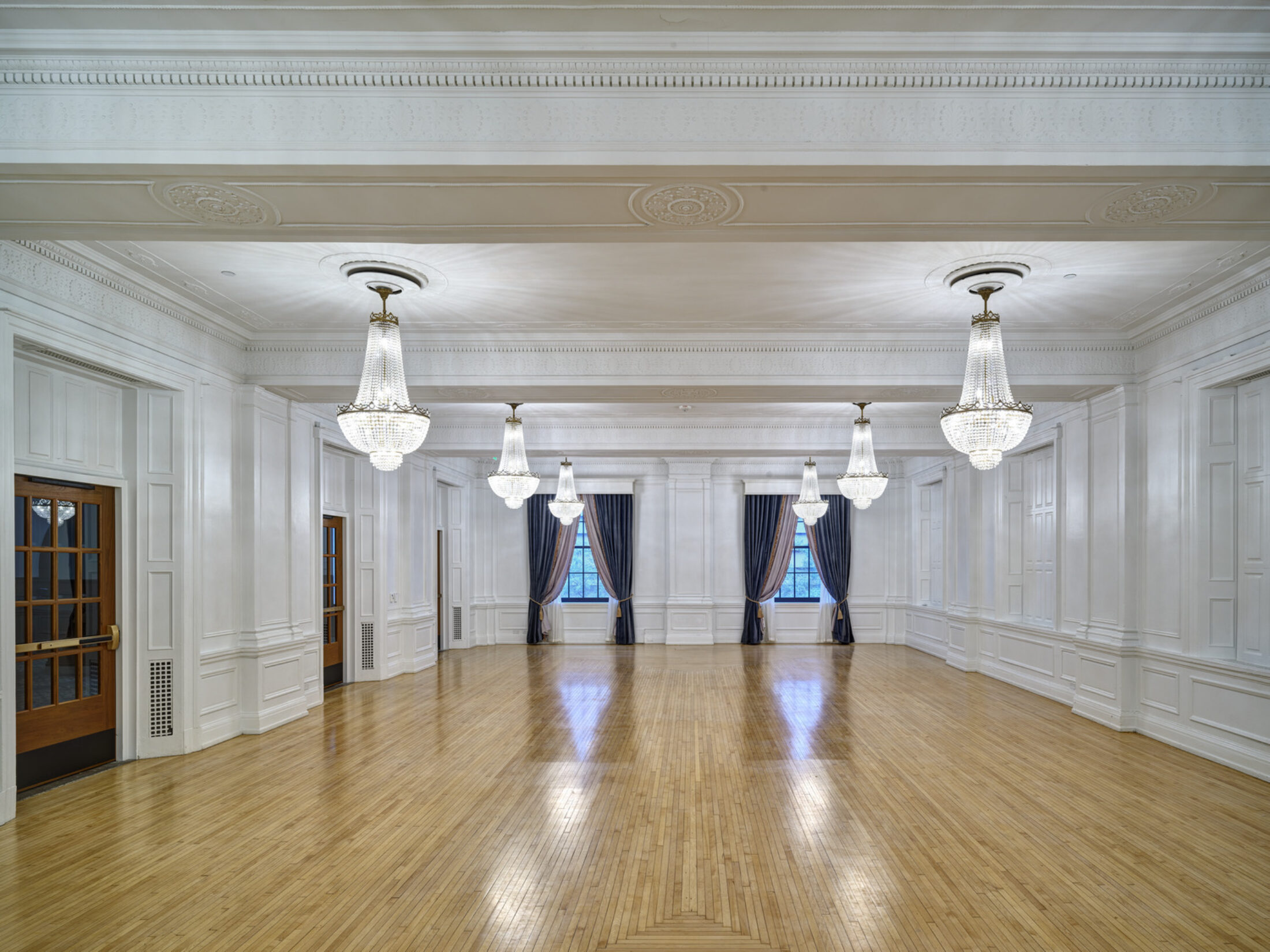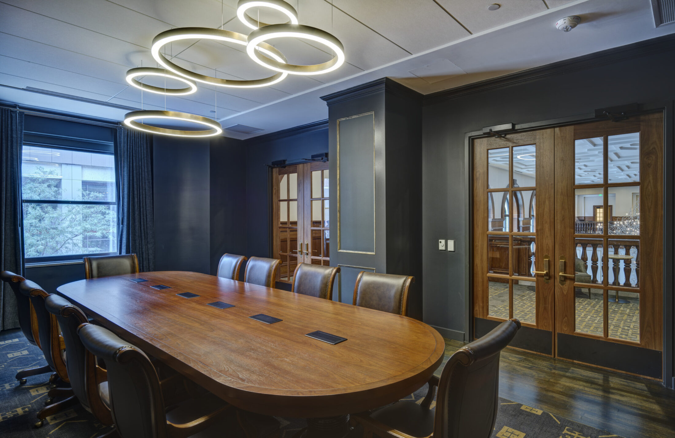 Both the Grand Ballroom and Wedgewood Ballroom were renovated, bringing back their original grandeur. The existing west courtyard was redesigned as a pocket-park” with a new exterior ceremonial staircase that connects to the grand ballroom. The basement includes a high-end fitness area in what was once the hotel’s barber shop. A basement speakeasy, accessible through the Hobnob Coffe and Wine Bar on the first floor, will also serve as a public venue. The interior of the hotel was carefully curated with details such as the selected material palette, custom historic timeline carpeting, restoration of historical elements and handwritten gold-inlay hotel logos on each hotel room headboard to pay homage to the hotel’s history and to accurately recreate an era of the past through a seamless combination of both new and repurposed material.