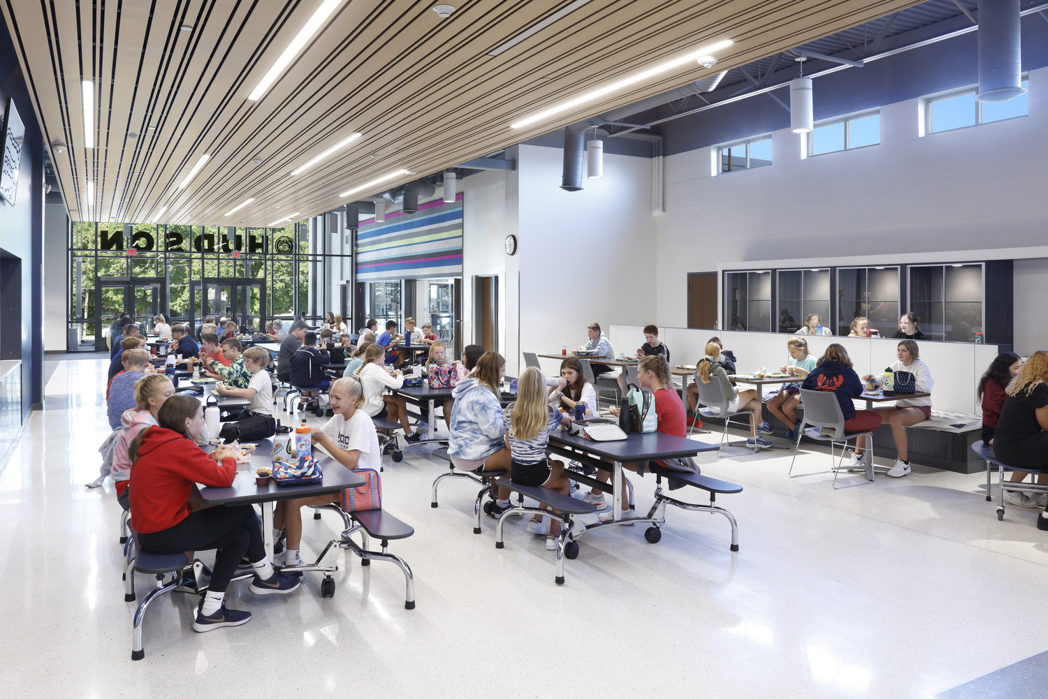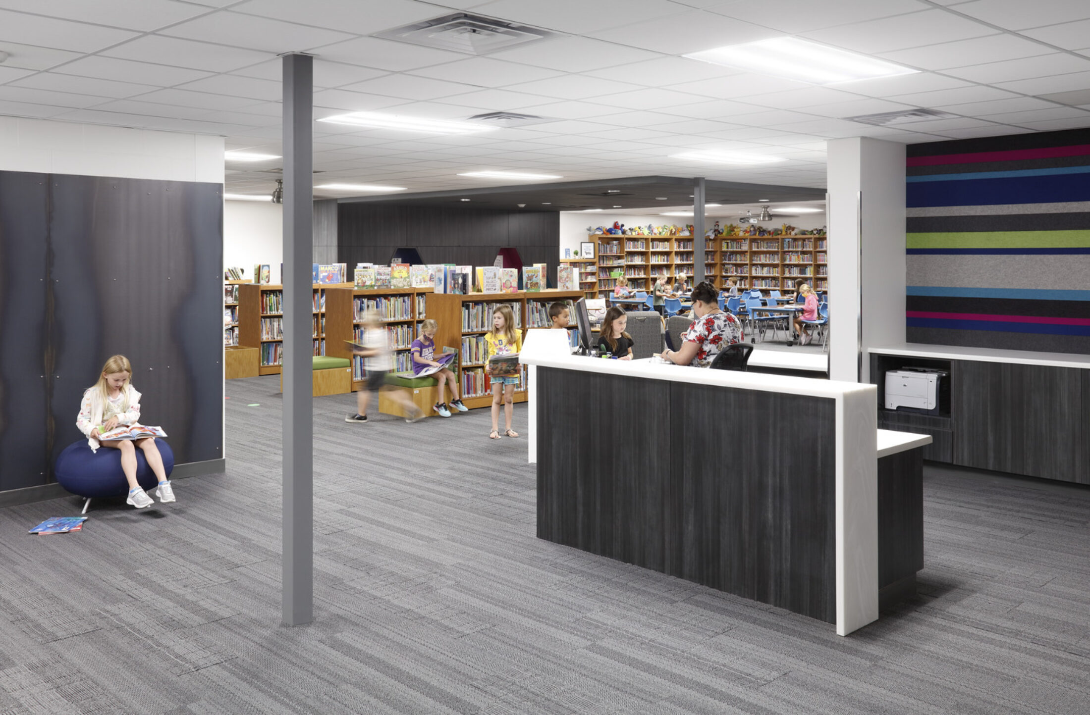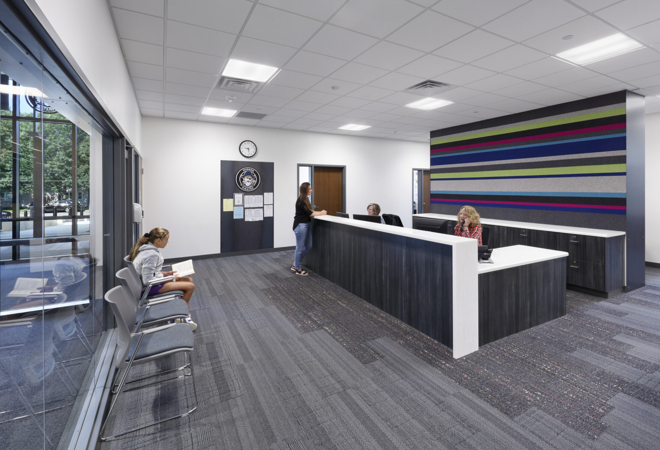 Just inside this new entrance and adjacent to the modernized media center, the new multipurpose academic commons area was created for dining, group collaboration, and after-hours community events. These common areas now also feature a significant amount of daylight and exterior views for a bright, open atmosphere.