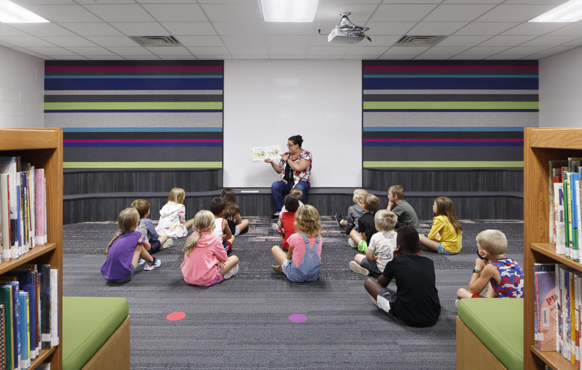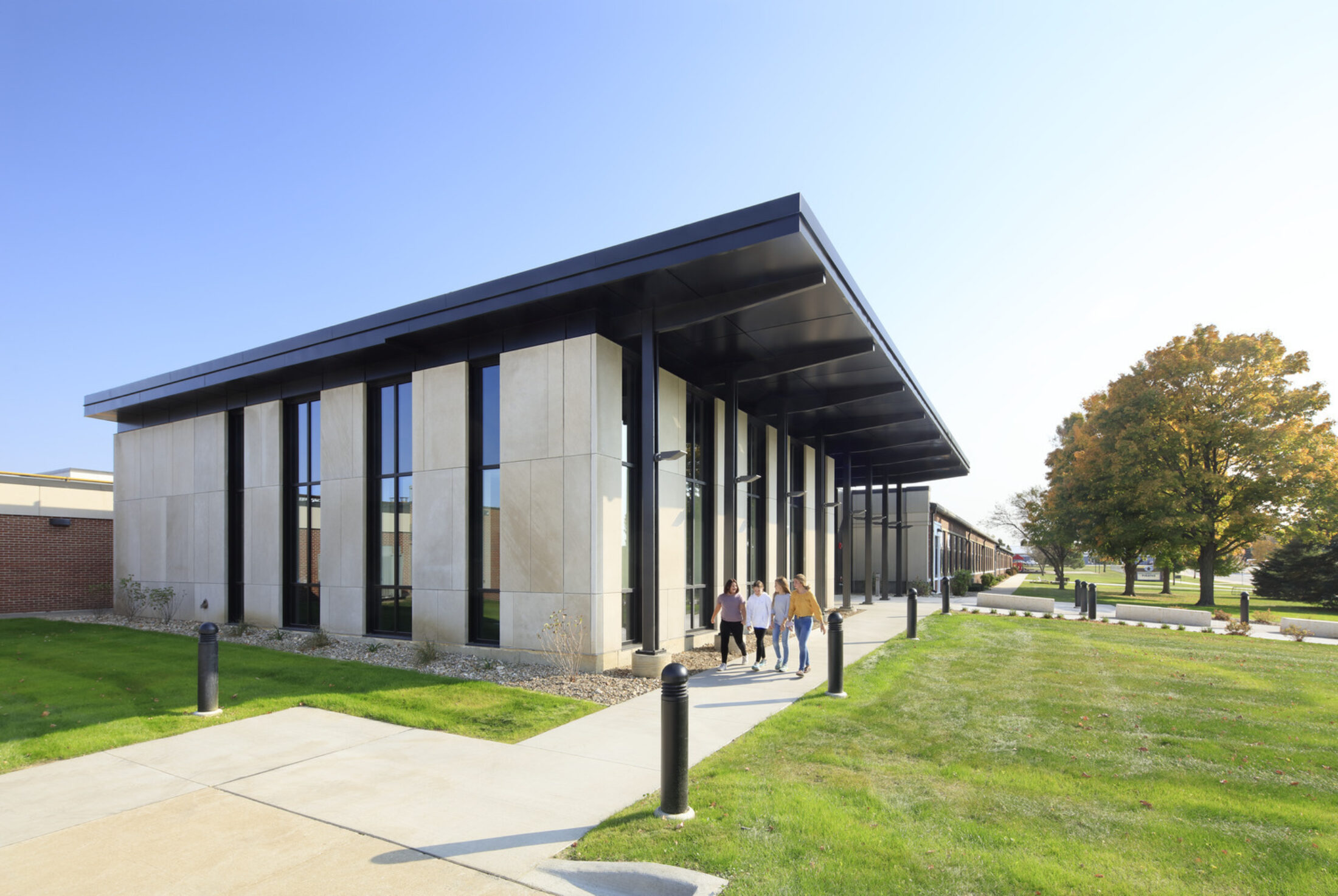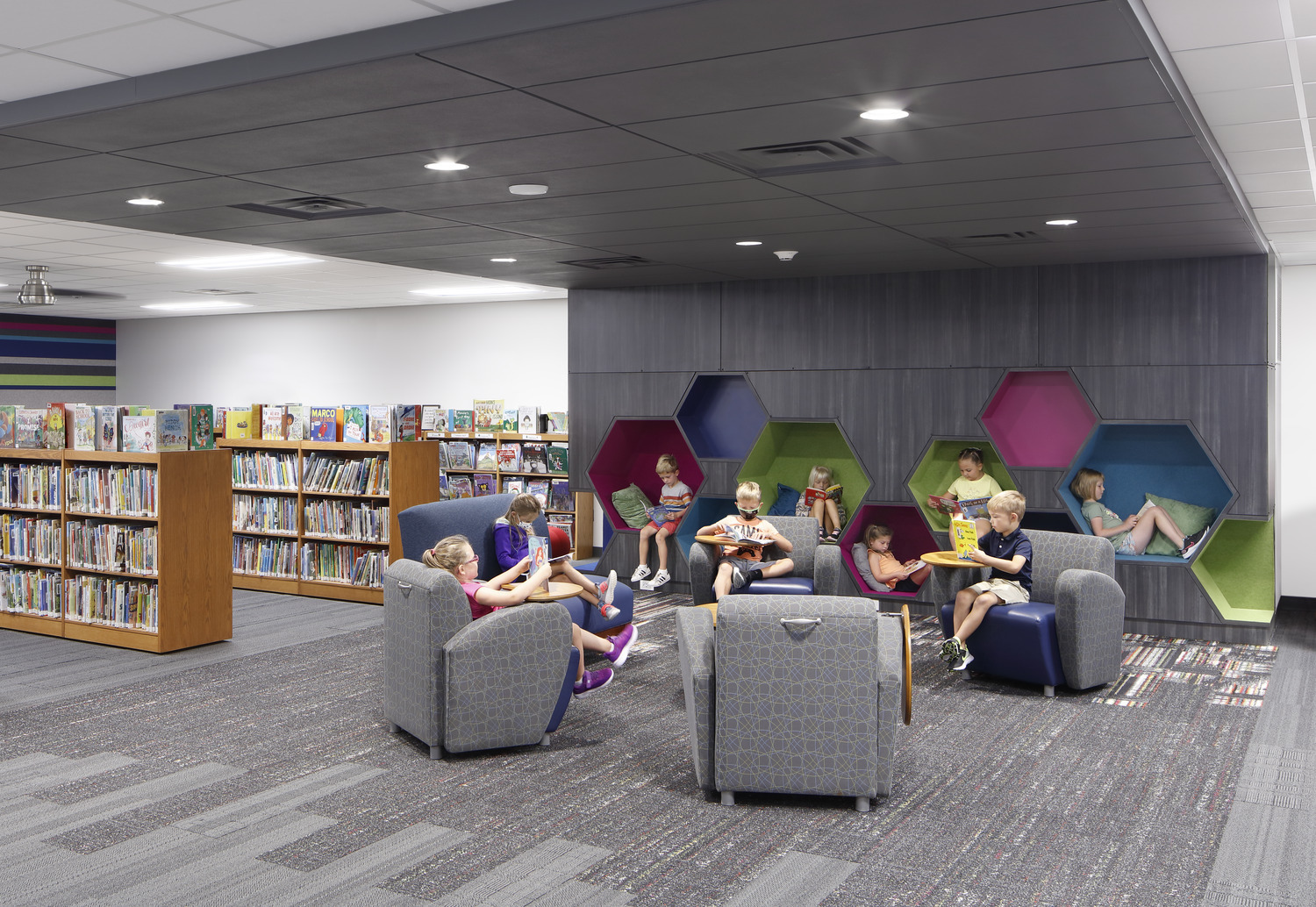Just inside this new entrance and adjacent to the modernized media center, the new multipurpose academic commons area was created for dining, group collaboration, and after-hours community events. These common areas now also feature a significant amount of daylight and exterior views for a bright, open atmosphere.