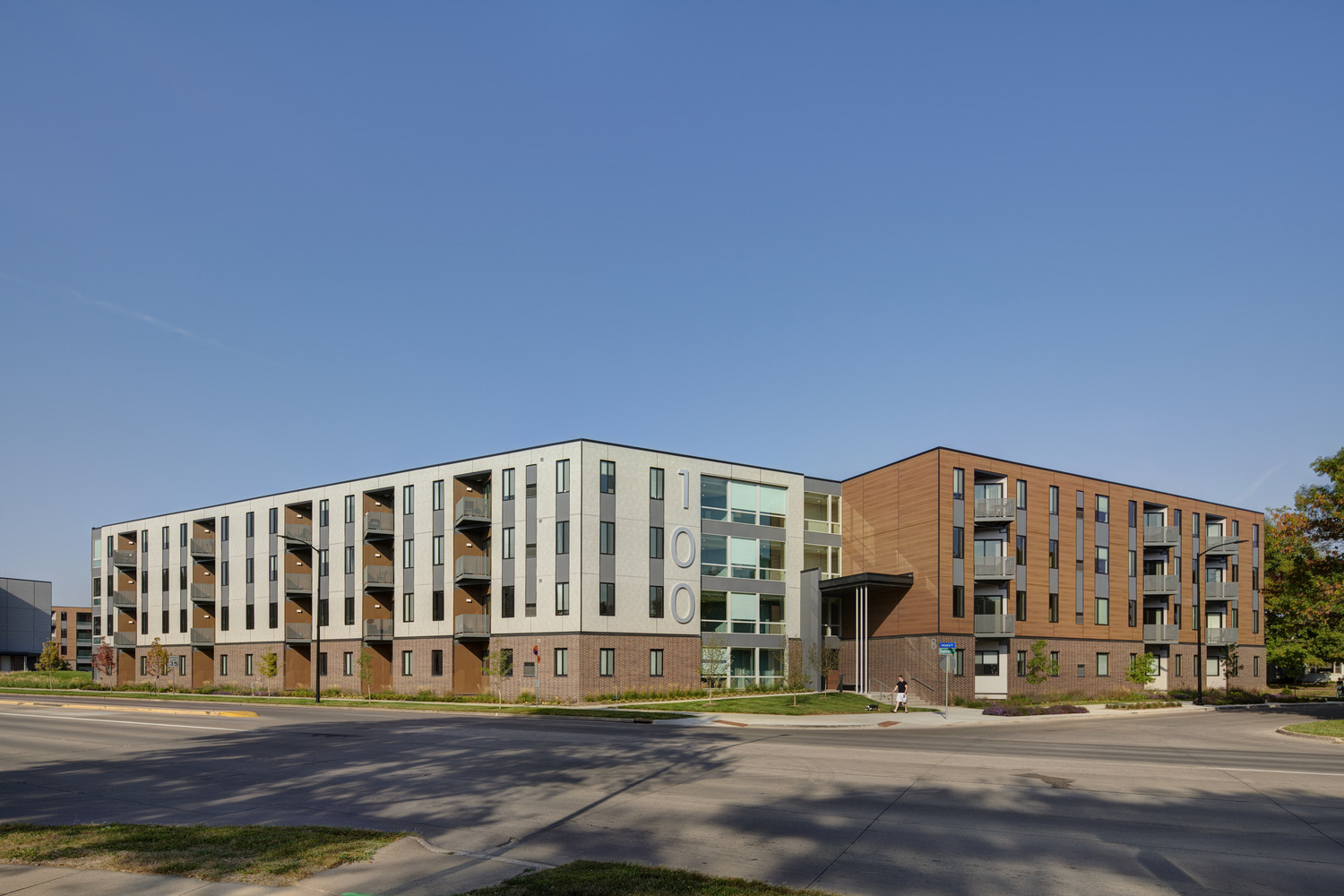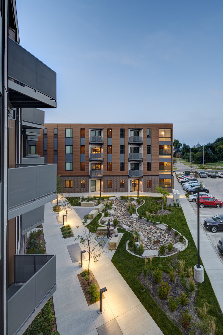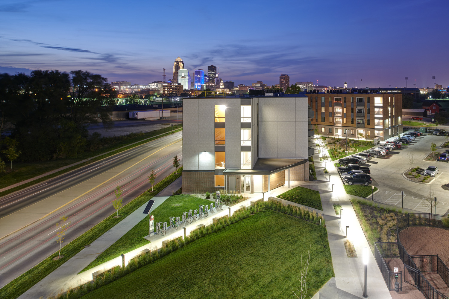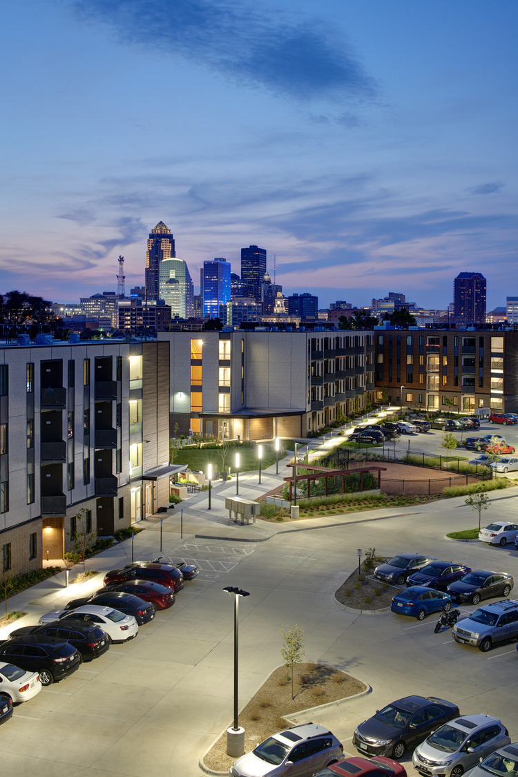 The client’s goals for this project in the Two Rivers district were to create connections to the adjacent bike trails and downtown Des Moines and to offer a wide range of unit types — from studios to three-bedroom units. To accommodate the fast-paced schedule and development goals, the team coordinated a phased parallel design and documentation process.