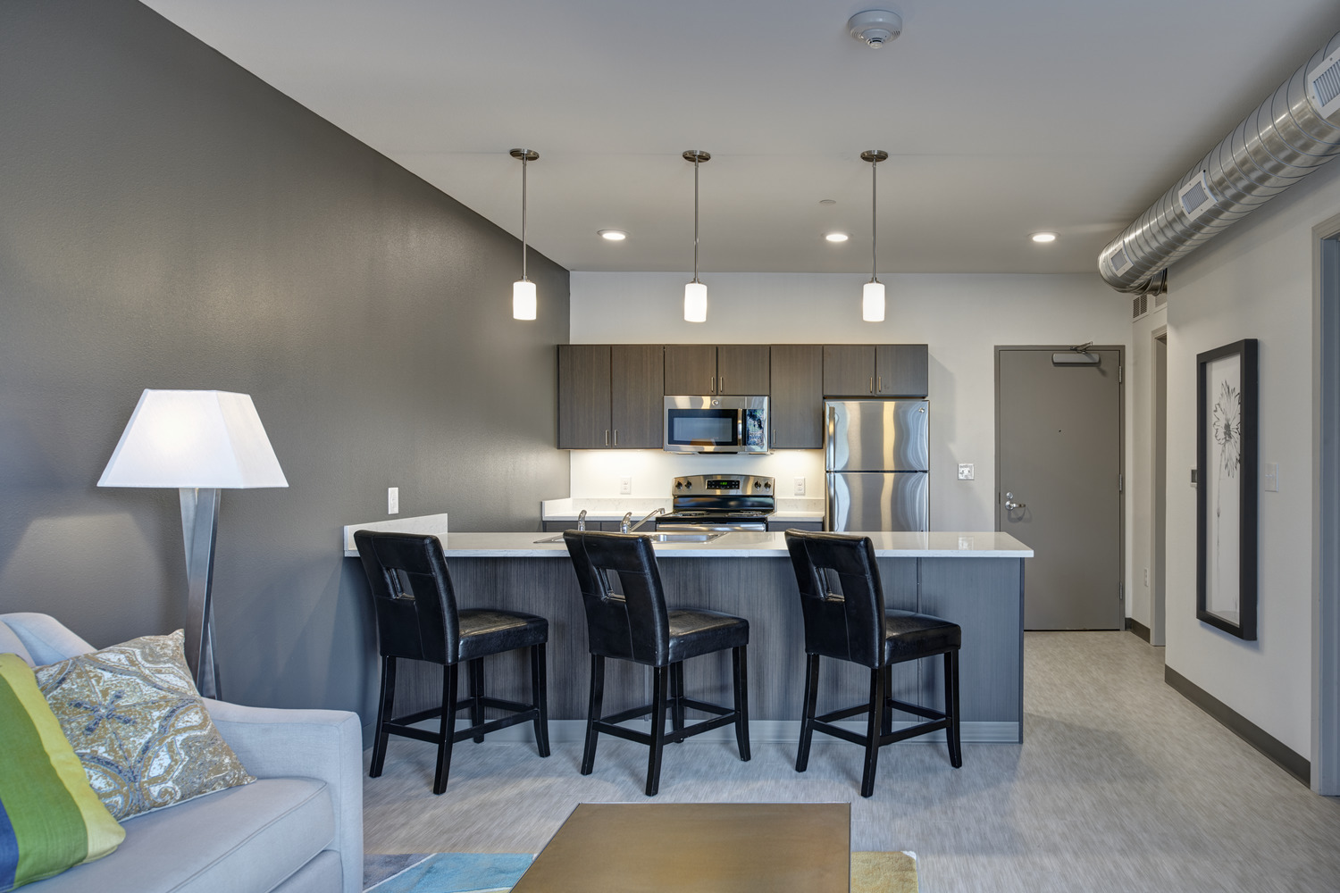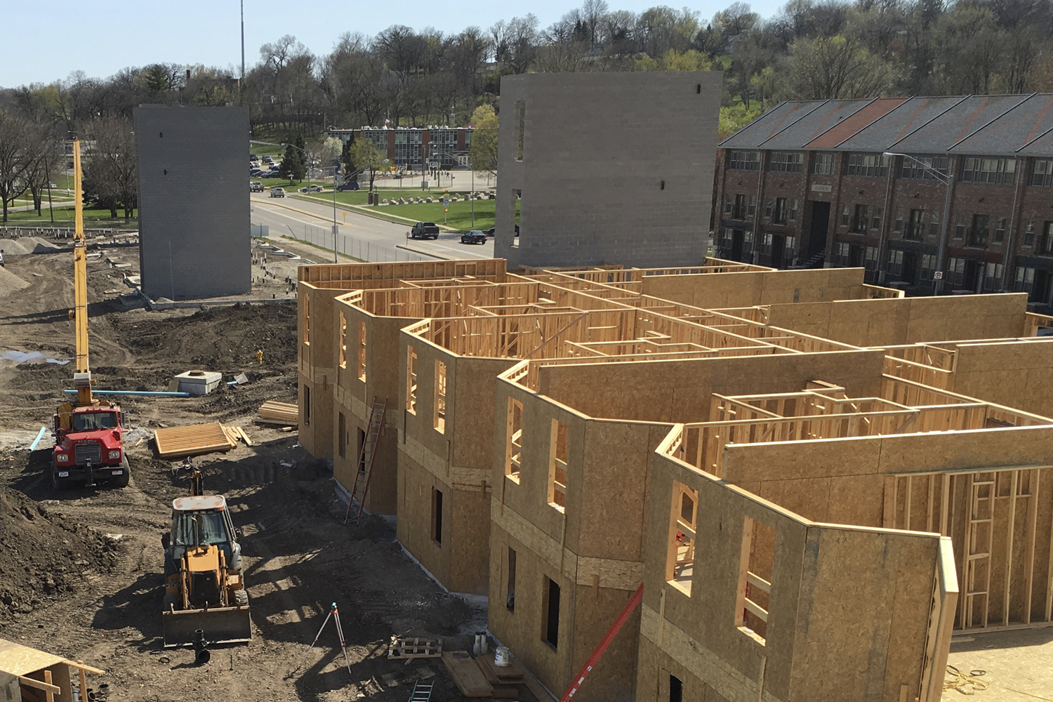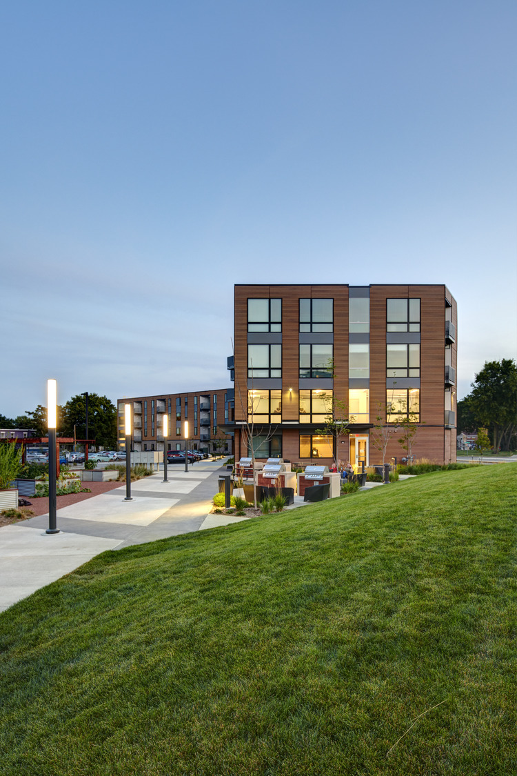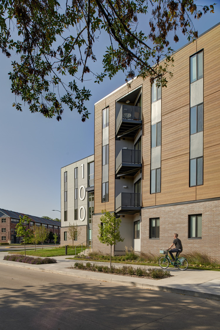 The client’s goals for this project in the Two Rivers district were to create connections to the adjacent bike trails and downtown Des Moines and to offer a wide range of unit types — from studios to three-bedroom units. To accommodate the fast-paced schedule and development goals, the team coordinated a phased parallel design and documentation process.