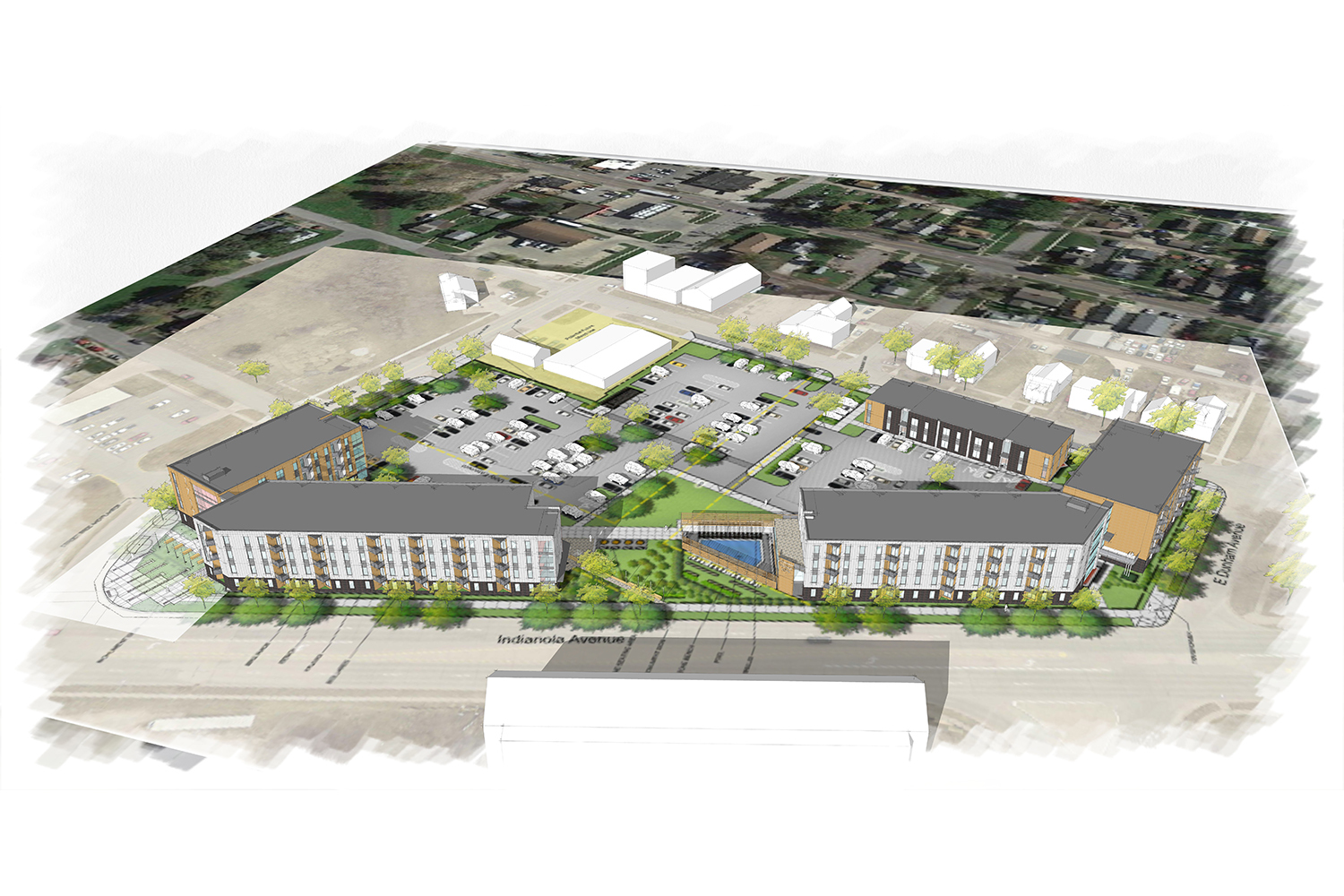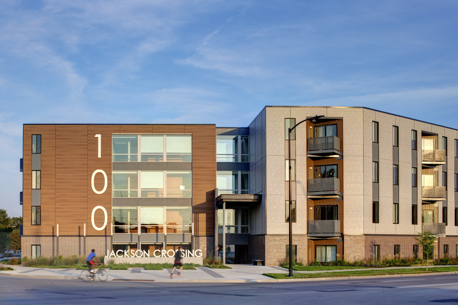 The completed Jackson Crossing complex is 165,000sf across three buildings, providing 244 market-rate apartments. The site included multiple abandoned roadways with significant and immovable utilities that the design needed to accommodate. With both an urban and a residential edge to the site, INVISION used this context to inform the massing of the buildings. Strategic geometric forms maximized downtown views and defined the complex’s perimeter. To appeal to urban young professionals, Jackson Crossing features high-end amenities, including: