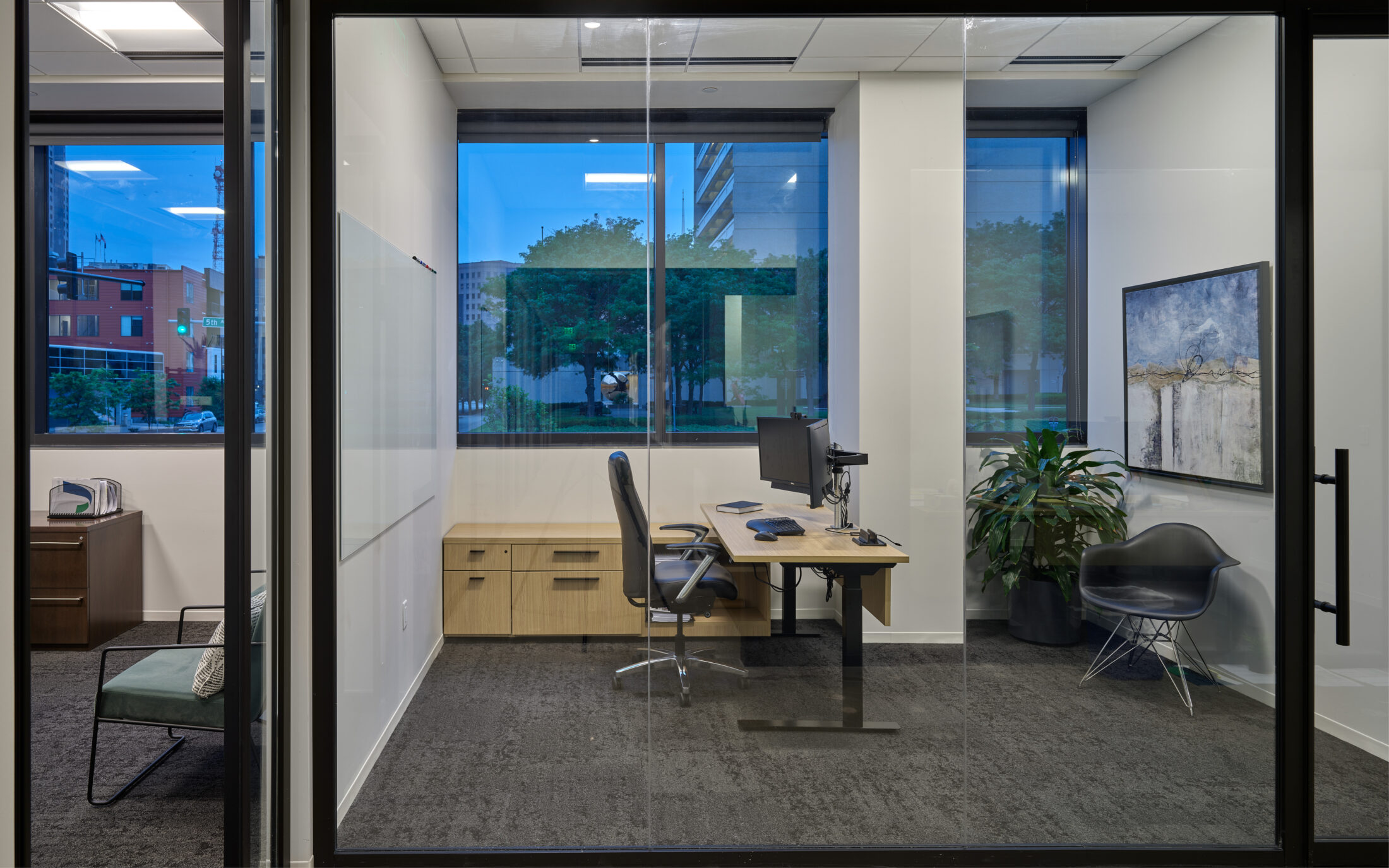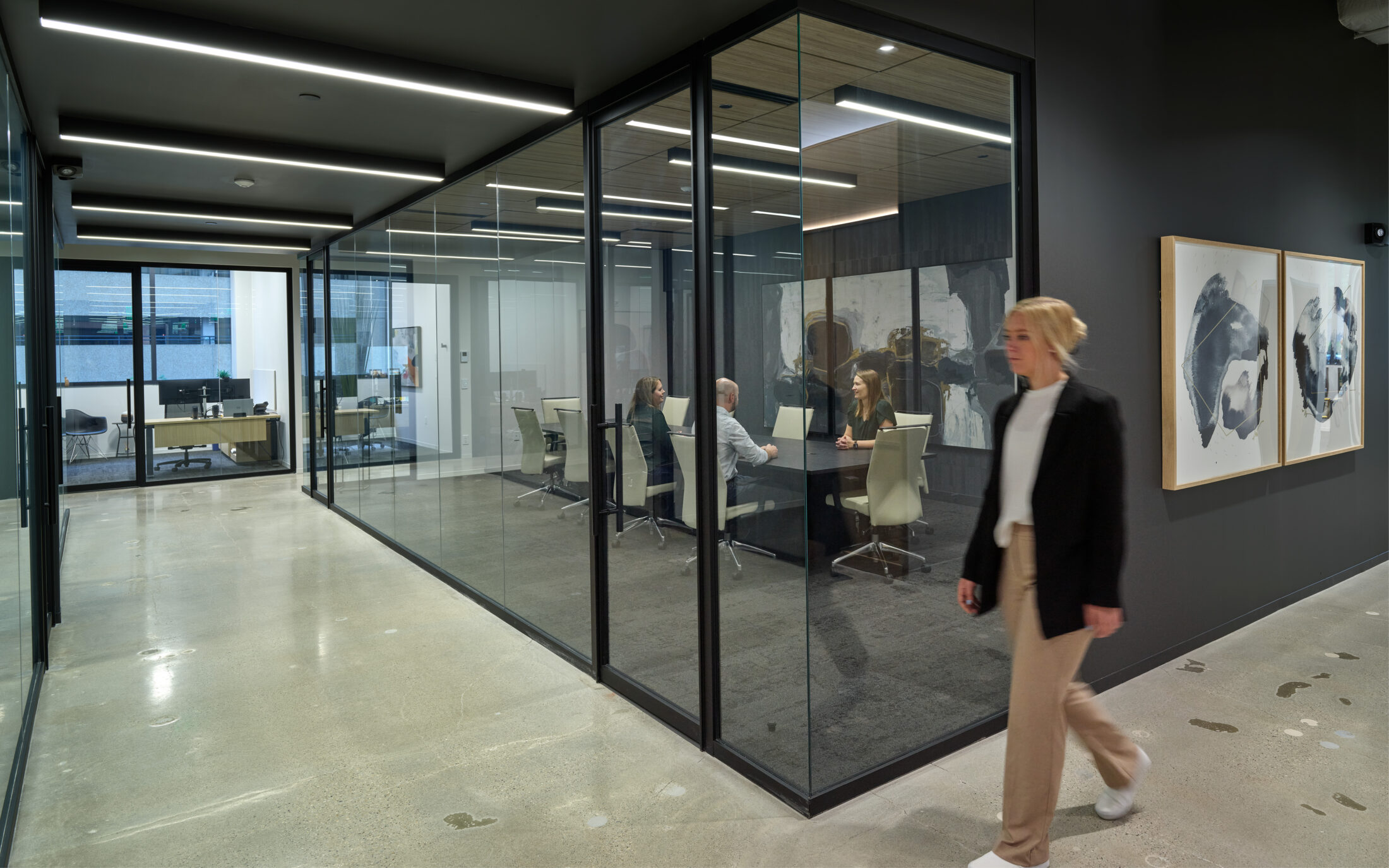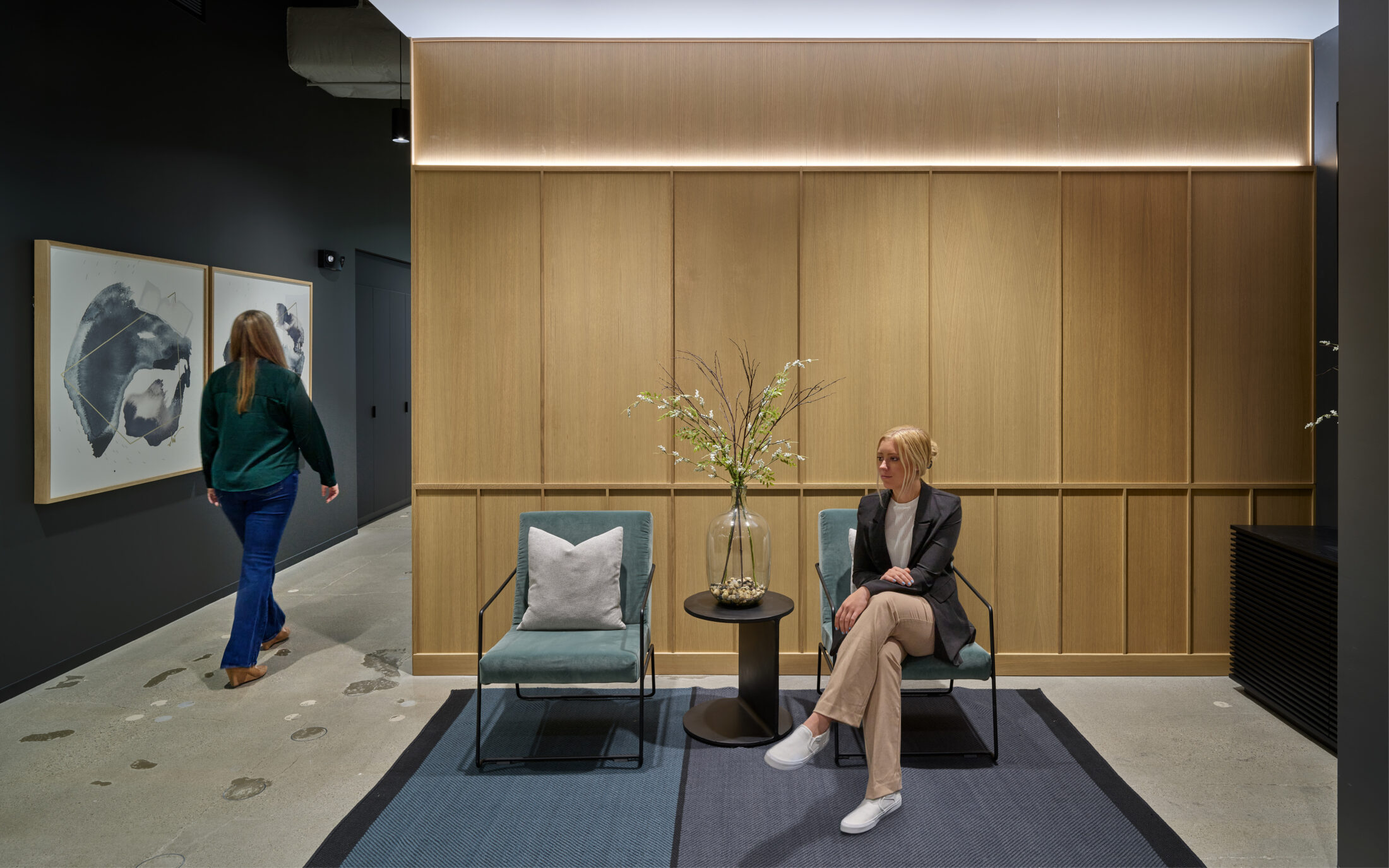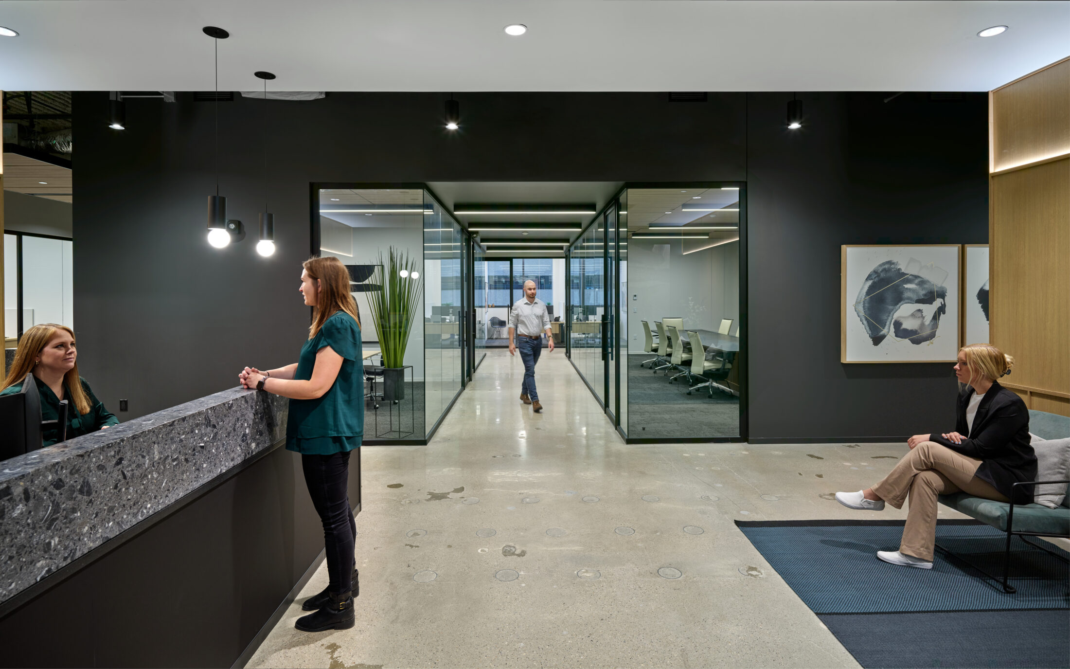 Upon arrival, visitors and employees are greeted by warm wood paneling, creating a welcoming entry experience. The intuitive racetrack layout positions private offices around the perimeter and social spaces at the core. These private offices are designed to meet the specific work needs of employees while maintaining an open and connected atmosphere through glazed fronts. This strategic use of glass allows natural light to permeate into the building, illuminating core spaces through borrowed light.