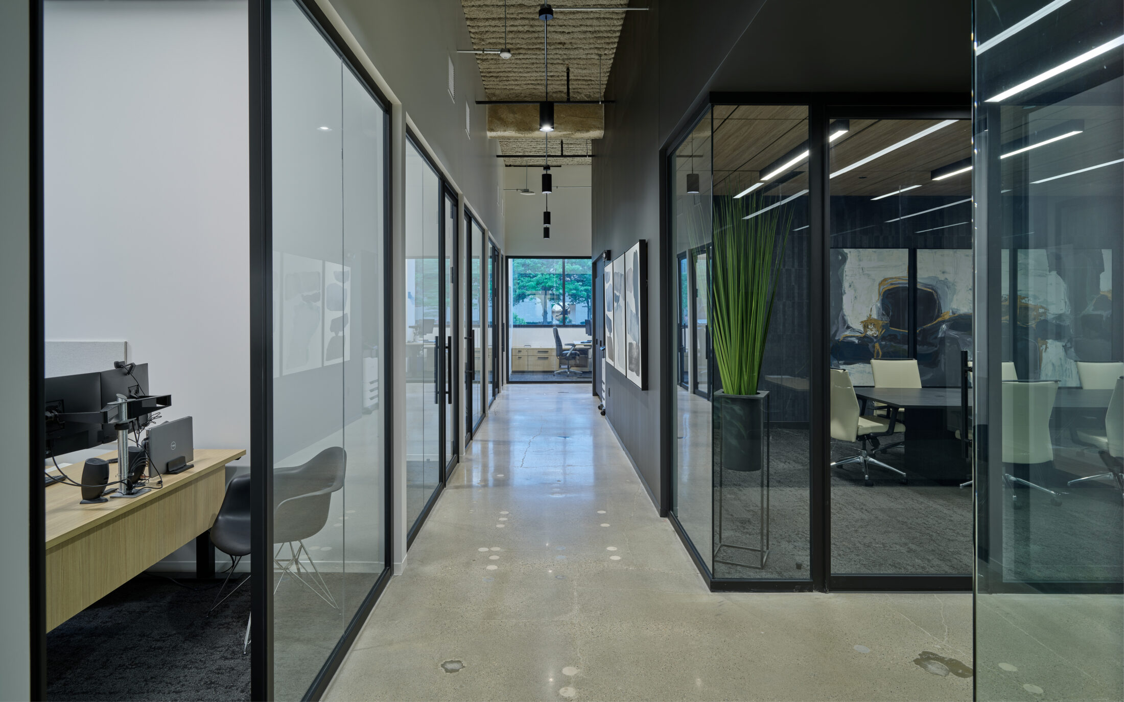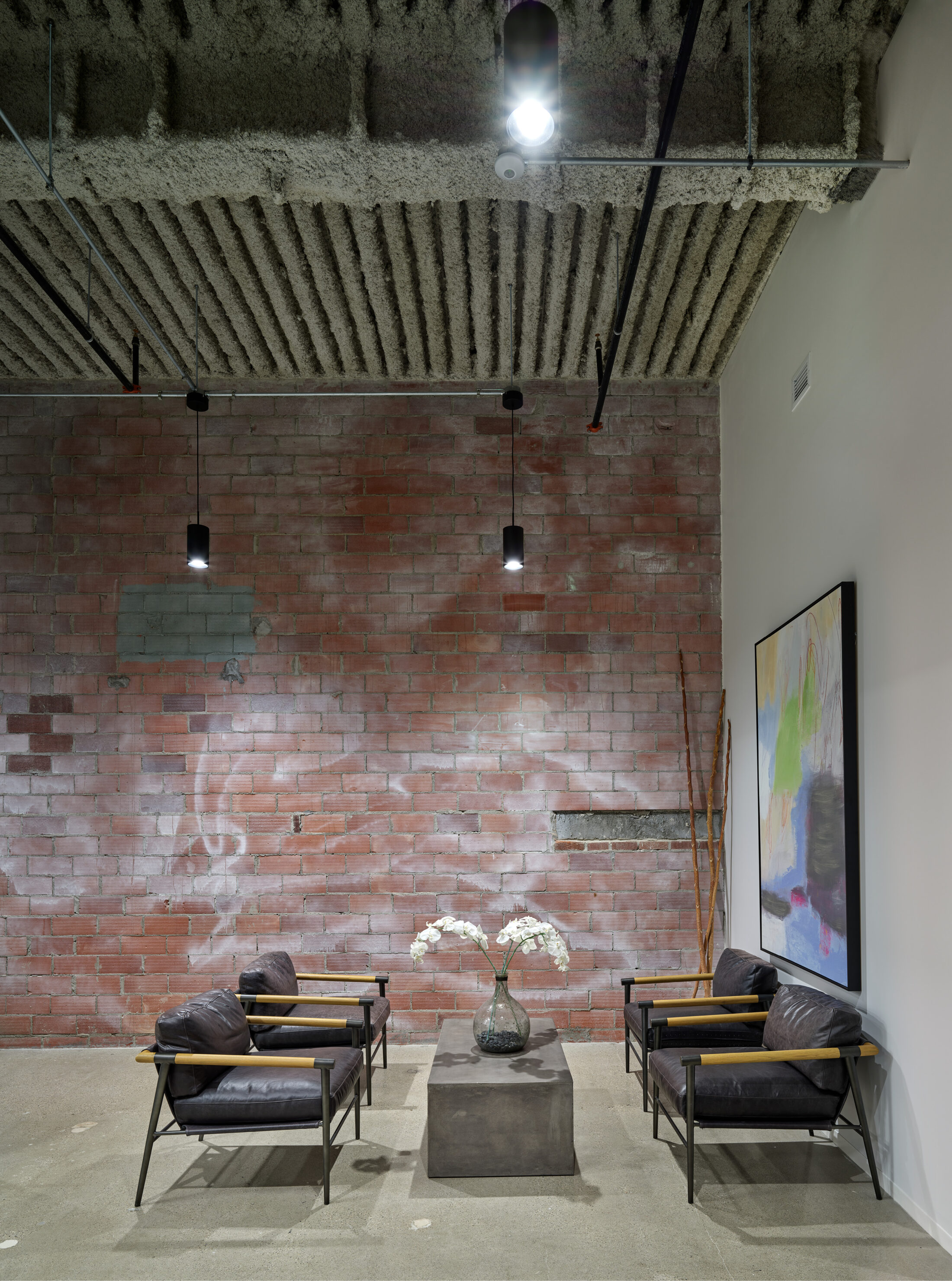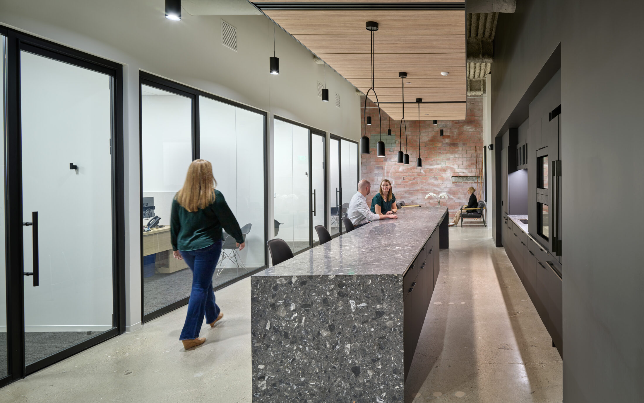 The central core, consisting of social spaces such as the staff lounge and conference rooms, features dark walls, creating a more intimate setting, contrasting with the bright and airy perimeter walls designed for focus and productivity. The preservation of existing brick walls adds character and structural context to the modern office, while exposed concrete floors and structures provide durability and contribute to the refined material palette.