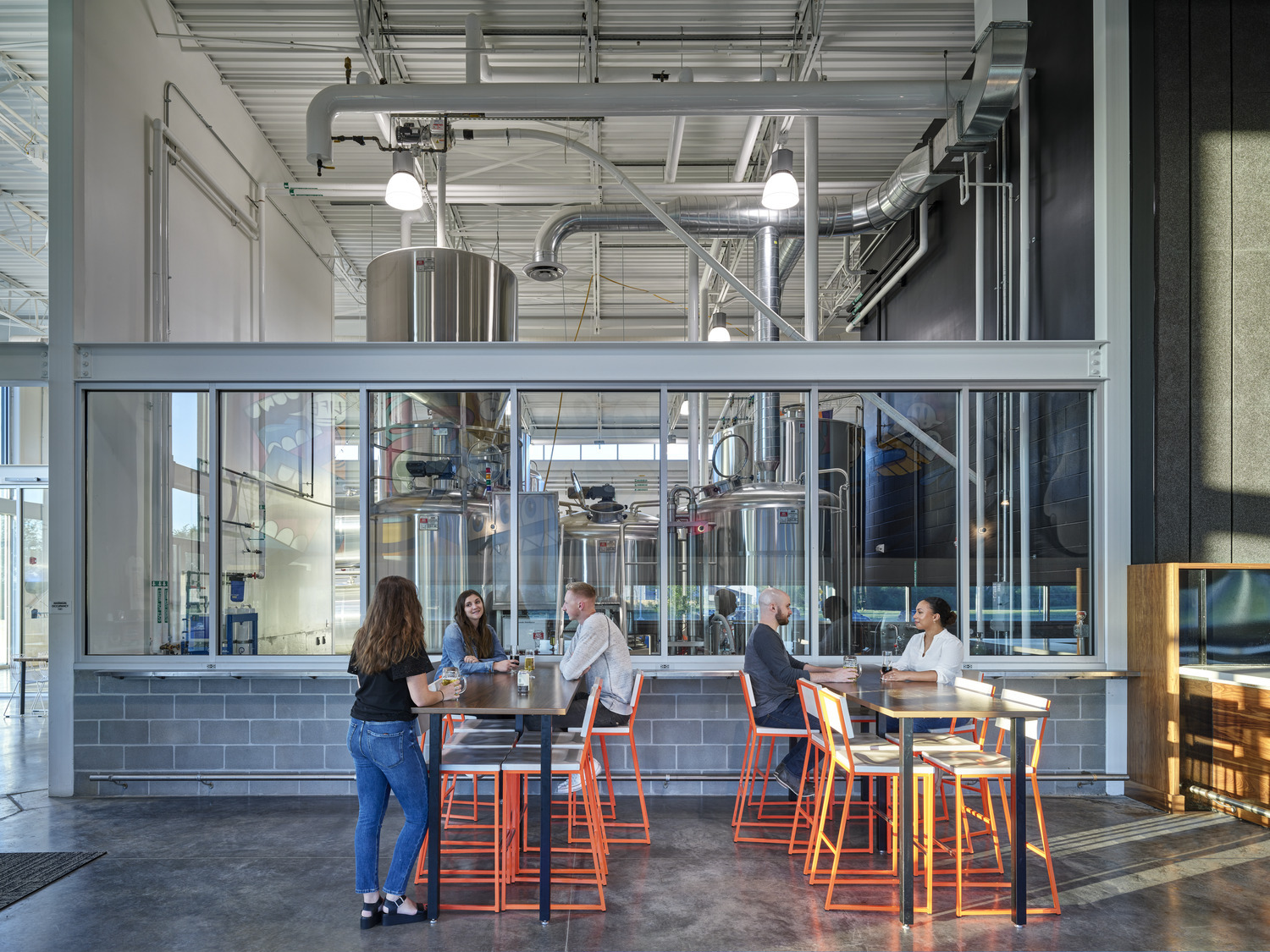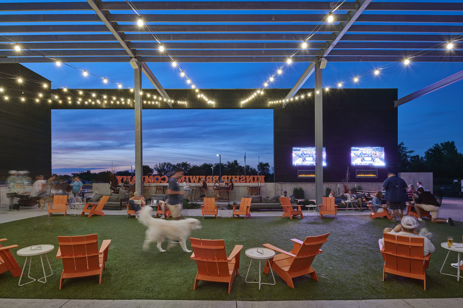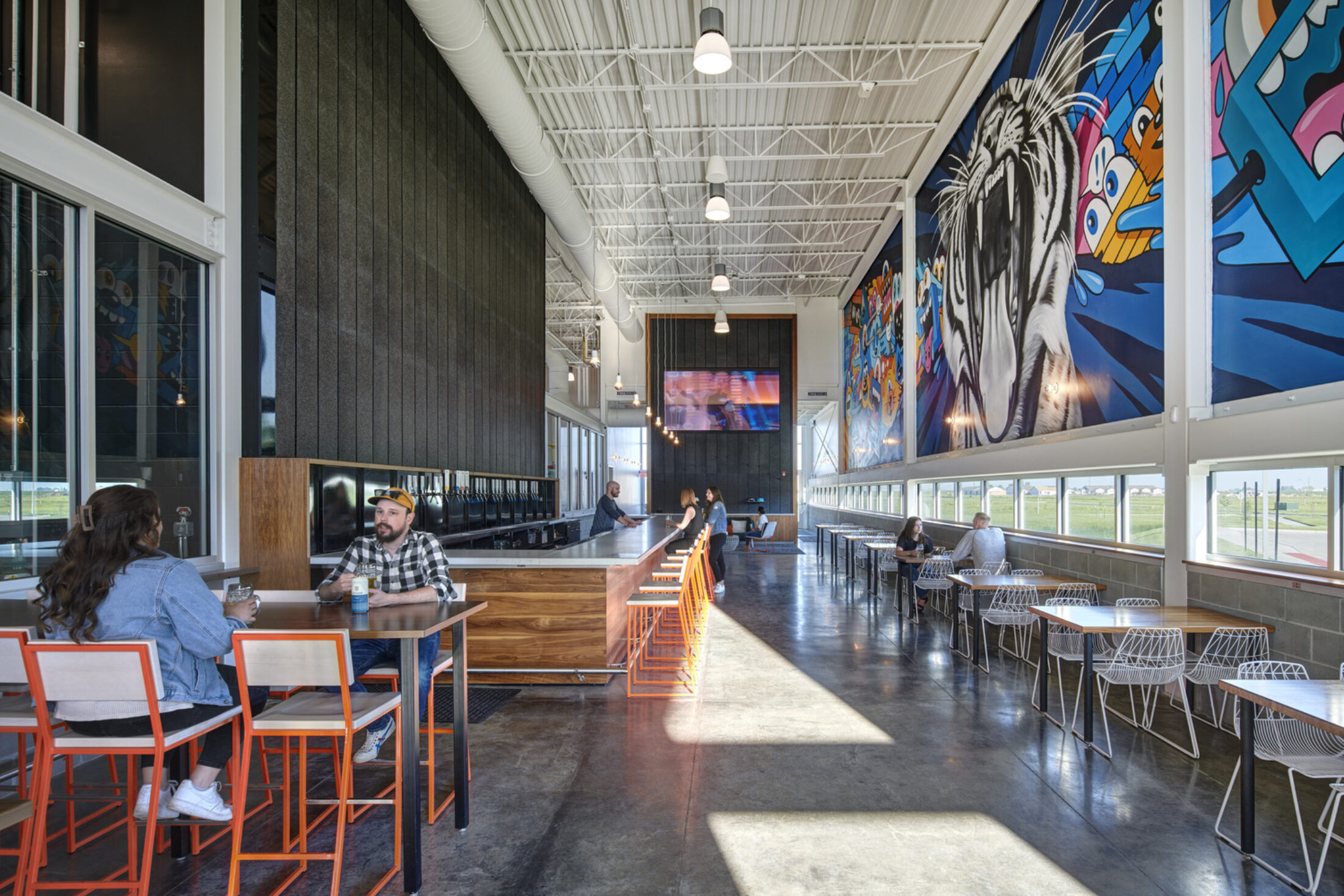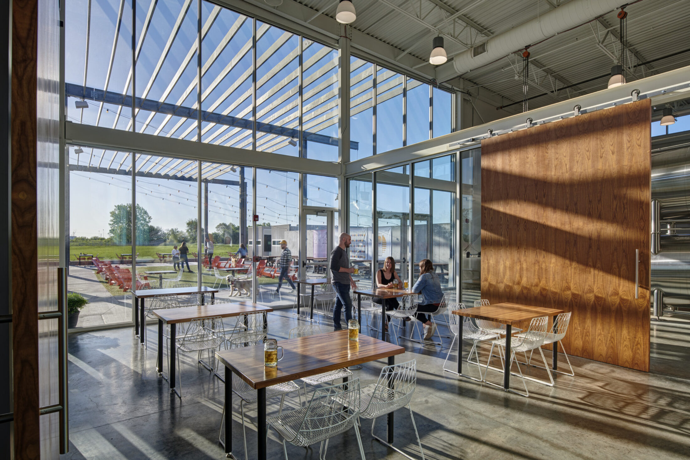 The building exterior has no paint finishes to minimize future maintenance costs and is complemented by a large outdoor patio and adjacent dog park, outdoor food service, fireplaces, music, and leisure sports. The acoustically-treated interior tasting room features a 14-foot-wide television, non-gendered restrooms, and an aromatic and visual connection to the heart of the operation: the 10,000sf brewing space.