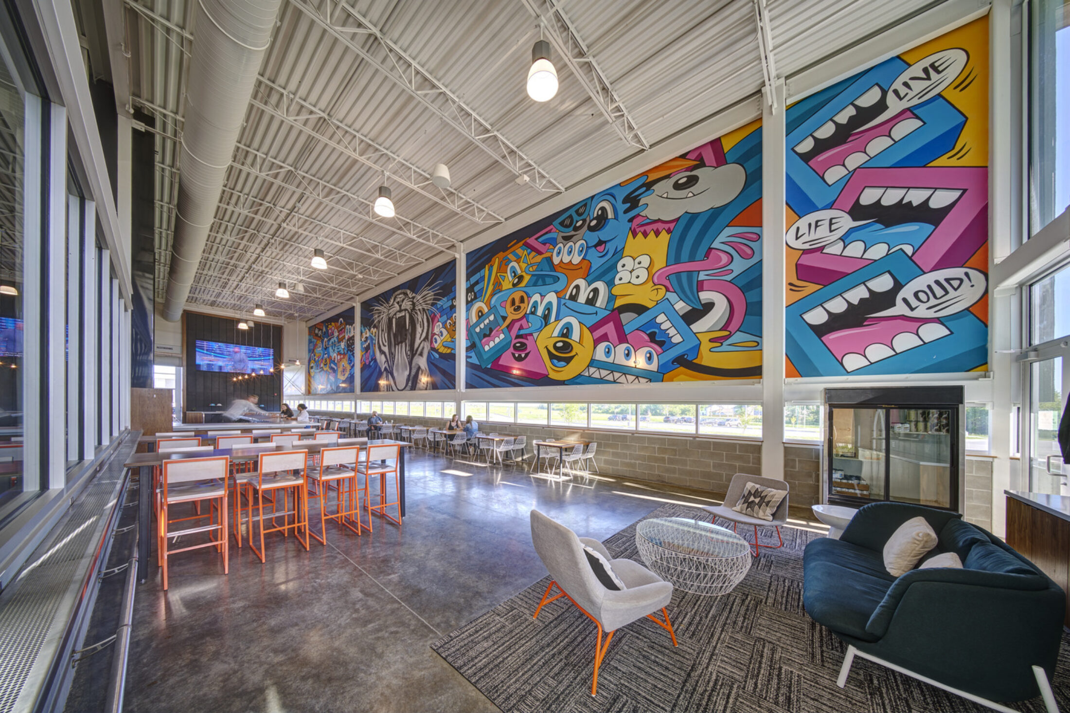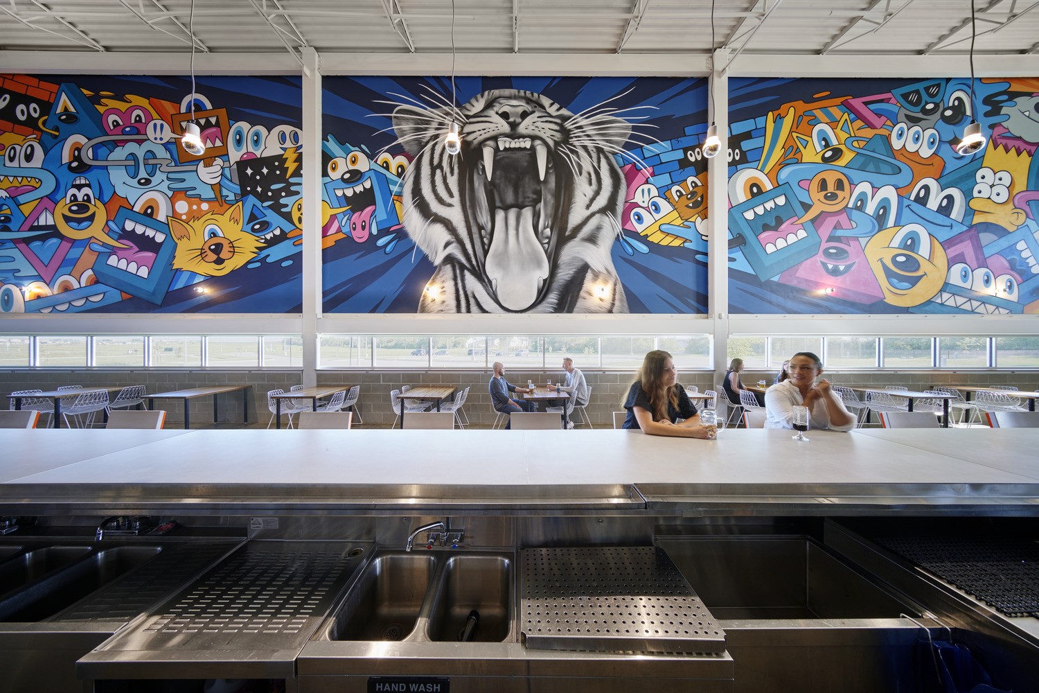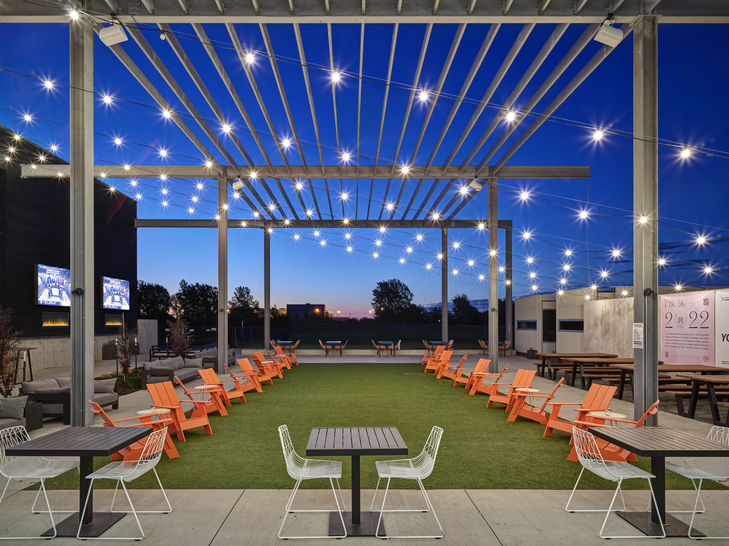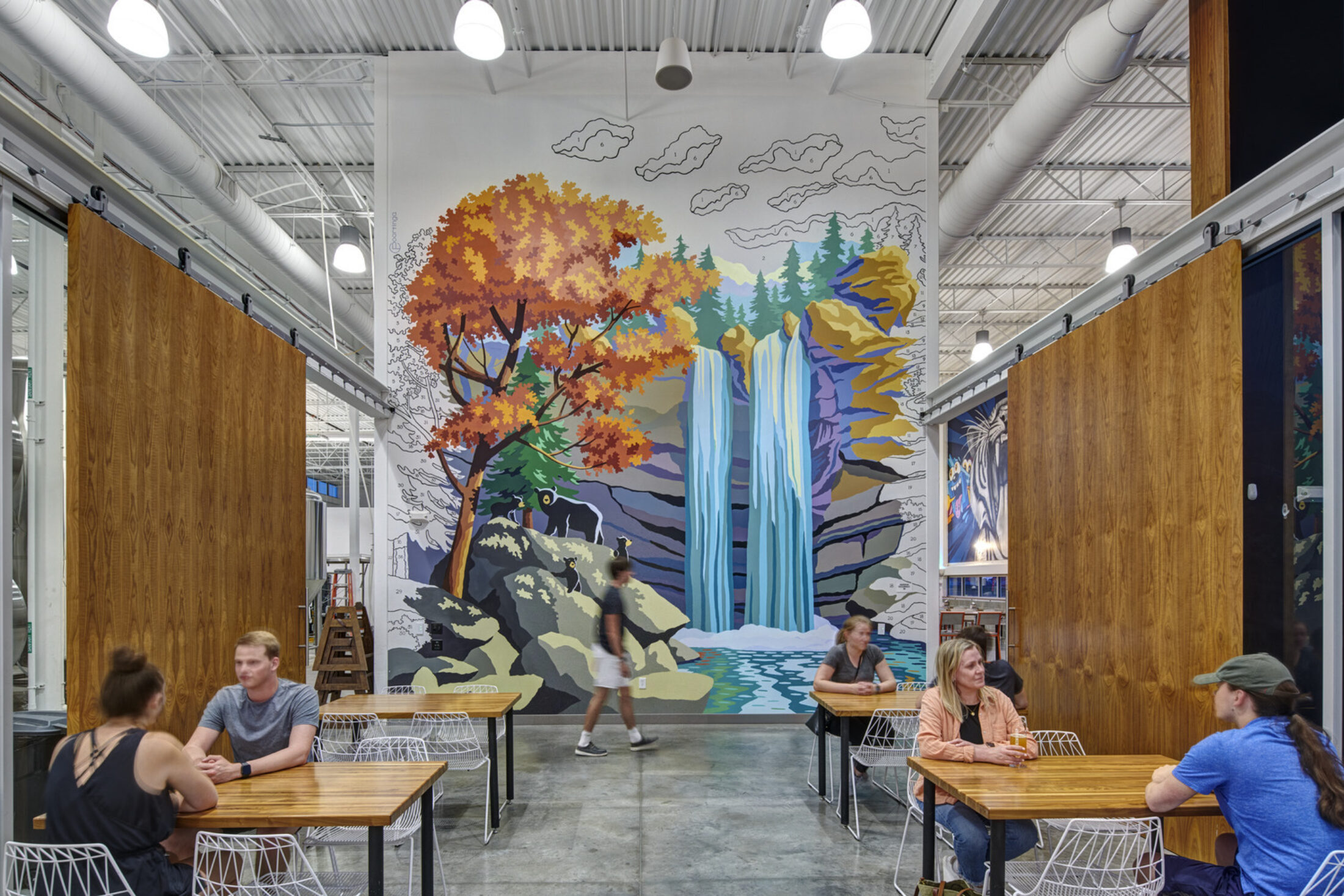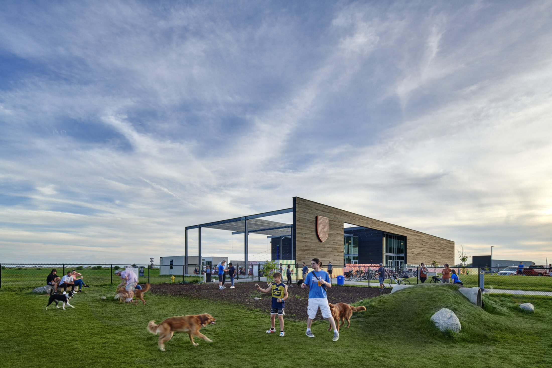 The building exterior has no paint finishes to minimize future maintenance costs and is complemented by a large outdoor patio and adjacent dog park, outdoor food service, fireplaces, music, and leisure sports. The acoustically-treated interior tasting room features a 14-foot-wide television, non-gendered restrooms, and an aromatic and visual connection to the heart of the operation: the 10,000sf brewing space.