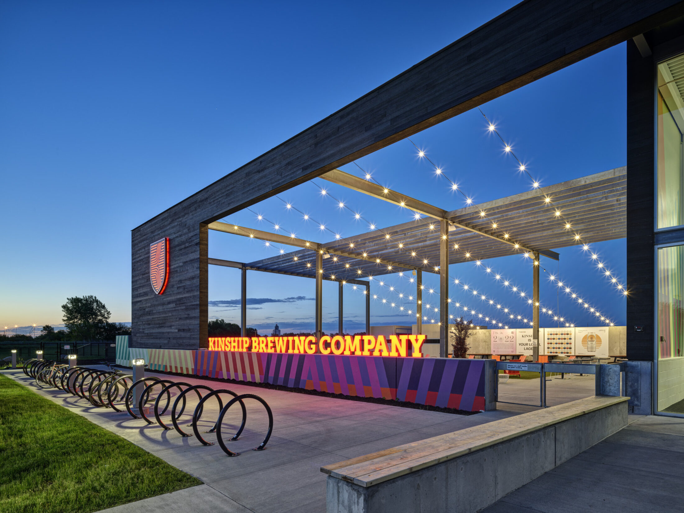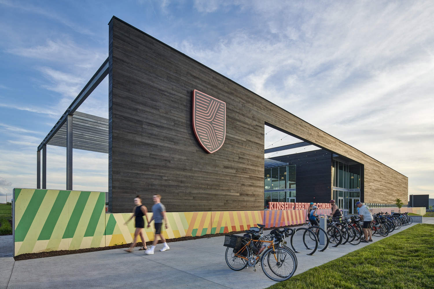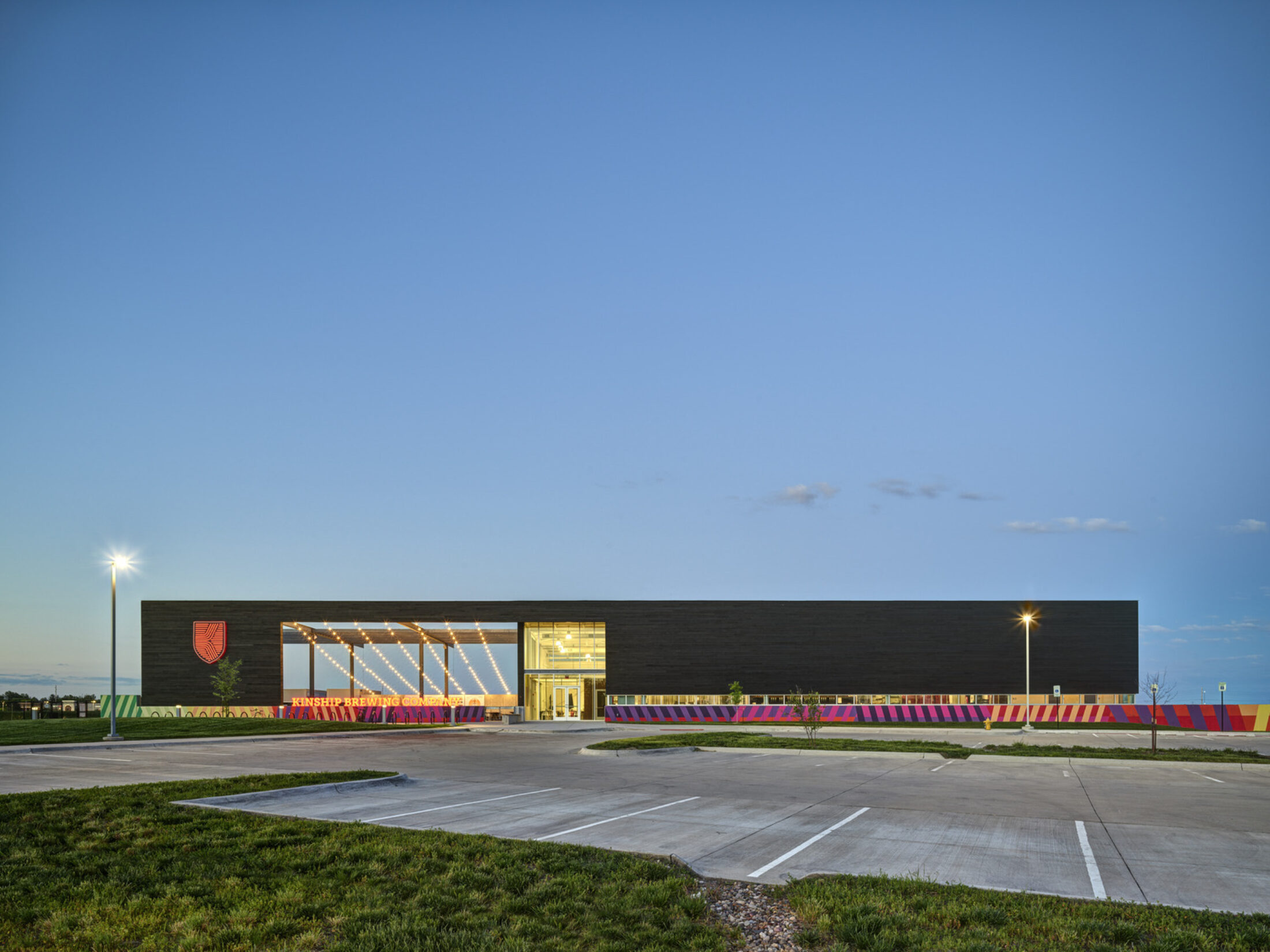 To achieve the Dobecks’ dream, the 13,000sf brewery incorporated state-of-the-art technologies with passive sustainability measures, creating a gathering spot for cyclists, dog-owners, music-lovers, and beer connoisseurs alike. Arrival by car begins with two stormwater detention ponds, fed by a carefully graded site to eliminate underground piping. Visitors arriving by foot or bicycle via the Raccoon River Valley Trail are greeted by the Kinship flag, flying above the treelined path.