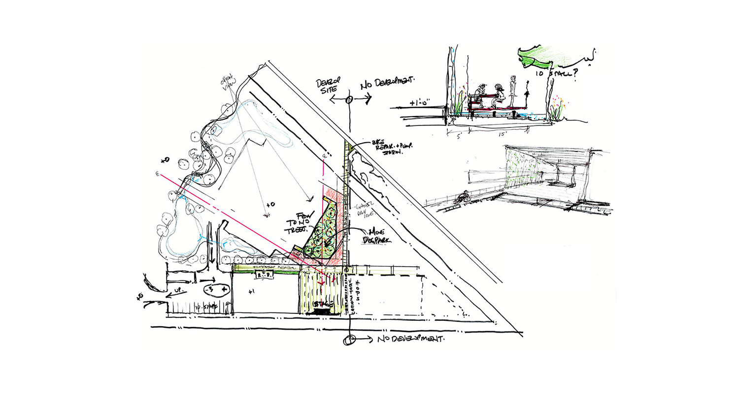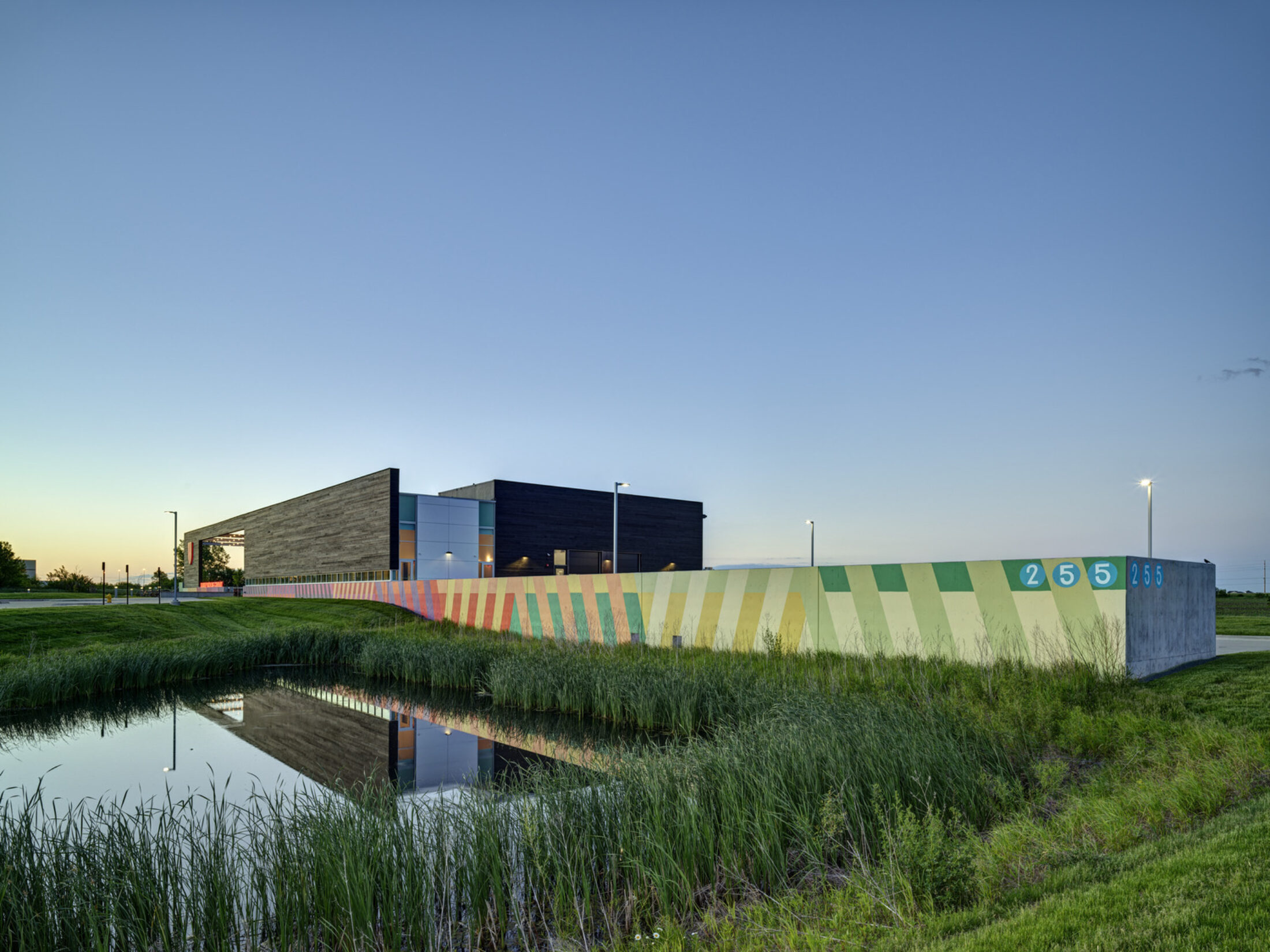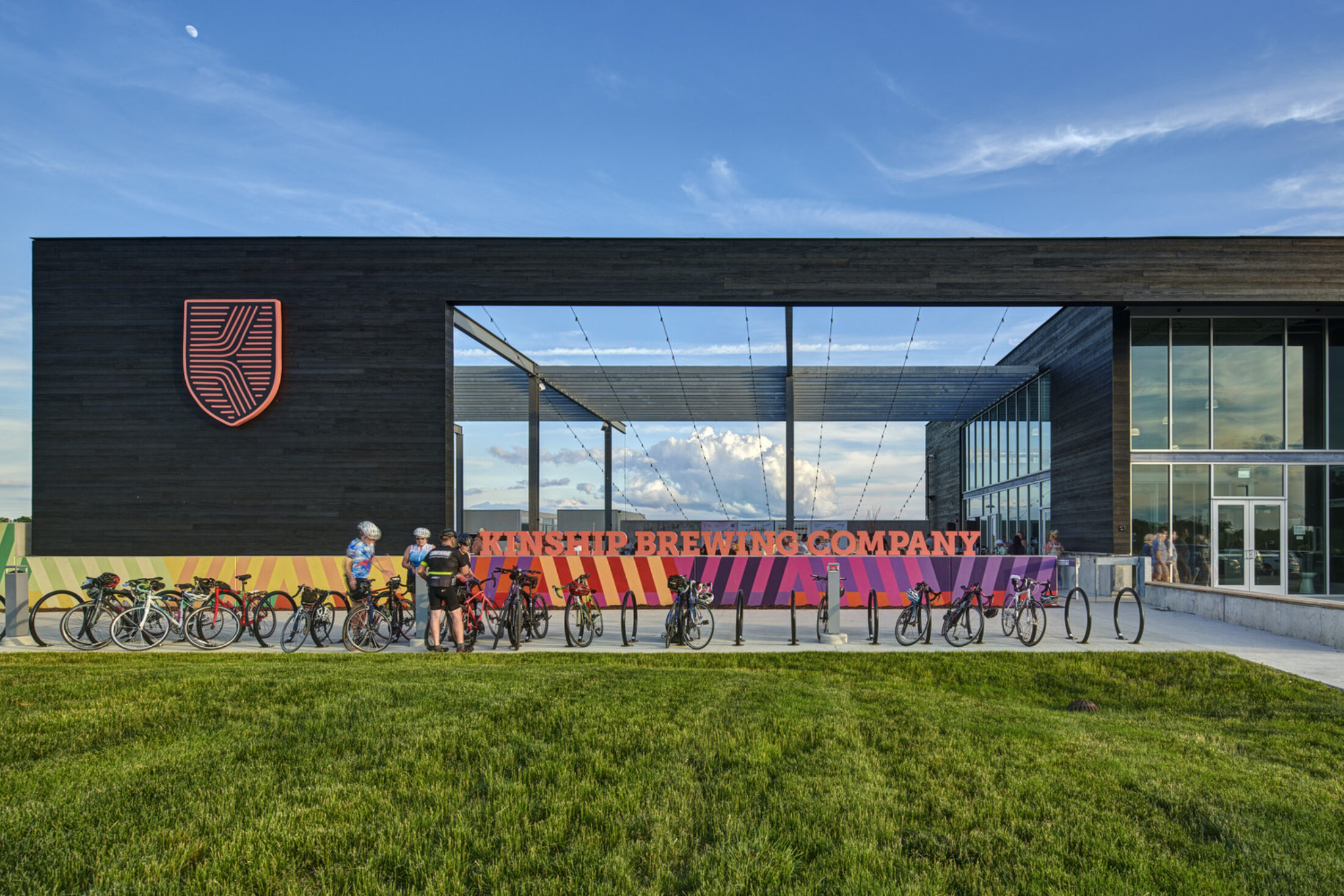To achieve the Dobecks’ dream, the 13,000sf brewery incorporated state-of-the-art technologies with passive sustainability measures, creating a gathering spot for cyclists, dog-owners, music-lovers, and beer connoisseurs alike. Arrival by car begins with two stormwater detention ponds, fed by a carefully graded site to eliminate underground piping. Visitors arriving by foot or bicycle via the Raccoon River Valley Trail are greeted by the Kinship flag, flying above the treelined path.