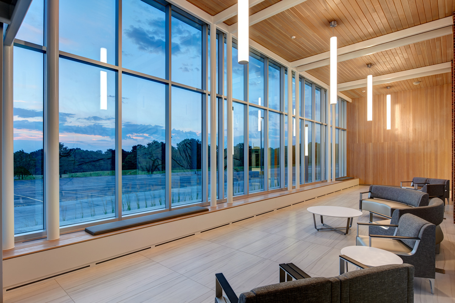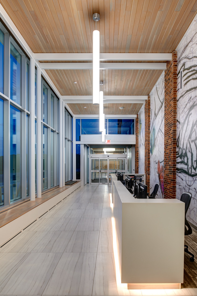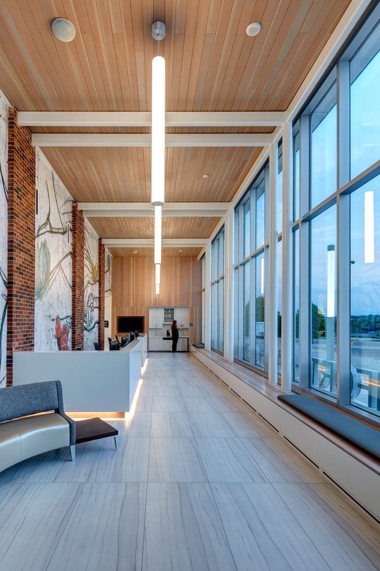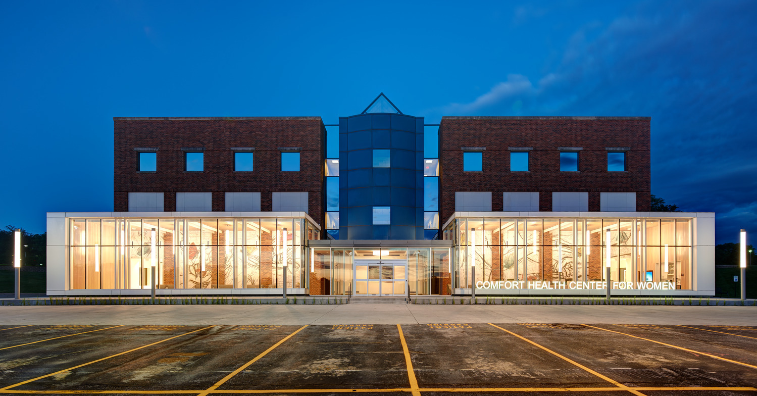 The center addition needed a strong physical presence and identity, as the existing building featured a heavy rhythm and symmetrical repetition through its materials. The design team created an innovative exterior entrance design featuring dramatic height and Corian cladding. The design incorporated spa-like finishes and elegant, high-performance glazing to leverage the healing qualities of daylight. Mercy Comfort Health Center for Women gives patients a welcoming, non-clinical, and comfortable atmosphere.