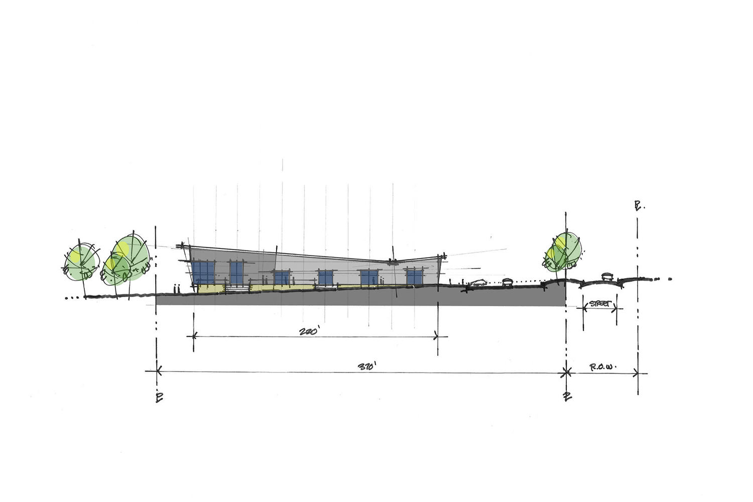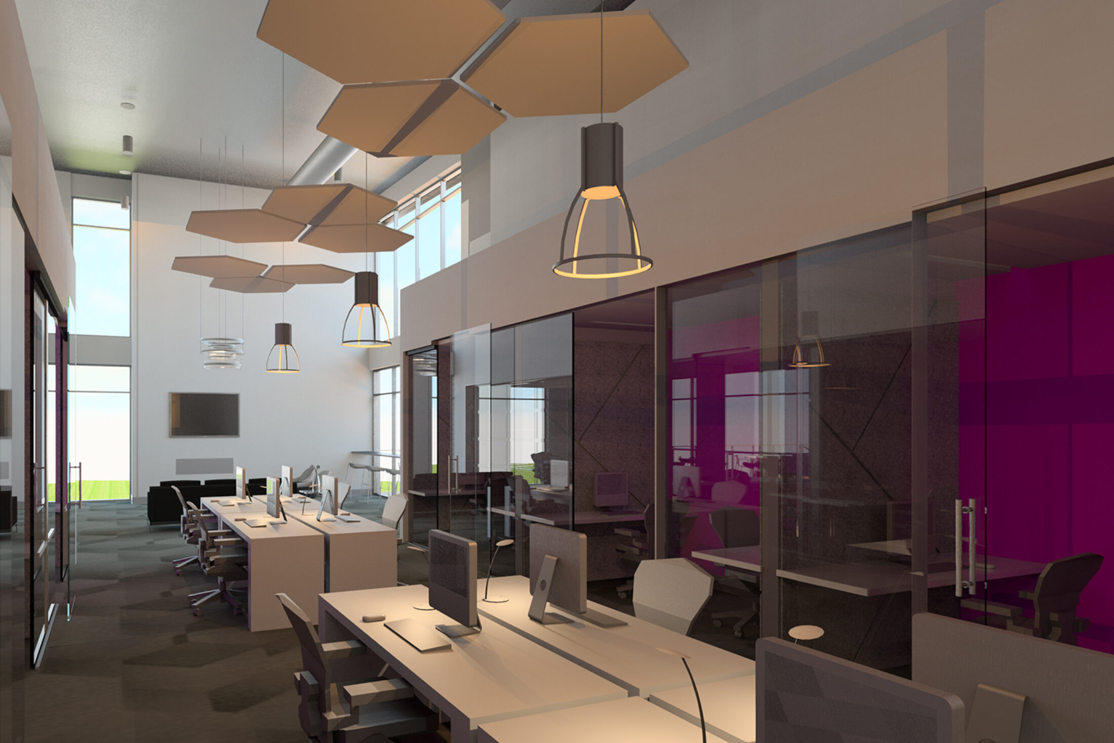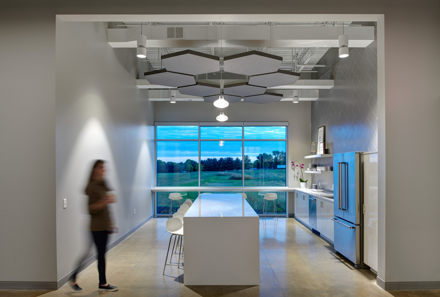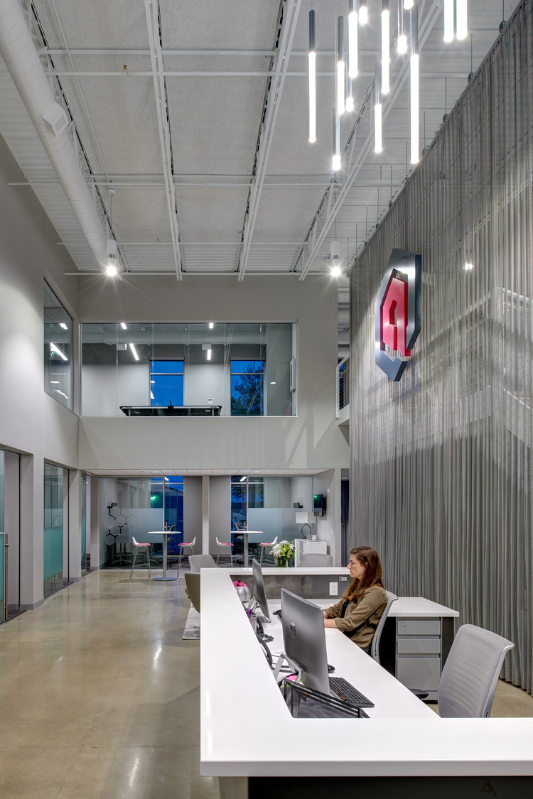 Early collaboration efforts between INVISION and ownership included 3D modeling as well as virtual tours and walkthroughs to visualize the space. The contemporary, mixed-material exterior features a sloping roof line and large vertical expanses of glass, creating distinction and bringing in natural light. For the real estate office, the design team created a unique space that caters to both employees and visitors.