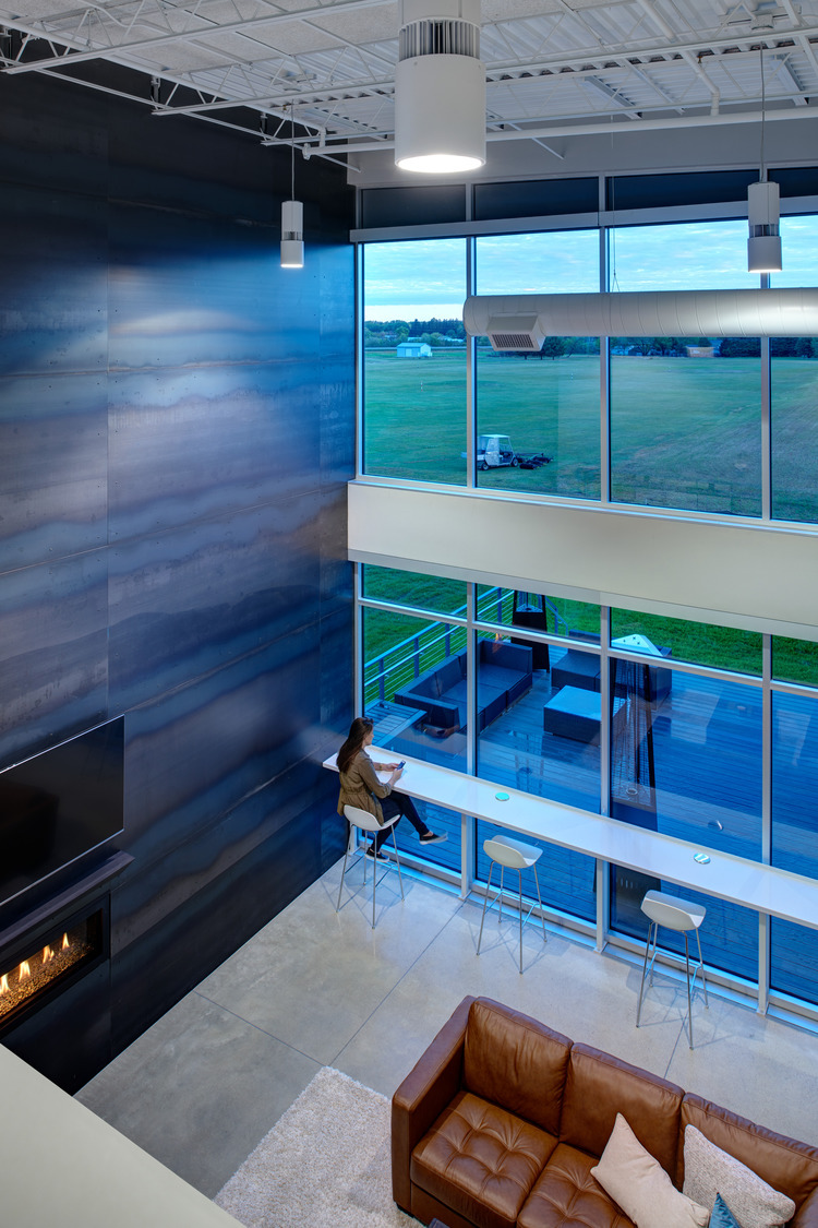 A grand, two-story entrance and the use of glass in select locations create an open environment with spaces for collaboration, privacy, quiet working, and recreation. Creative and flexible staff workspaces provide options for both collective and individually-focused work. Unconventional materials like a metal chain curtain divide the space and provide screening without interrupting the flow of the office. The large deck, upper mezzanine space, fireplaces, full kitchen, and children’s area all add to the unique fell of this real estate office.