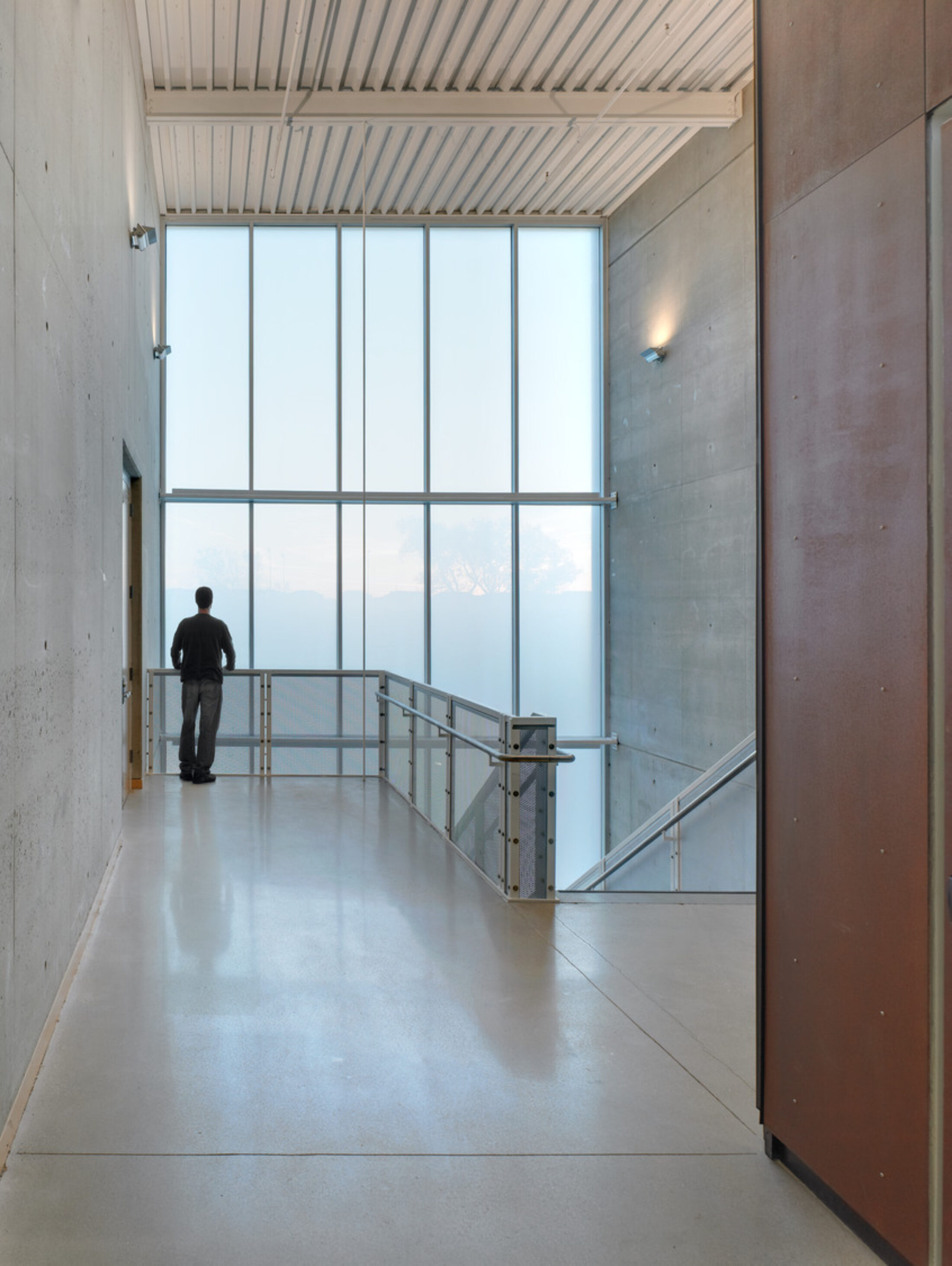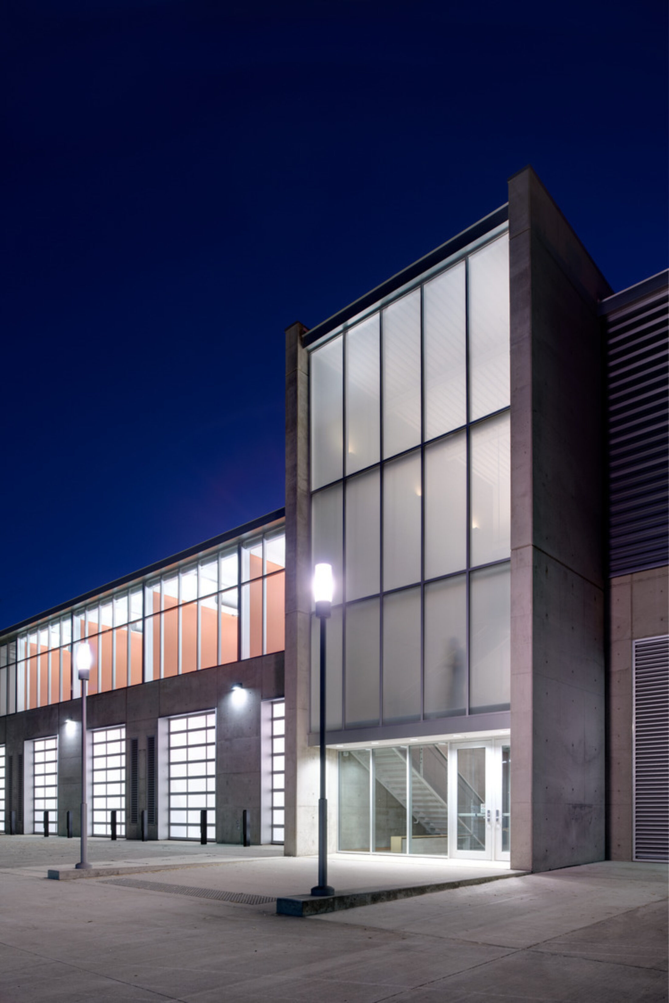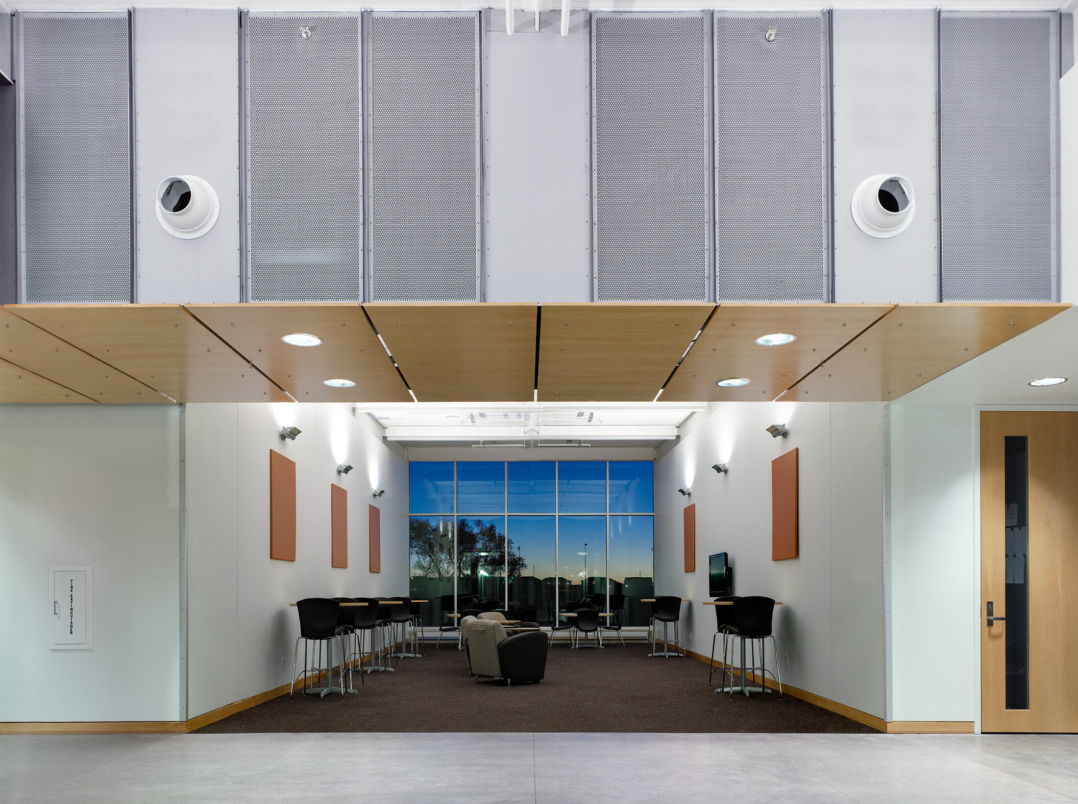 The “clean” student lounge, staff offices, and classrooms overlook an Outdoor Learning Lab. The building’s design featured distinctive lighting combined with translucent materials, creating a glowing-lantern effect in the evening. INVISION’s design mixed industrial materials and exposed structure with careful detailing that serves as a teaching tool for students.
