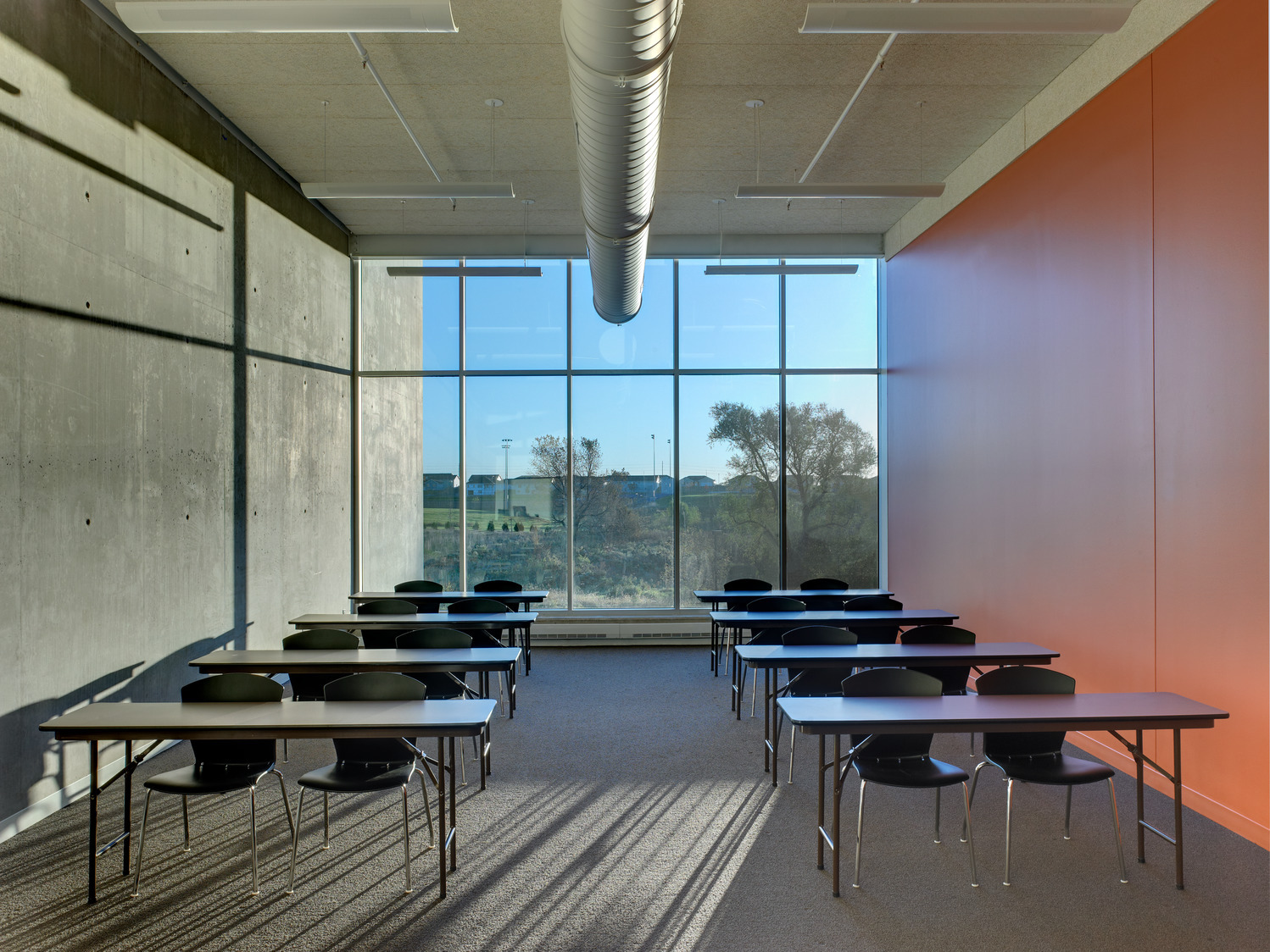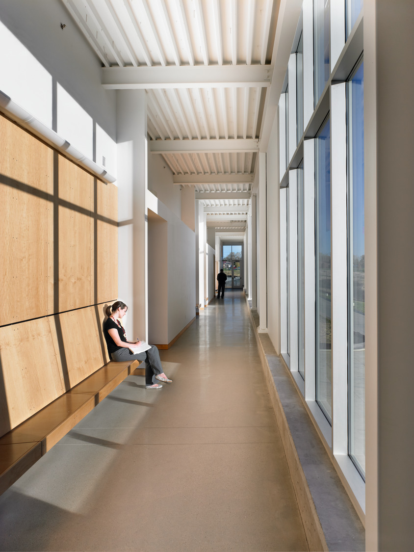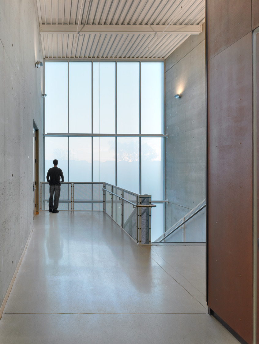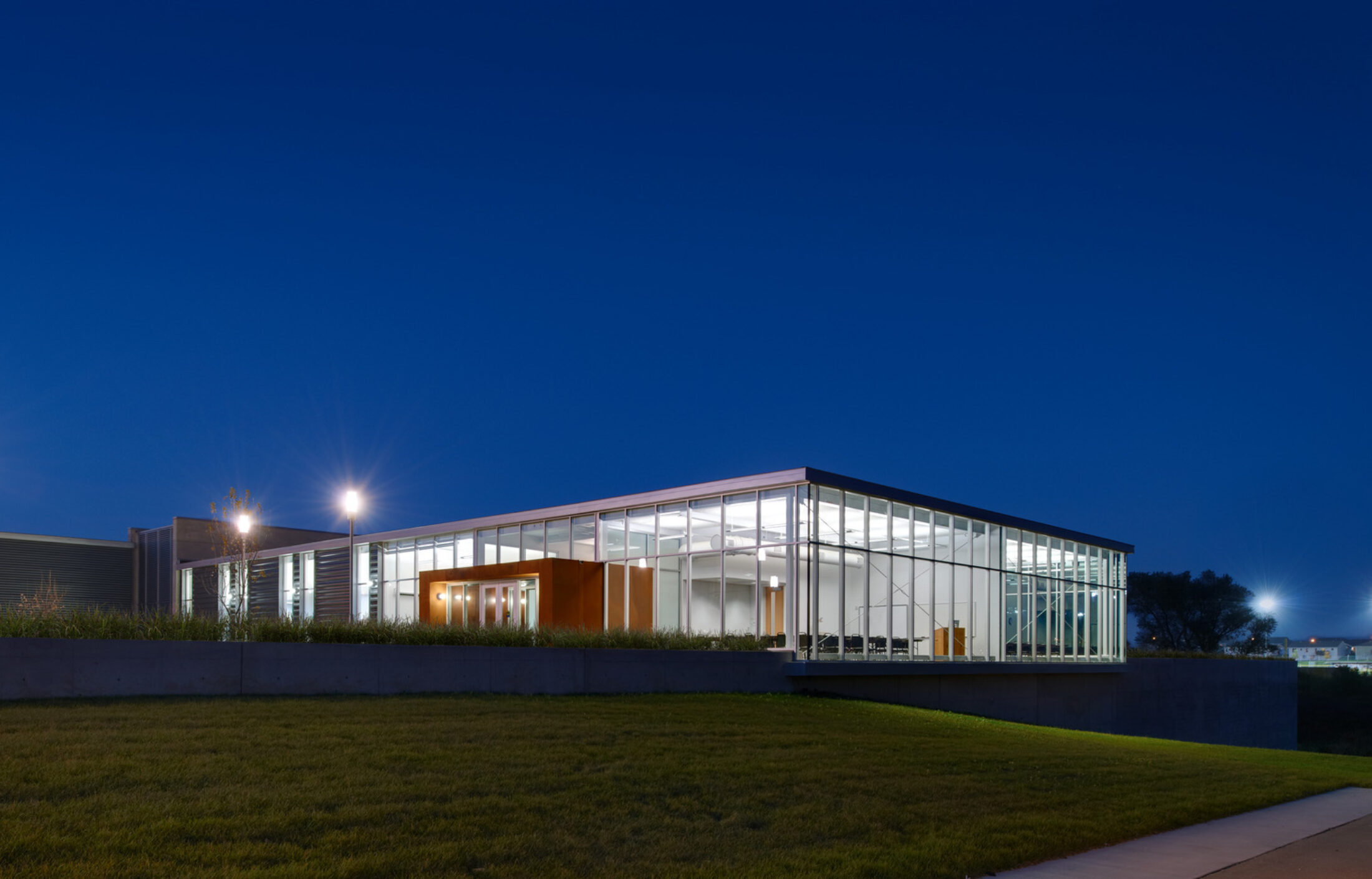 The “clean” student lounge, staff offices, and classrooms overlook an Outdoor Learning Lab. The building’s design featured distinctive lighting combined with translucent materials, creating a glowing-lantern effect in the evening. INVISION’s design mixed industrial materials and exposed structure with careful detailing that serves as a teaching tool for students.