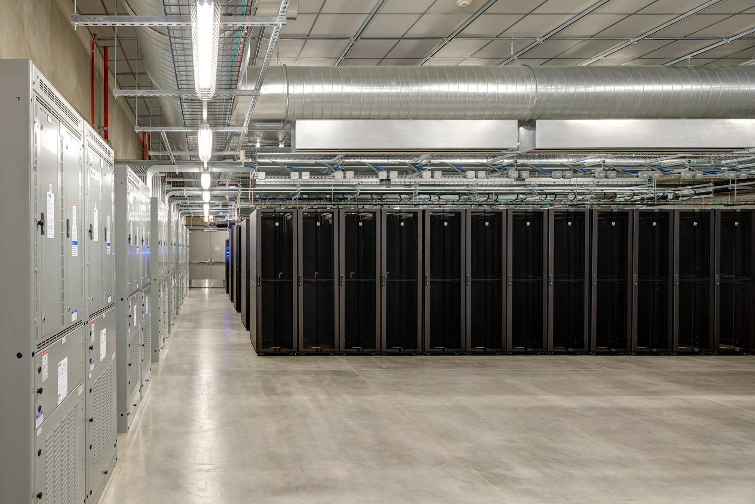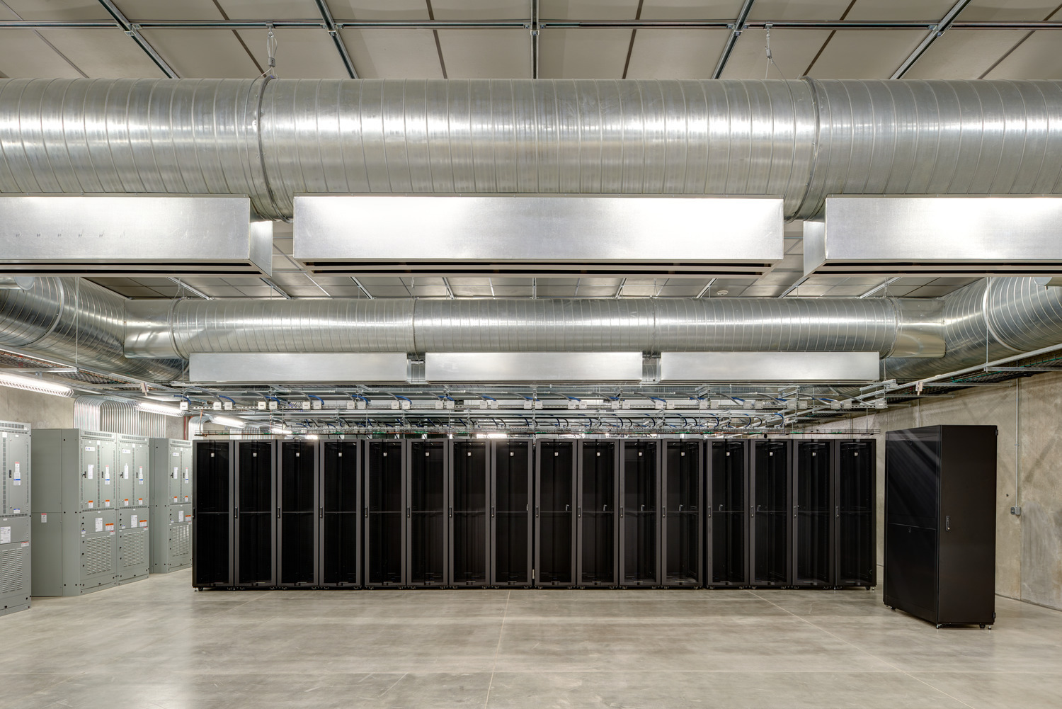 Areas around the perimeter of the building double as functional storage and added security, creating a buffer between the data rooms and exterior walls. The site allows for expansion and the building was designed to accommodate multiple additions. The long-term plan includes the possibility of the data center expanding up to five times its current size.