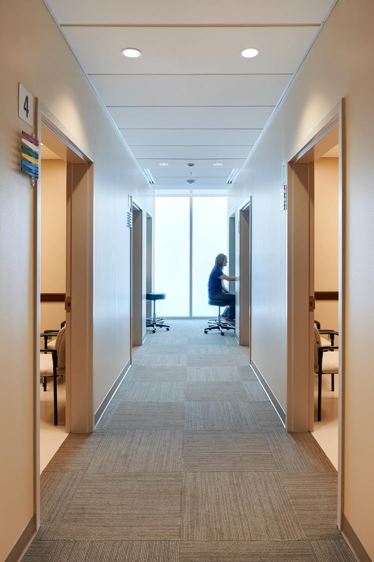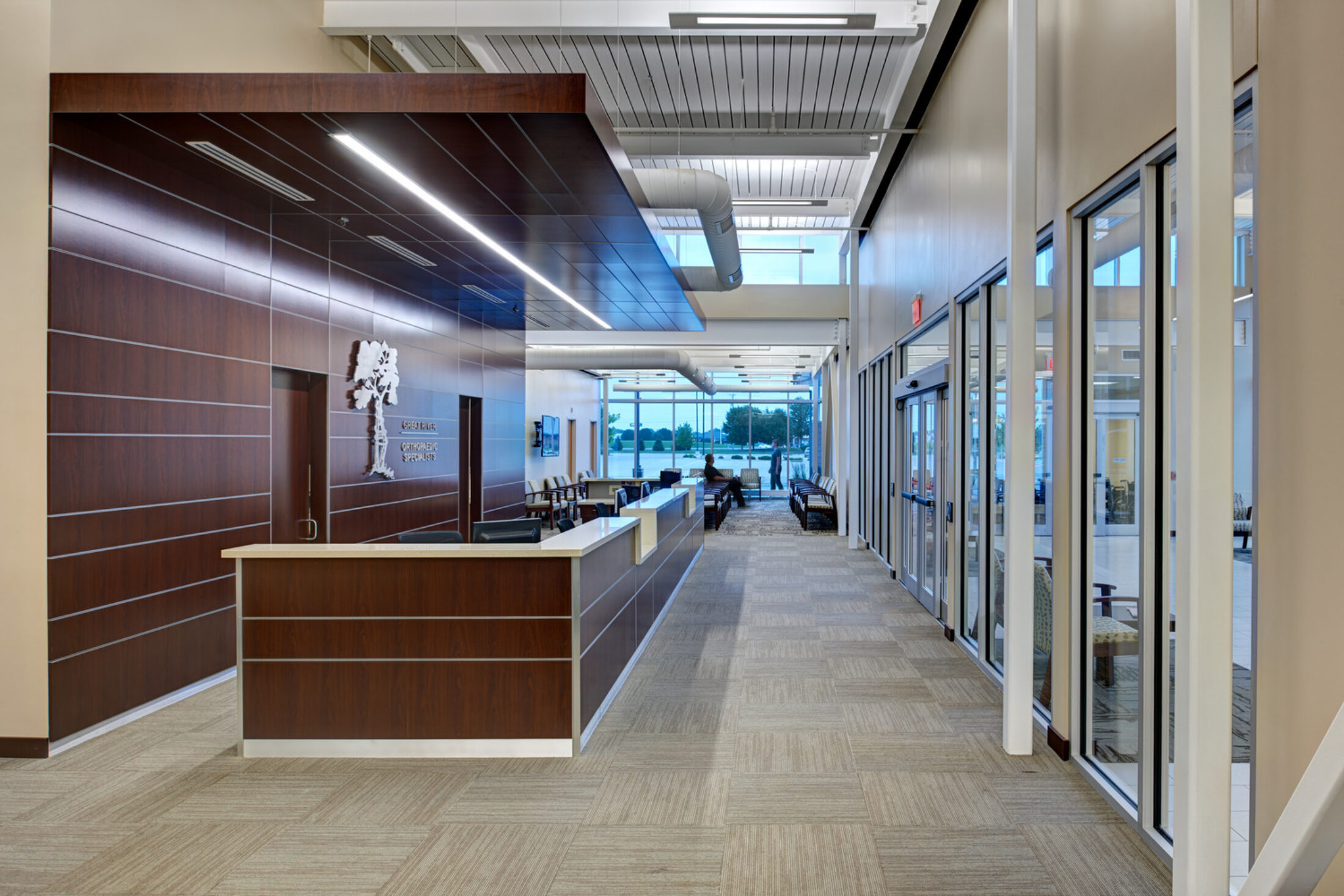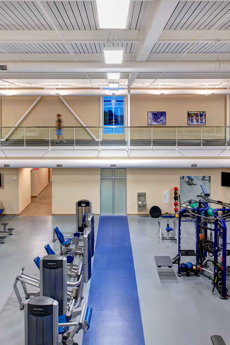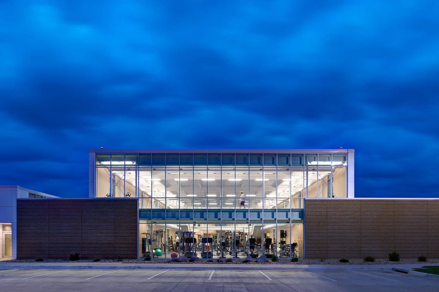 A large entry volume and canopy created an inviting new entrance for guests. The design incorporated multiple window types to create an open environment with plenty of light. Translucent glazing at the end of each corridor allows for natural daylight without impinging on patient privacy. A continuous clerestory window down the clinic’s core allows for daylight harvesting that also assists with patient wayfinding. In the fitness gym, the design team used expansive glazing for even more natural light, as well as clear views from the exterior into the dynamic, two-story space at night. Despite a challenging site, the team created new and relocated space for this client’s first-rate Center for Excellence.