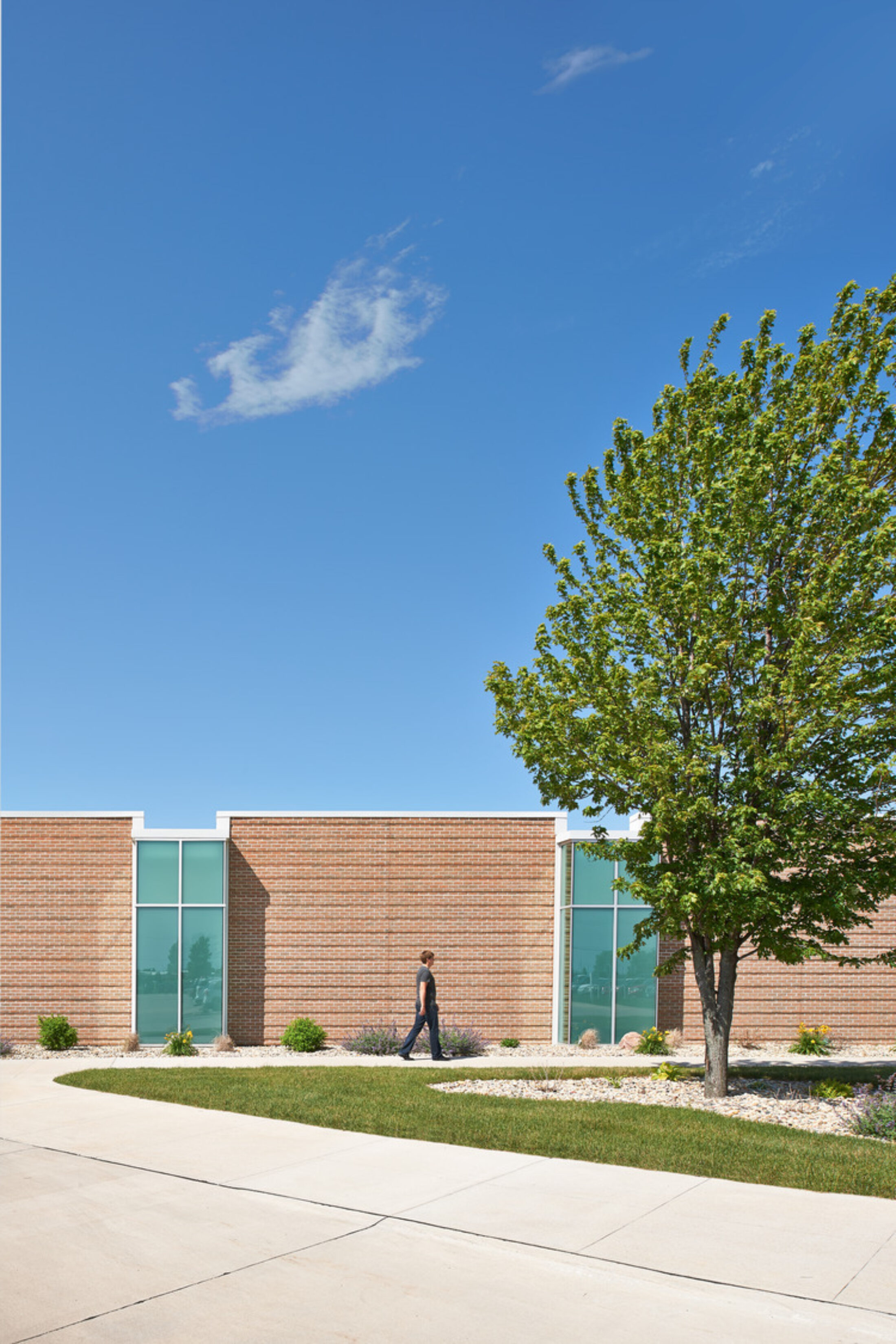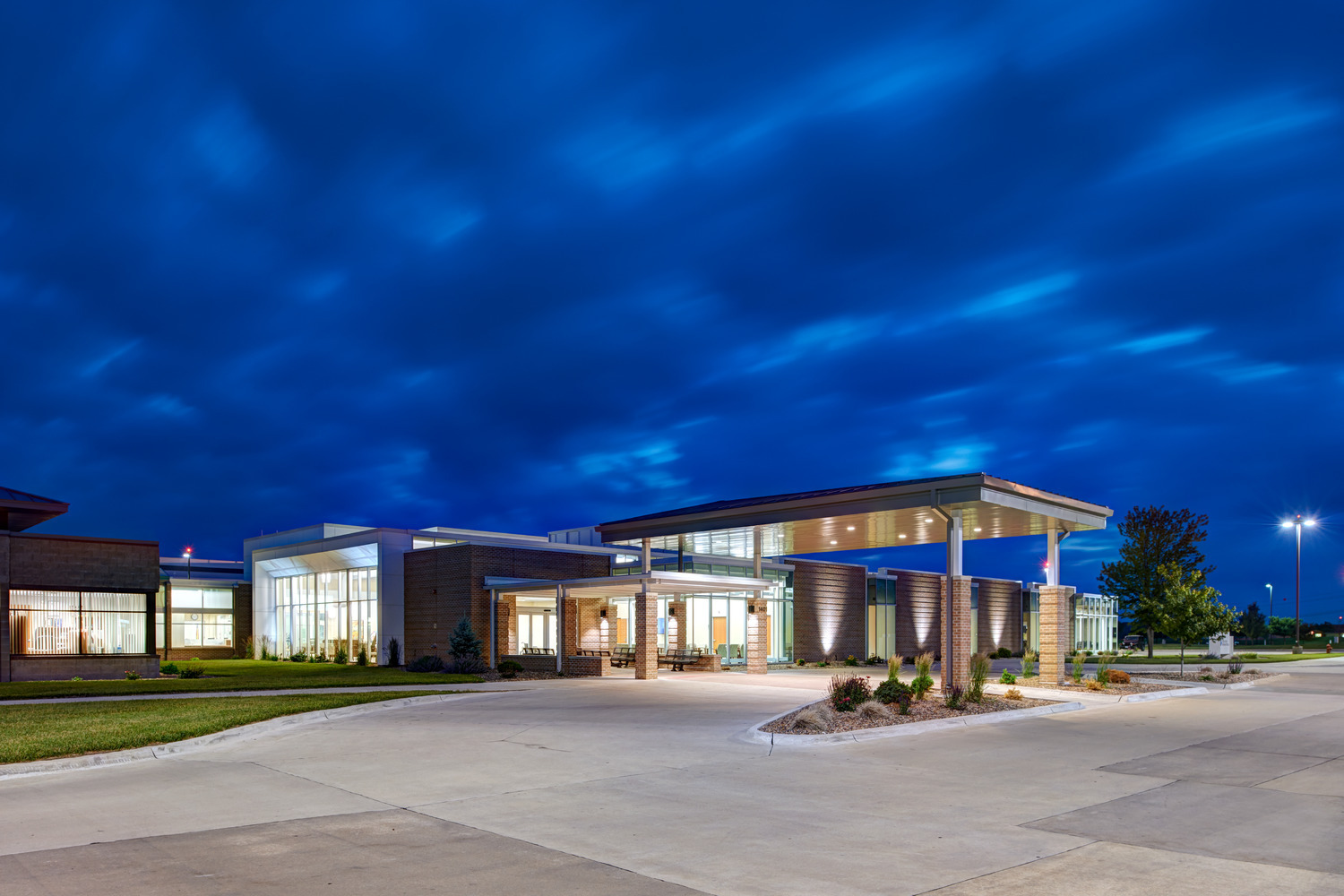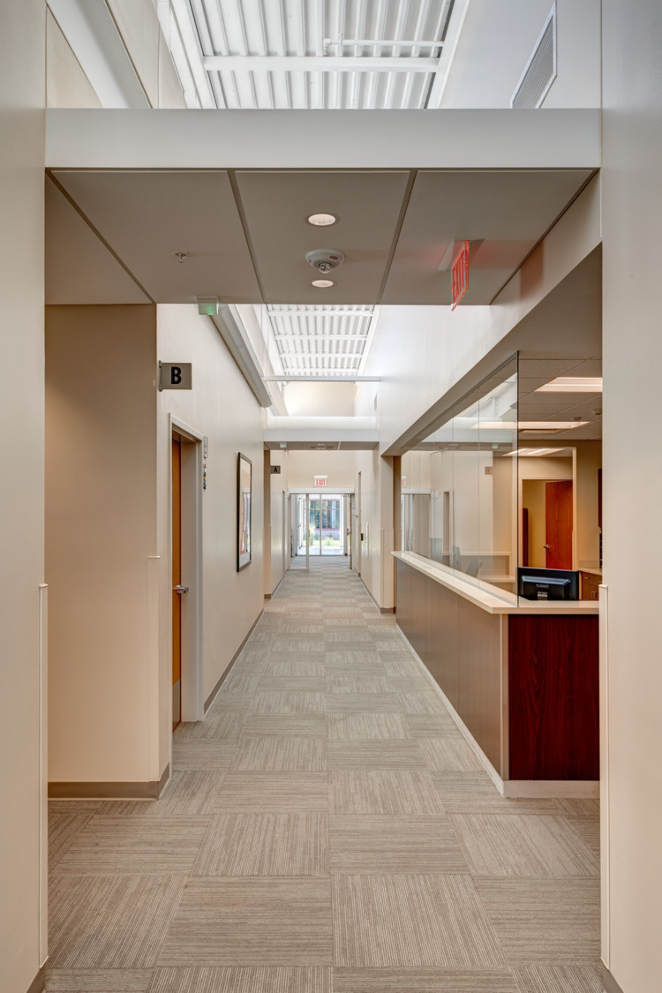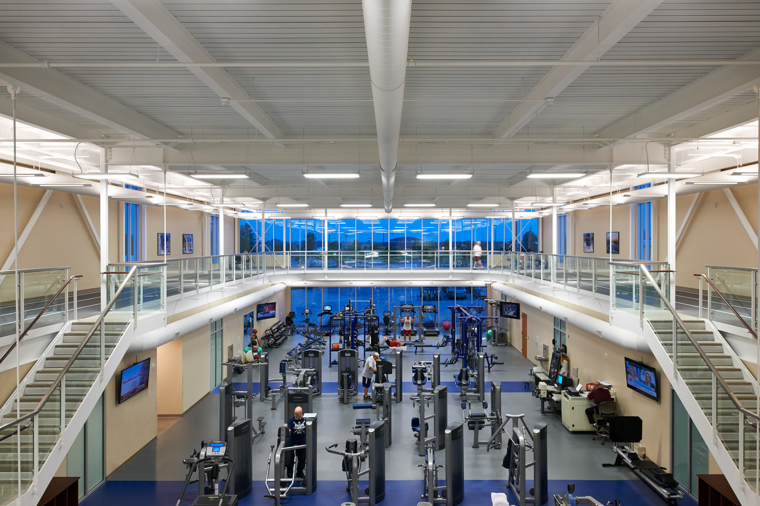 A large entry volume and canopy created an inviting new entrance for guests. The design incorporated multiple window types to create an open environment with plenty of light. Translucent glazing at the end of each corridor allows for natural daylight without impinging on patient privacy. A continuous clerestory window down the clinic’s core allows for daylight harvesting that also assists with patient wayfinding. In the fitness gym, the design team used expansive glazing for even more natural light, as well as clear views from the exterior into the dynamic, two-story space at night. Despite a challenging site, the team created new and relocated space for this client’s first-rate Center for Excellence.