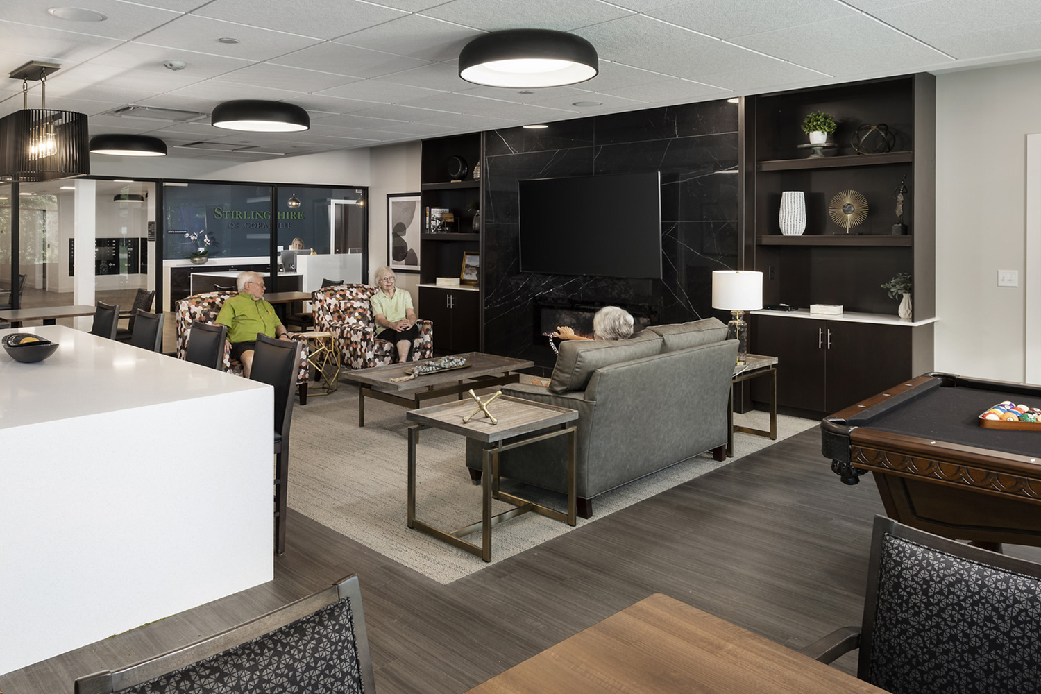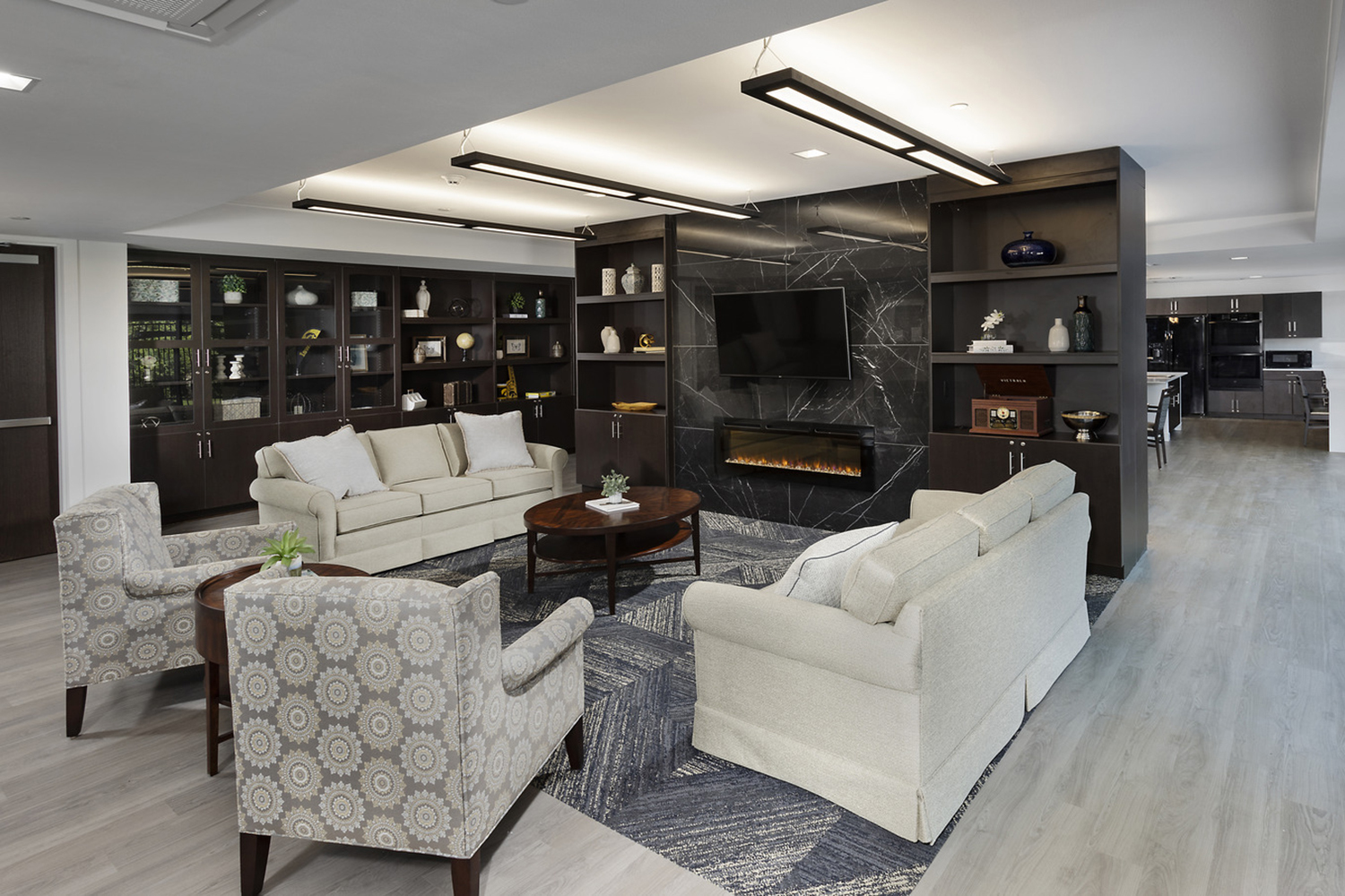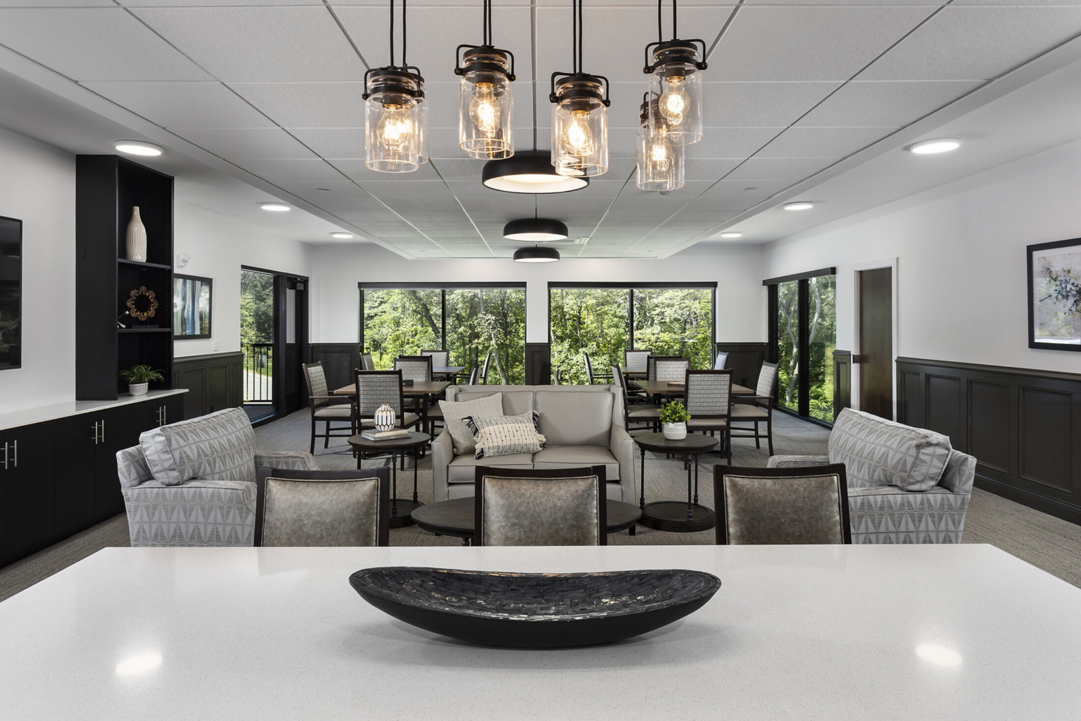 A wooded setting creates the backdrop for this new 104,000sf senior living community with 20 memory care and 56 assisted living units. To achieve the client’s objectives, the design team focused on the effective balance of multiple aspects: grand scale with an intimate feel, appeal for residents and their families, and effective use of space while respecting the existing site.