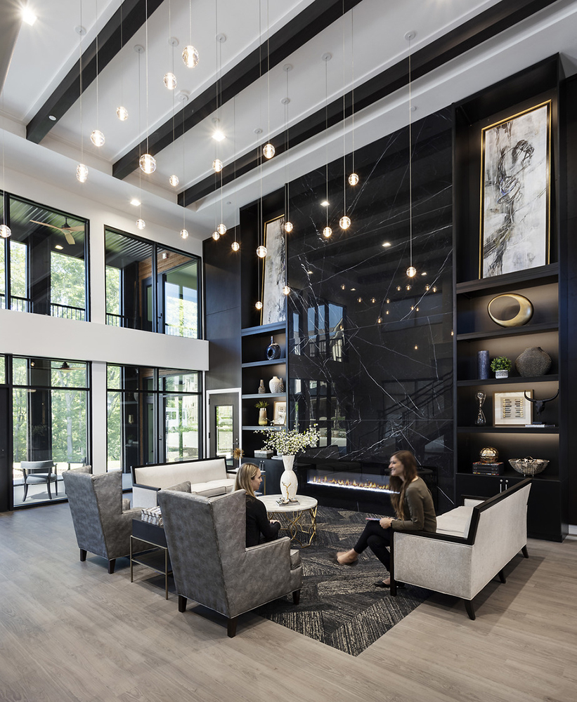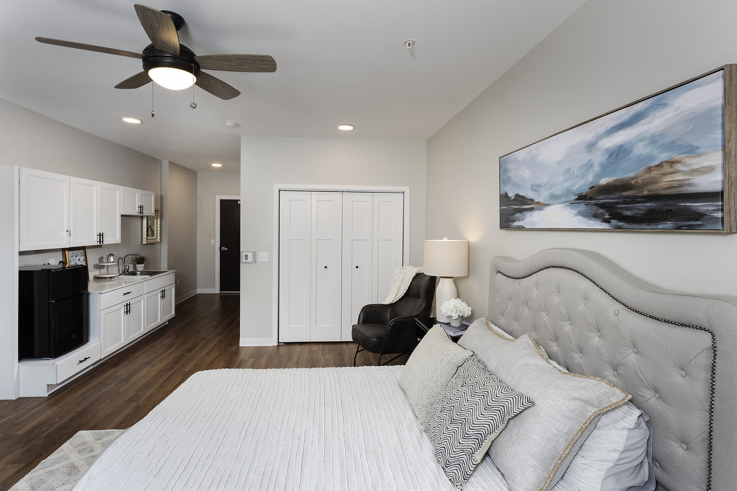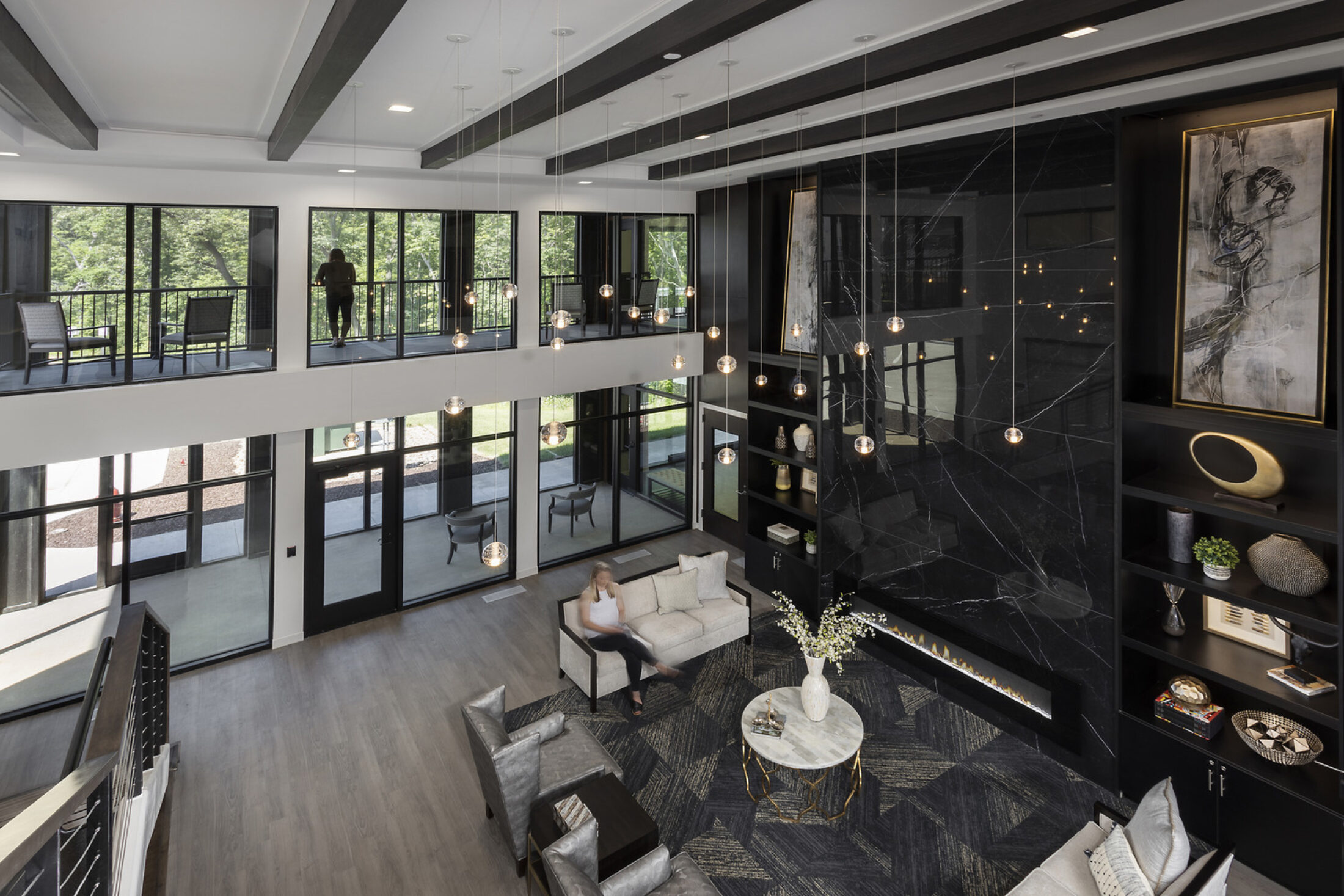 A wooded setting creates the backdrop for this new 104,000sf senior living community with 20 memory care and 56 assisted living units. To achieve the client’s objectives, the design team focused on the effective balance of multiple aspects: grand scale with an intimate feel, appeal for residents and their families, and effective use of space while respecting the existing site.