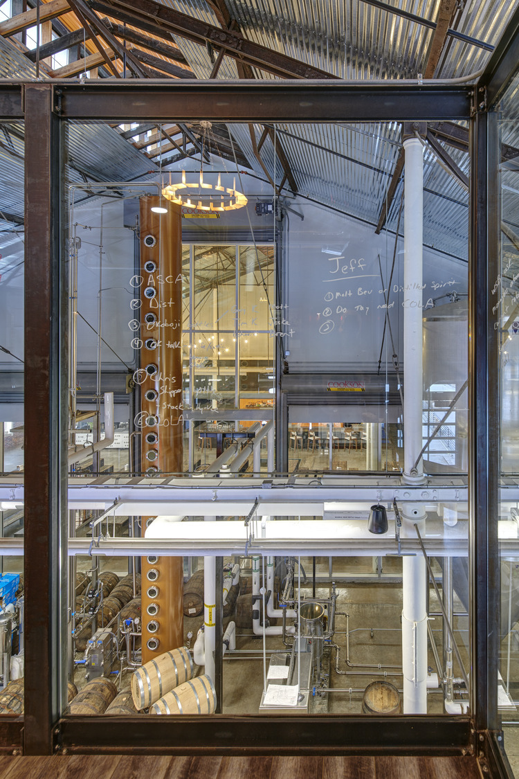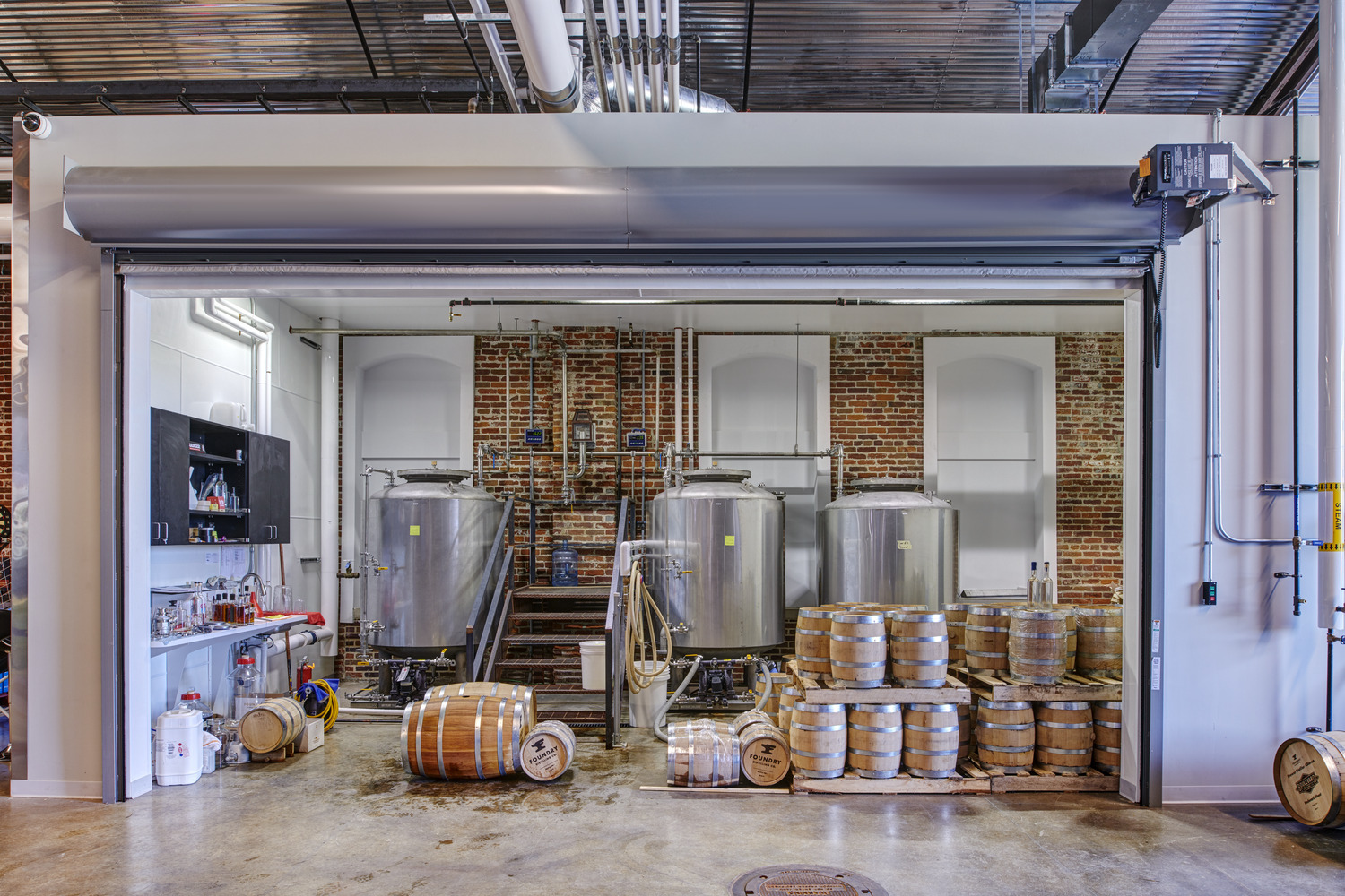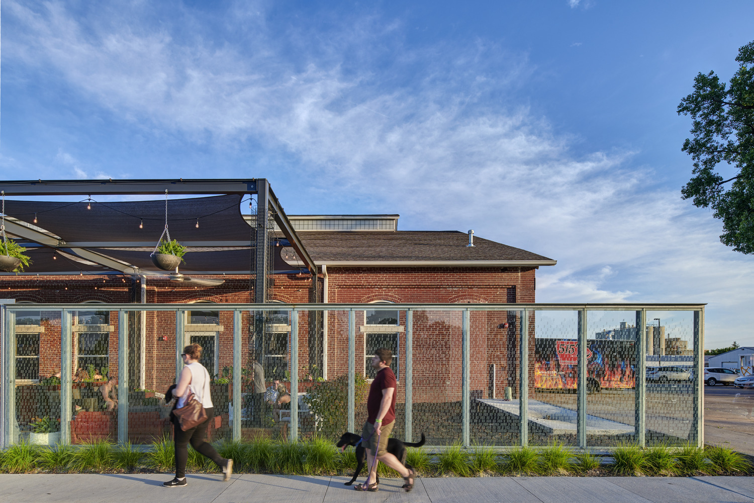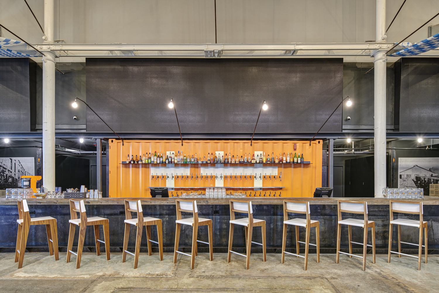 Historic elements were touched as lightly as possible, while new elements of glass, raw steel, and reclaimed wood from boxcar floors were inserted. A shipping container was even repurposed into the beer cooler behind the bar. Visually, all three tenants’ spaces were united through common detailing and an industrial aesthetic.