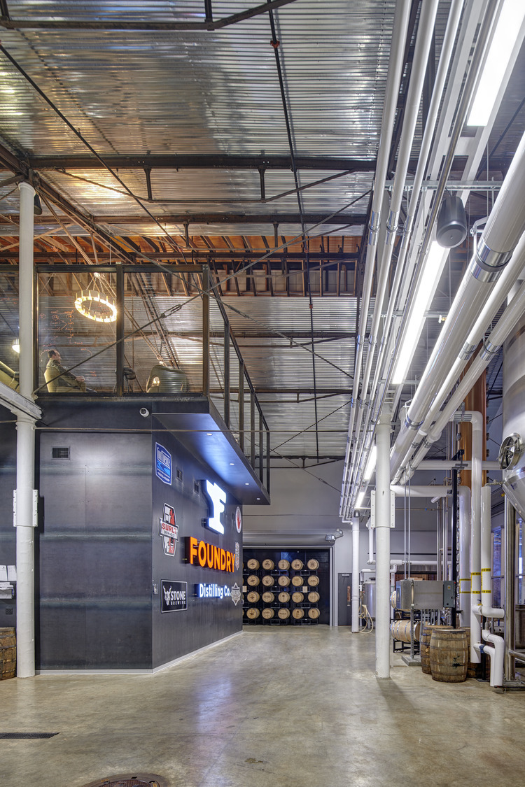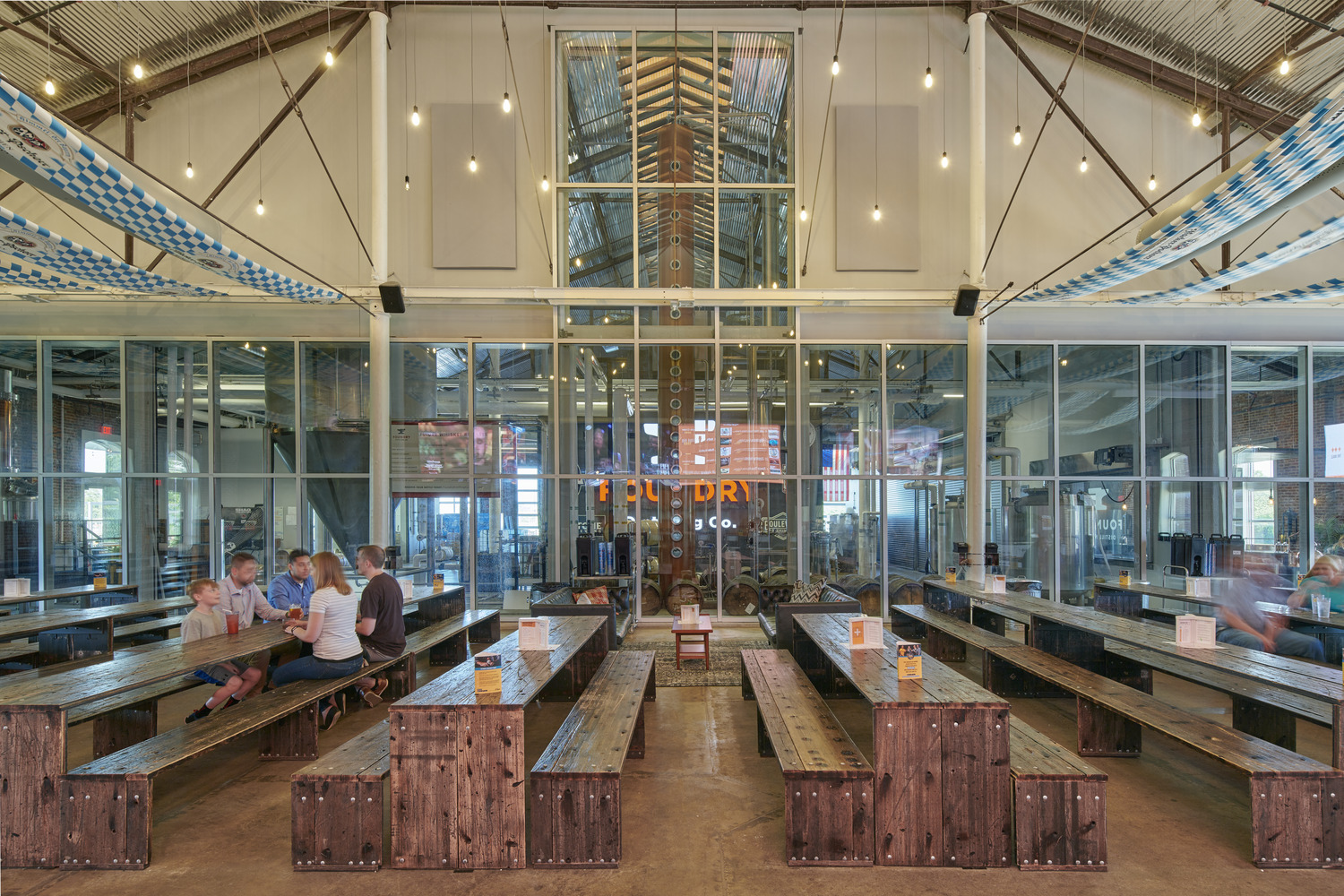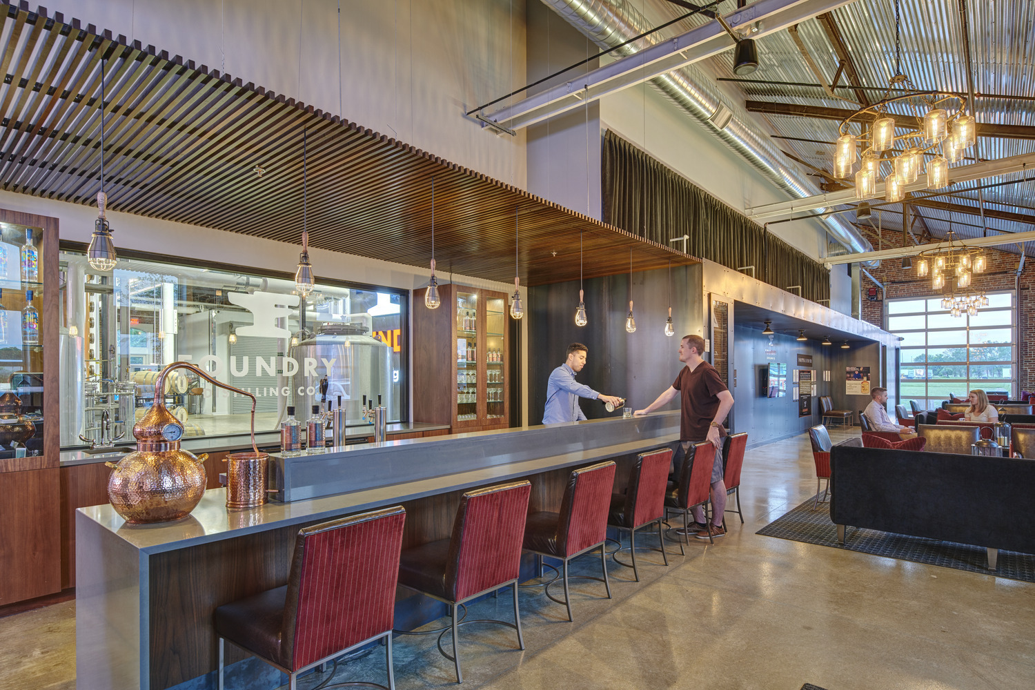 The Foundry’s tenants, while each a separate business, are intended to work together toward a singular experience. The distillery partners with local and regional micro-brewers and features a large viewing window into the Hall. The Hall serves as the public heart of the development with its open bench seating and outdoor patio. The Kitchen serves rotating food truck fare in the Hall, provides a home base for the trucks, and offers a job training program for homeless youth.