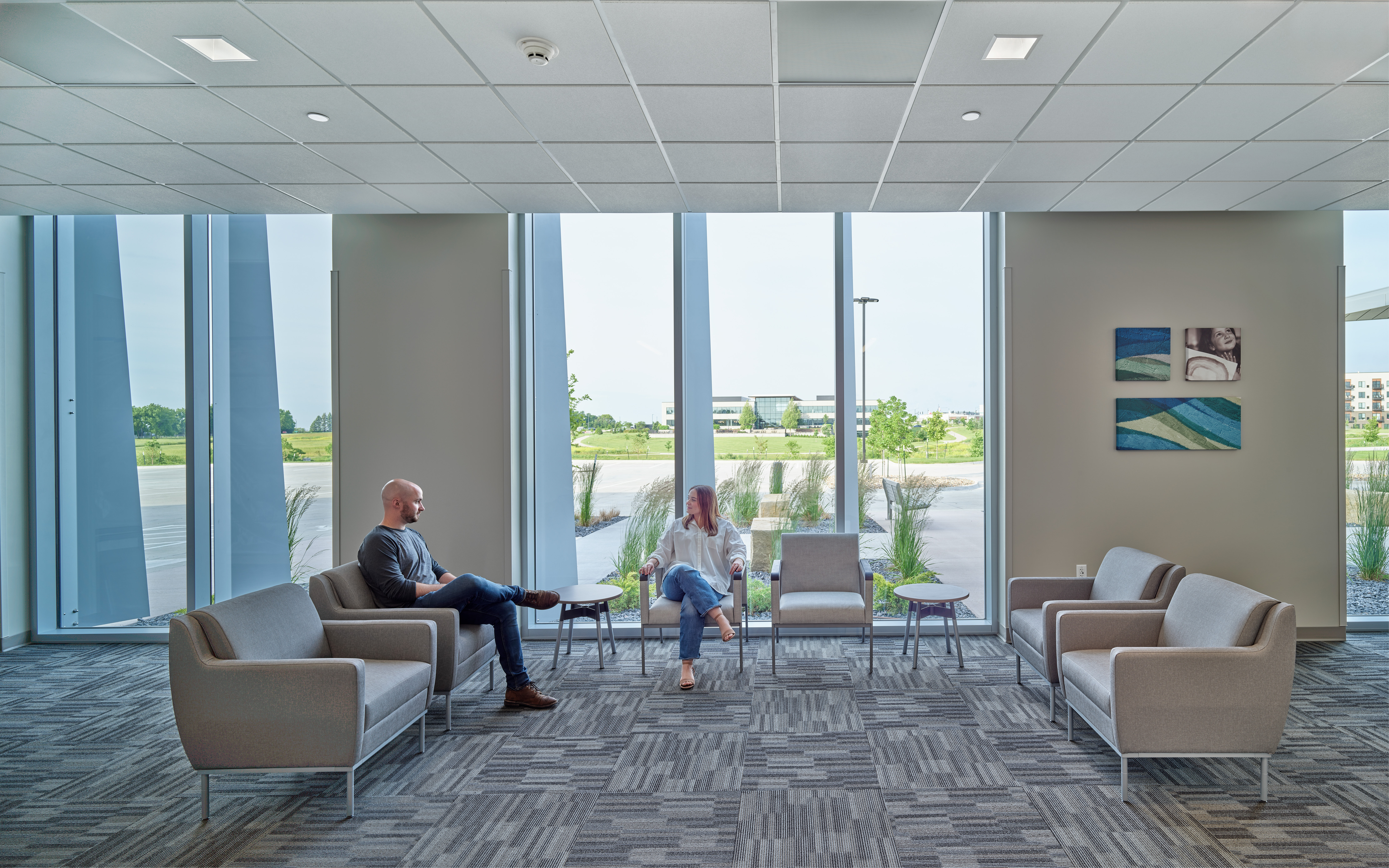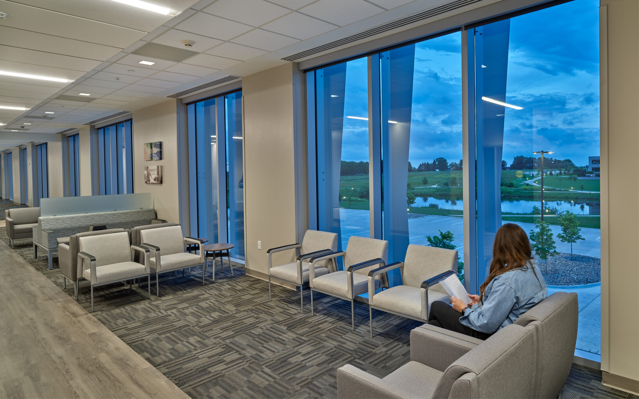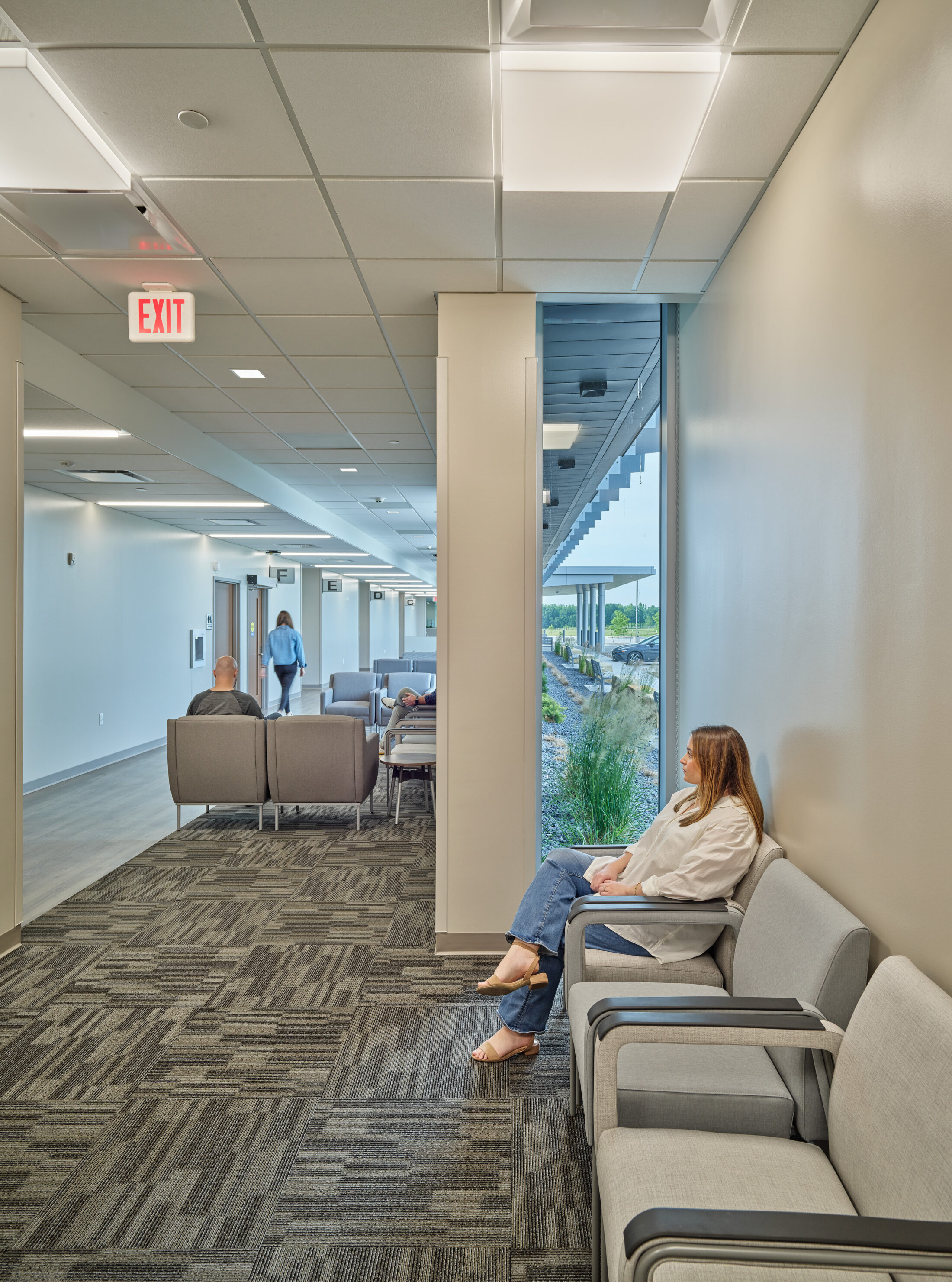 The site design thoughtfully integrates pathways connecting the detention ponds to an outdoor plaza, providing a refreshing escape for staff and visitors. Floor-to-ceiling windows bring abundant natural light into public areas with scenic views of the ponds, while exterior metal fins reduce glare for comfort. Inside, hallways ending in windows serve as wayfinding tools and bring light into staff spaces. Multiple reception points streamline navigation, and walls in clinical areas are designed to optimize acoustics, ensure privacy, and minimize sound transfer for a quieter, more comfortable environment.
