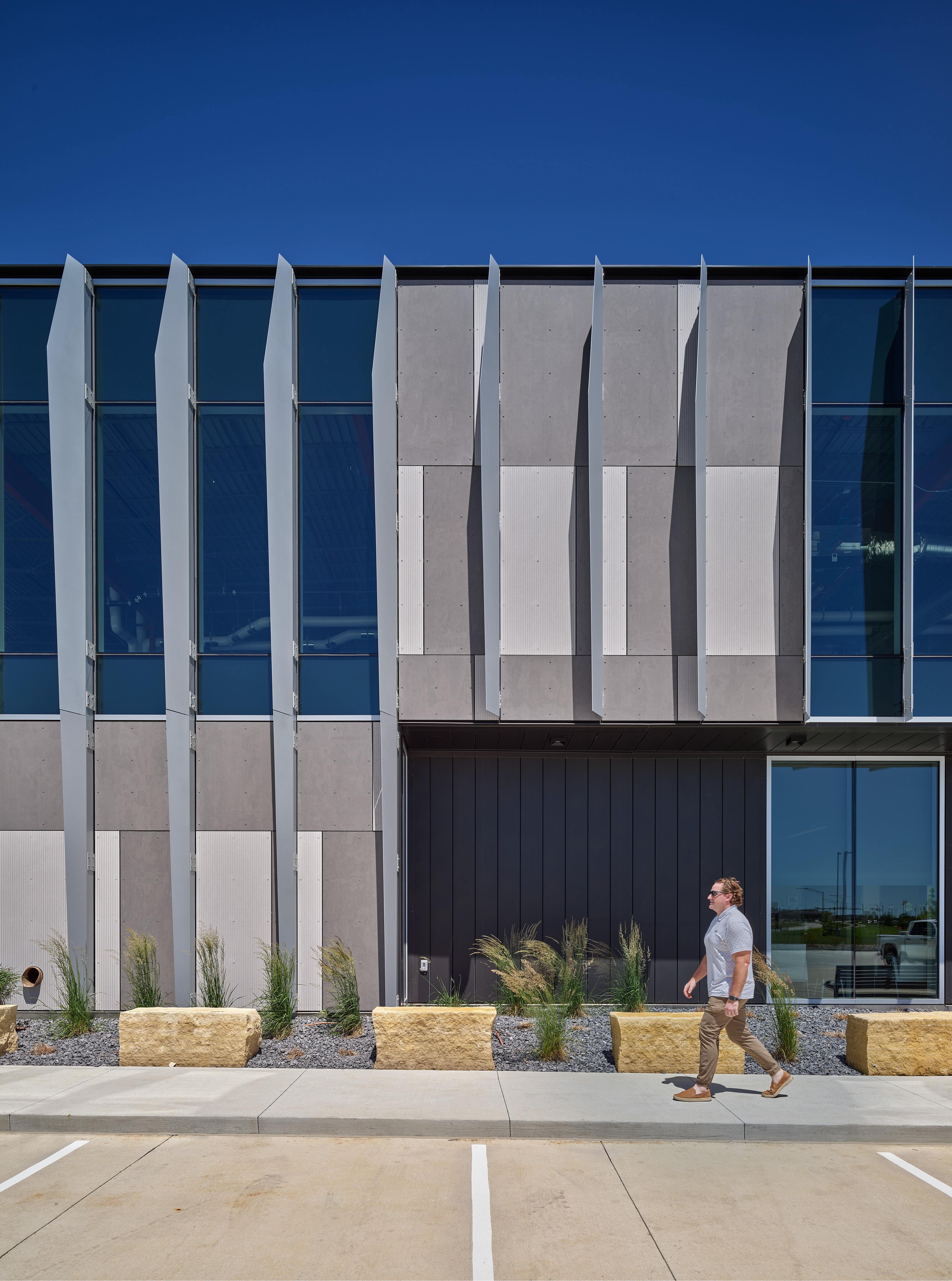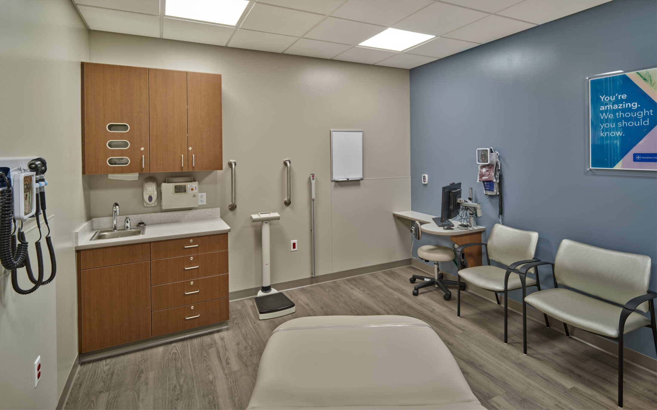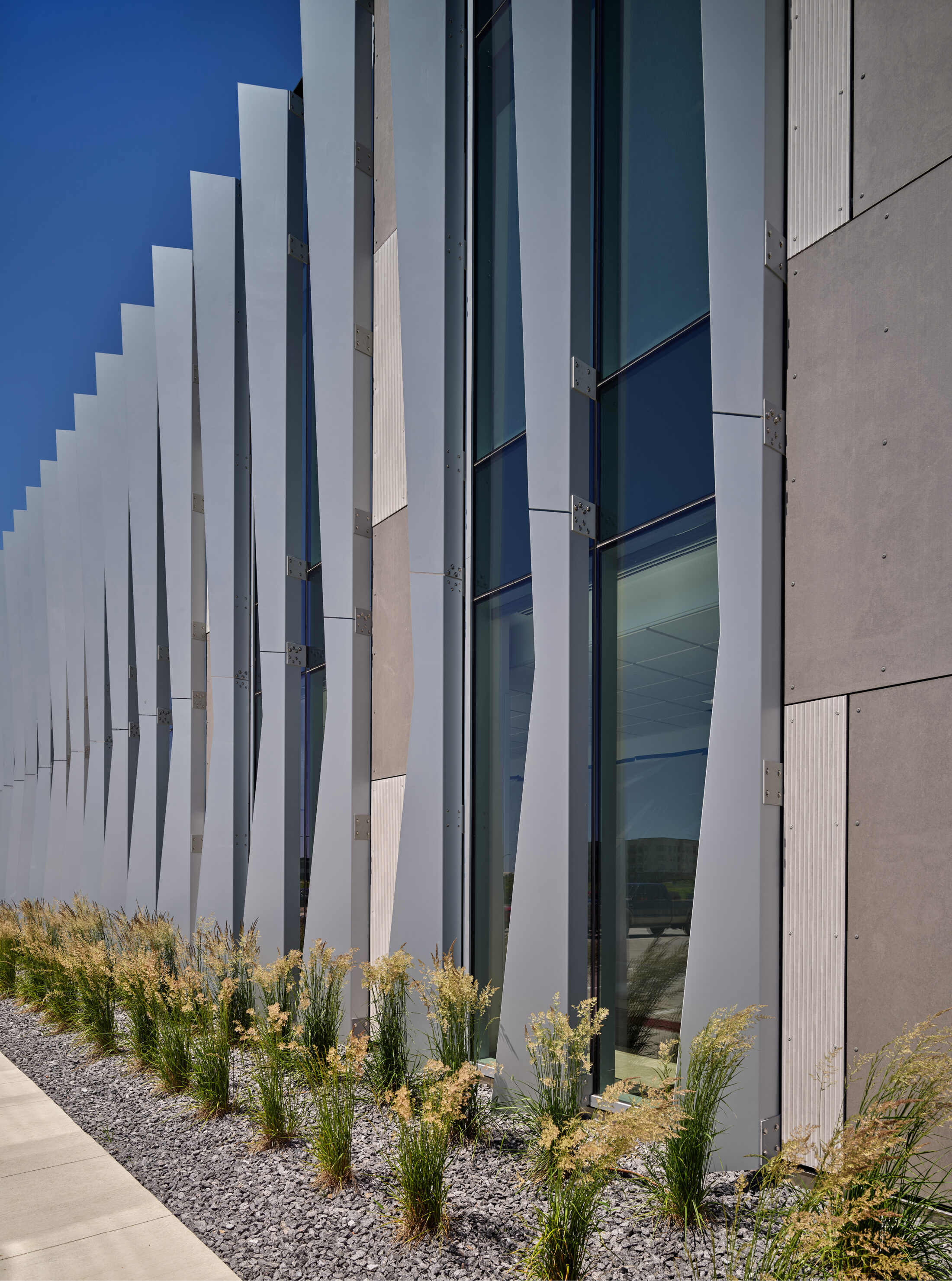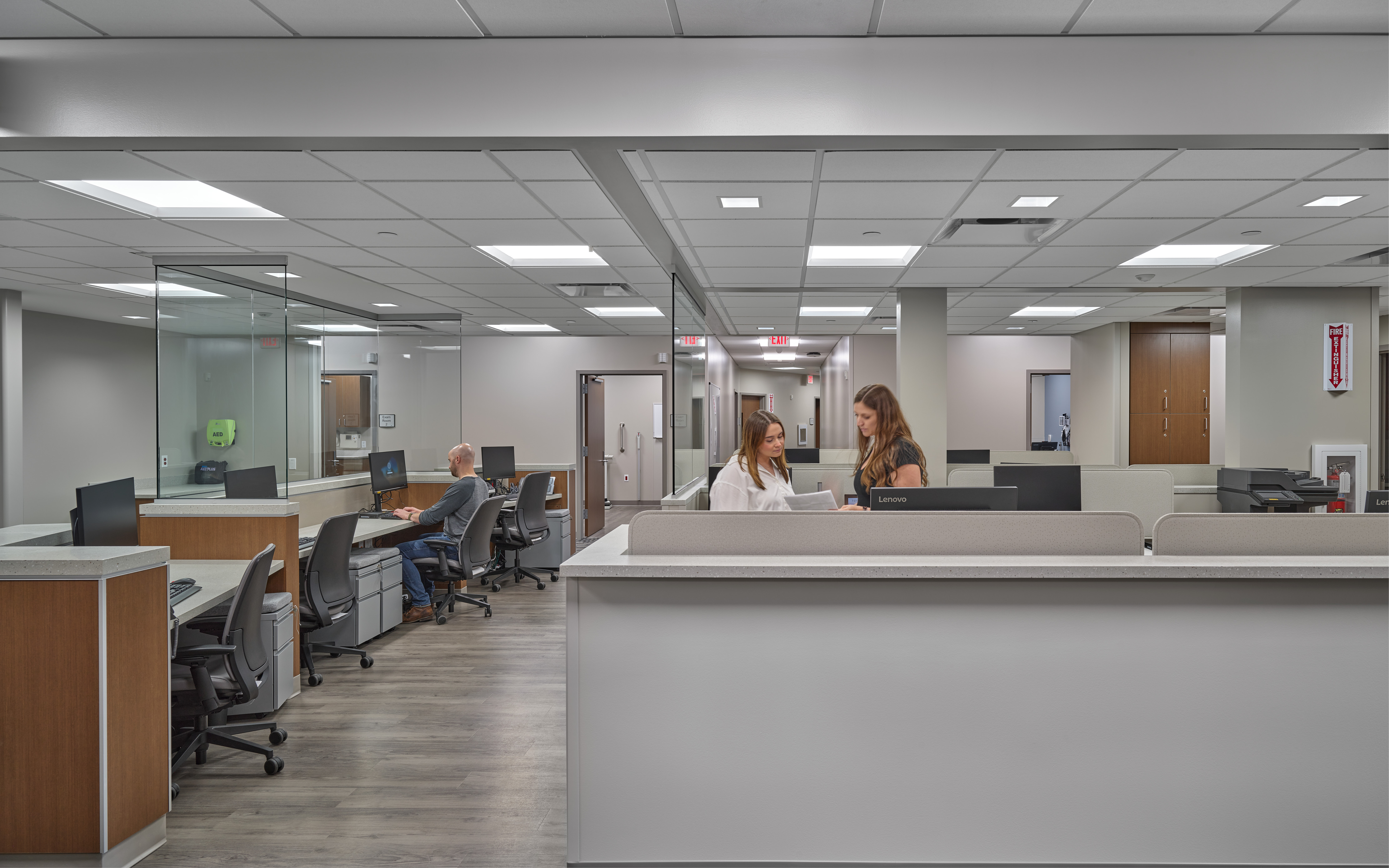 The site design thoughtfully integrates pathways connecting the detention ponds to an outdoor plaza, providing a refreshing escape for staff and visitors. Floor-to-ceiling windows bring abundant natural light into public areas with scenic views of the ponds, while exterior metal fins reduce glare for comfort. Inside, hallways ending in windows serve as wayfinding tools and bring light into staff spaces. Multiple reception points streamline navigation, and walls in clinical areas are designed to optimize acoustics, ensure privacy, and minimize sound transfer for a quieter, more comfortable environment.